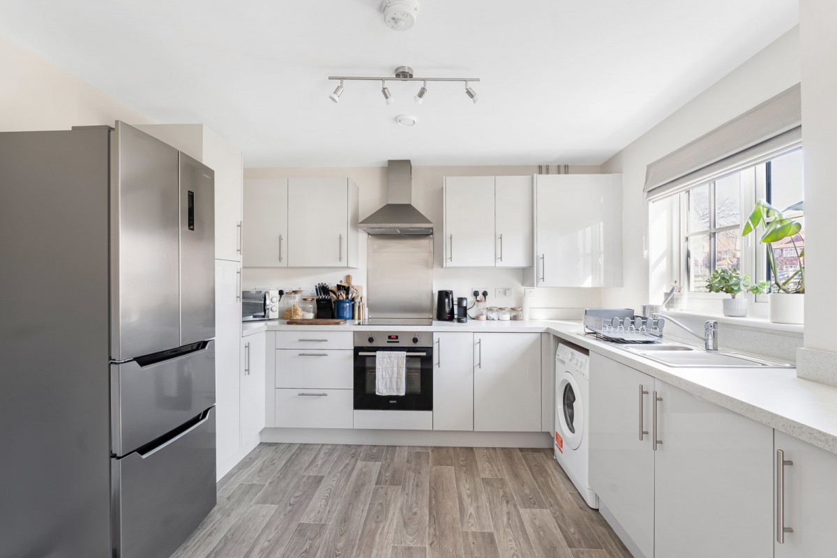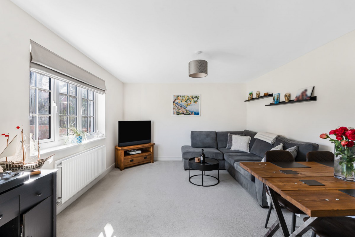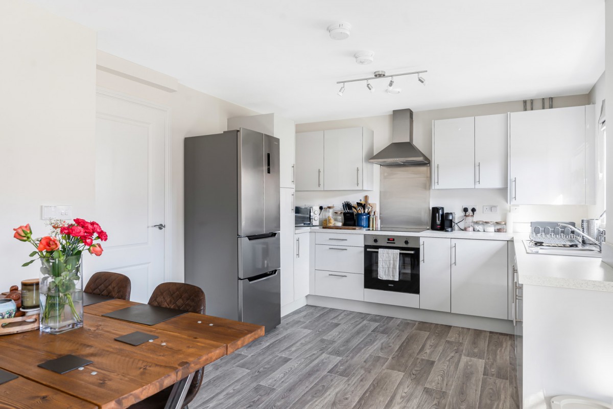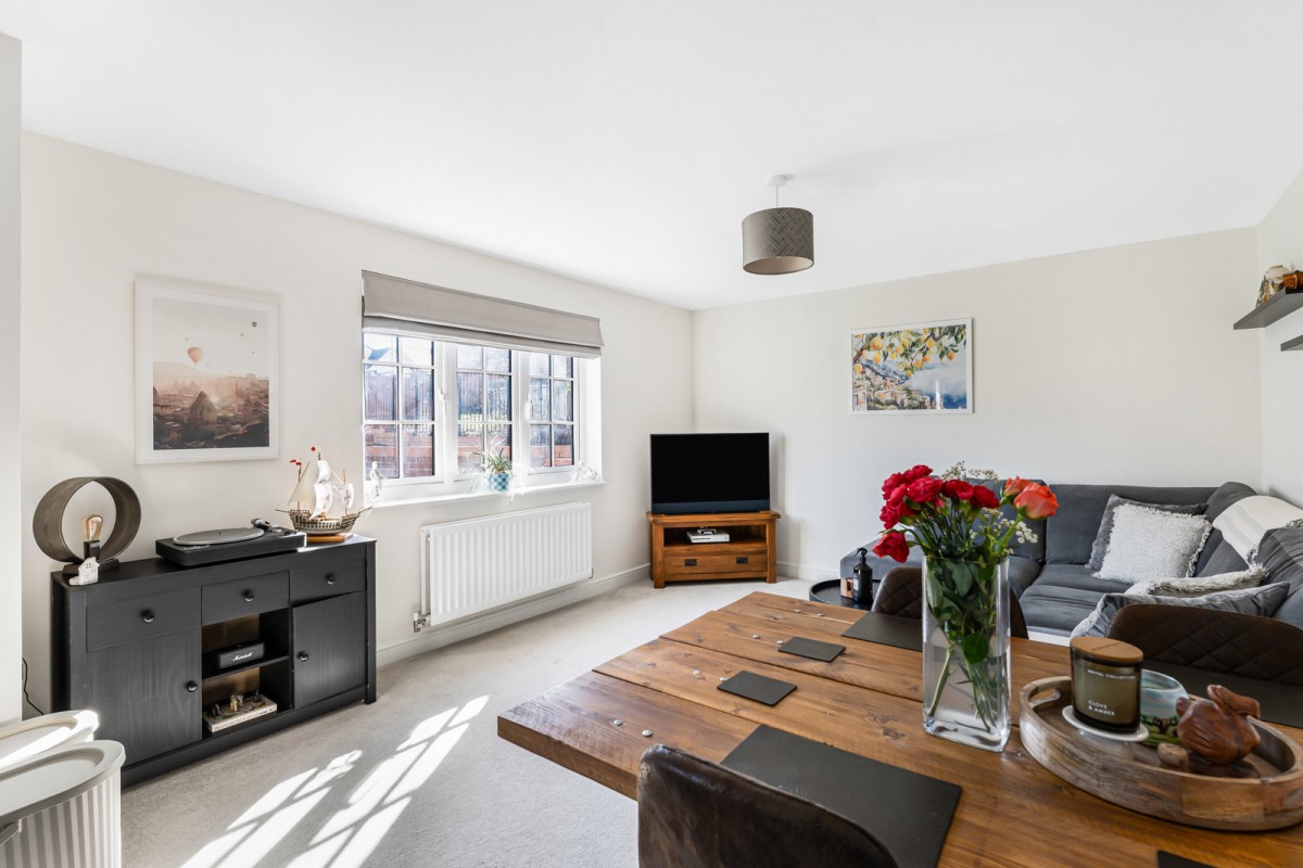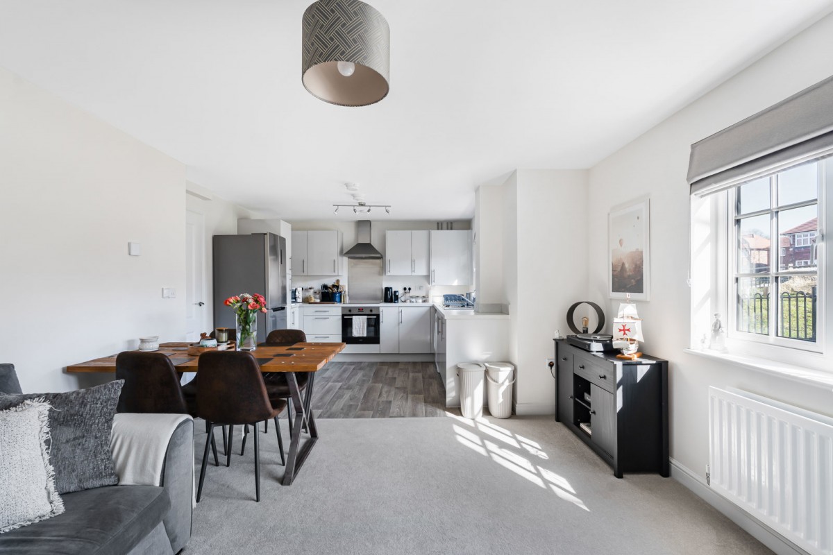 The property features an open plan kitchen and dining area, fitted with white gloss units and offering ample space for appliances. The principal bedroom is an impressive double, while the second bedroom is currently utilised as a useful home office. The accommodation is completed by a modern family bathroom with shower over bath. There is also an allocated parking space.