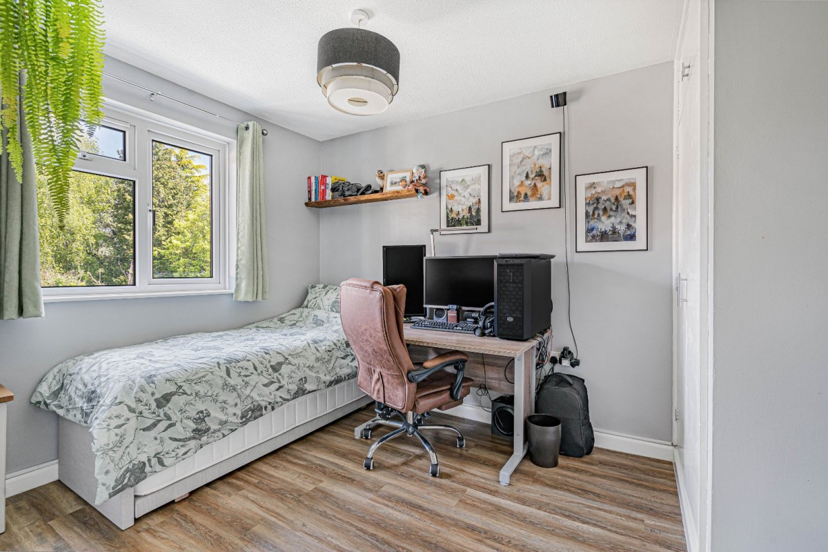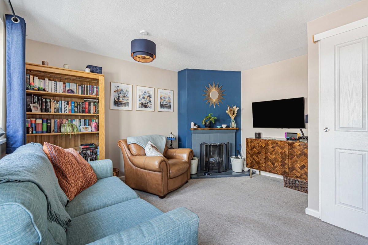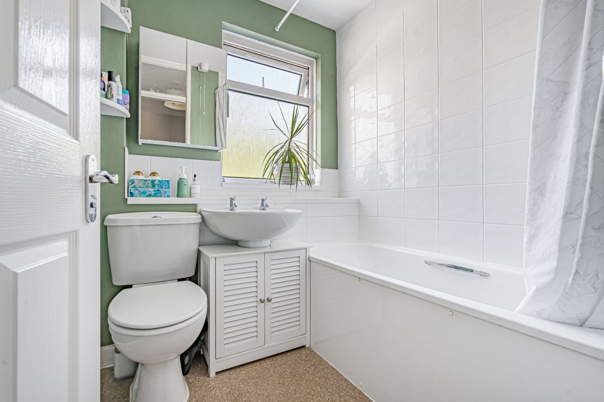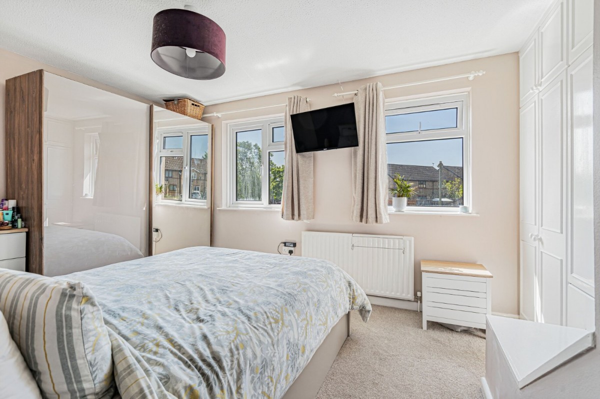 Upstairs, the property offers two generous double bedrooms, with the principal bedroom benefiting from fitted wardrobes to both sides. The bathroom is well-appointed with a bath and electric shower.