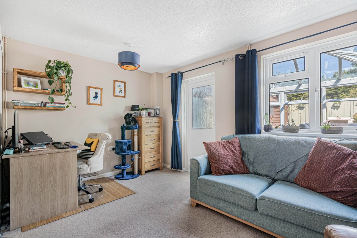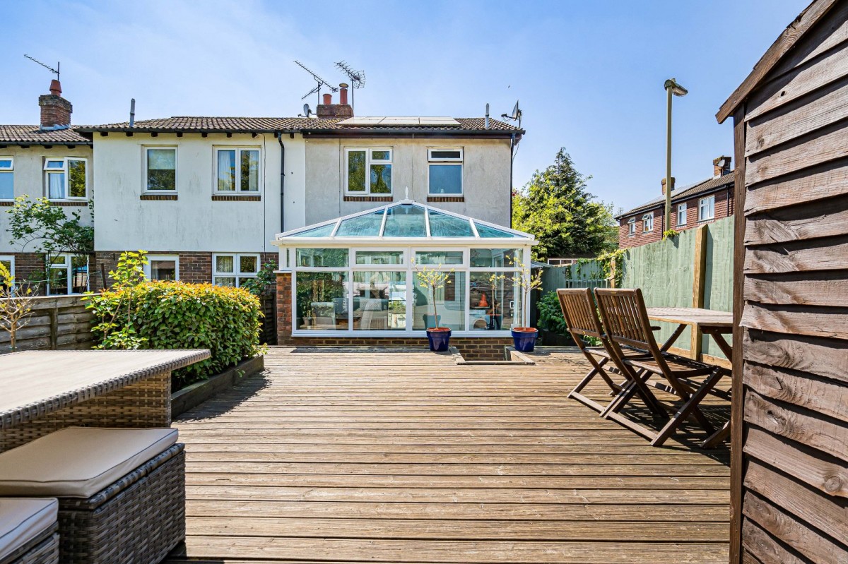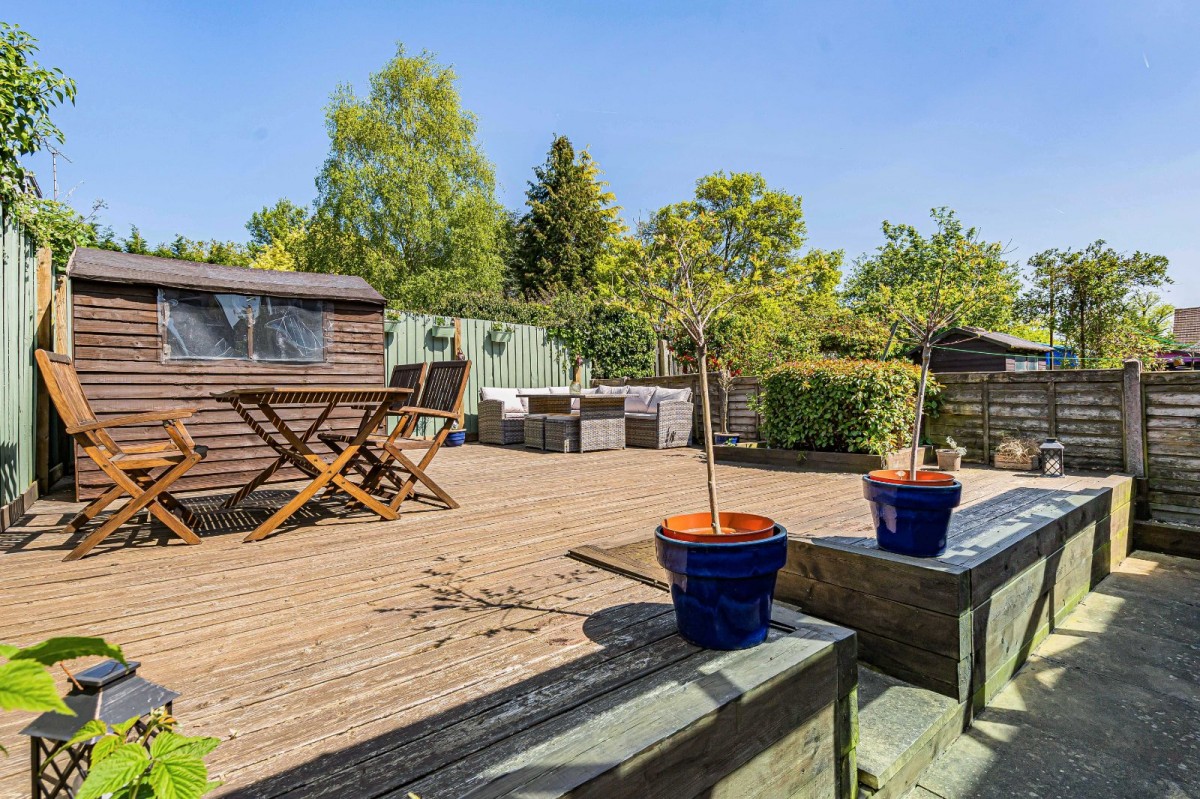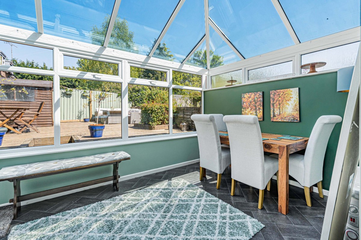 The accommodation begins with a welcoming entrance hallway leading into a bright and comfortable living room, which flows seamlessly through to a stylish, modern kitchen. To the rear, a spacious conservatory provides excellent additional living space, flooded with natural light and offering direct access to the landscaped garden. The garden itself has been designed with entertaining in mind, featuring a decked area ideal for outdoor dining and relaxation.