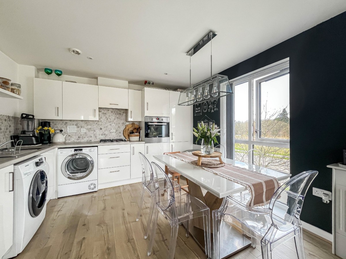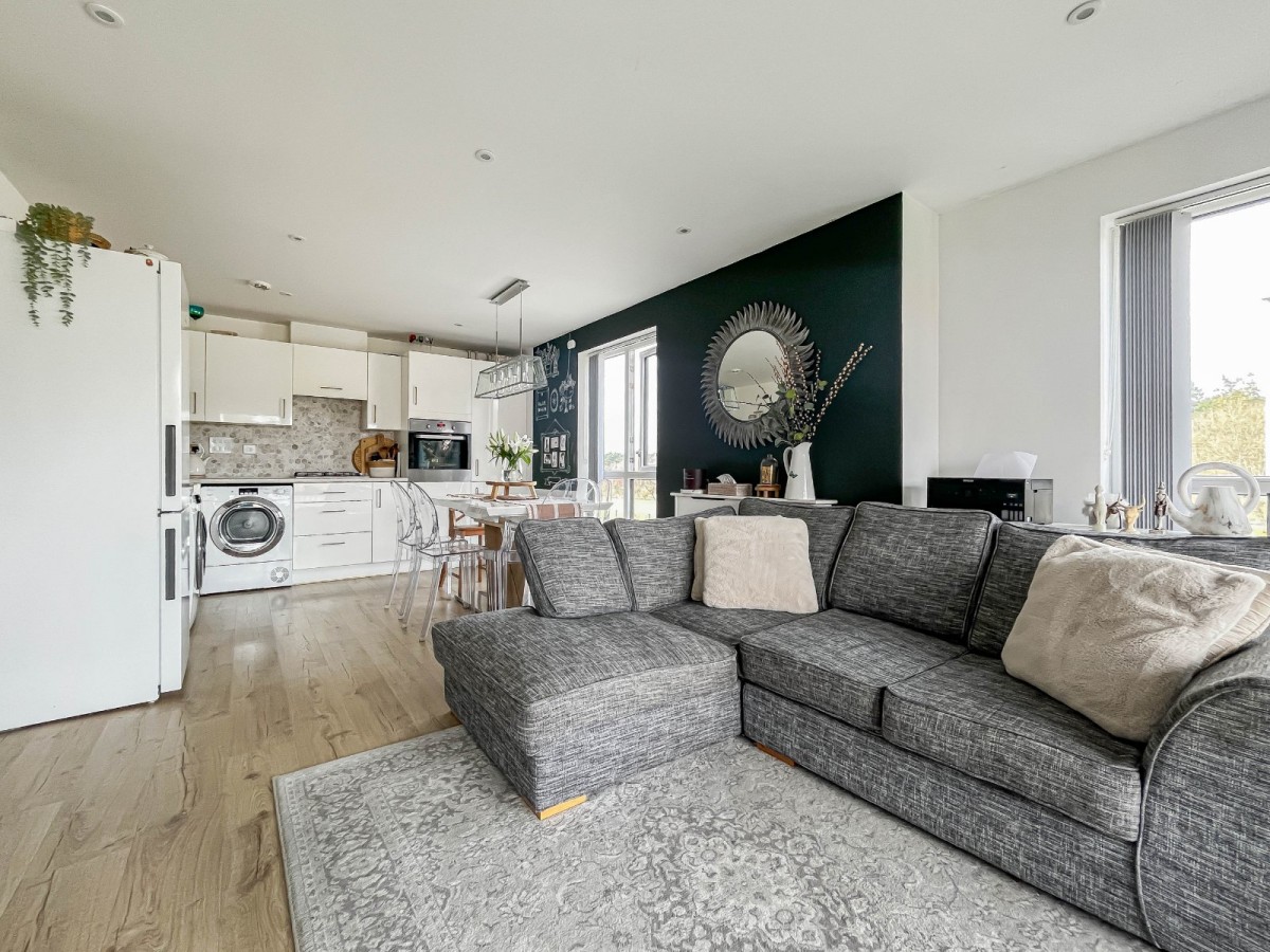Inside, the flat opens into an airy, open-plan living space with twin floor-to-ceiling windows and double doors onto a private balcony. The layout naturally separates the kitchen, dining, and seating areas, making the room easy to use day to day. The kitchen features white cabinetry with good storage, an integrated eye-level oven, a four-burner gas hob, and space for both a washing machine and tumble dryer.