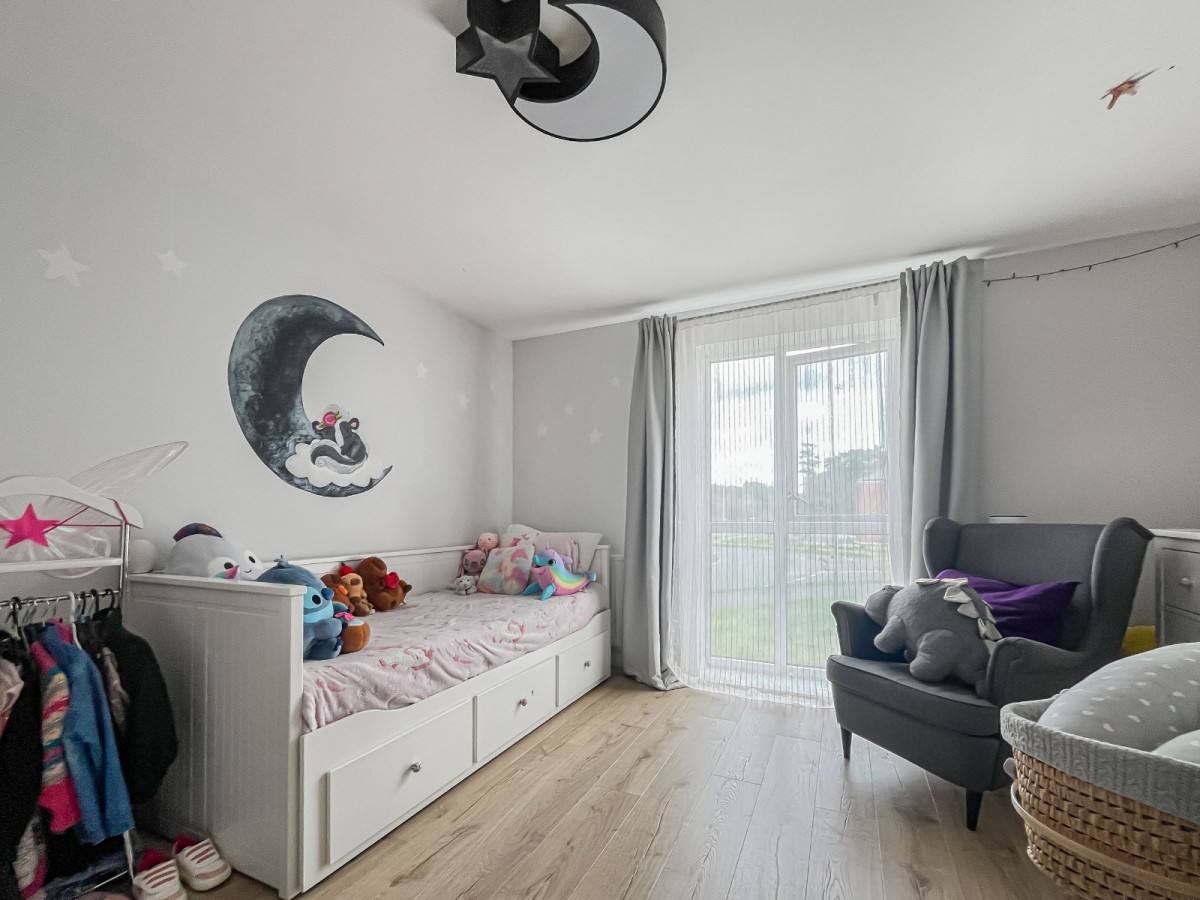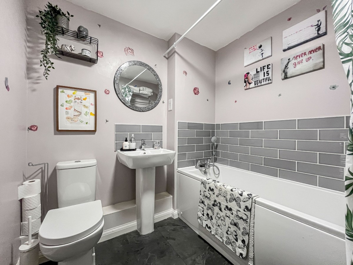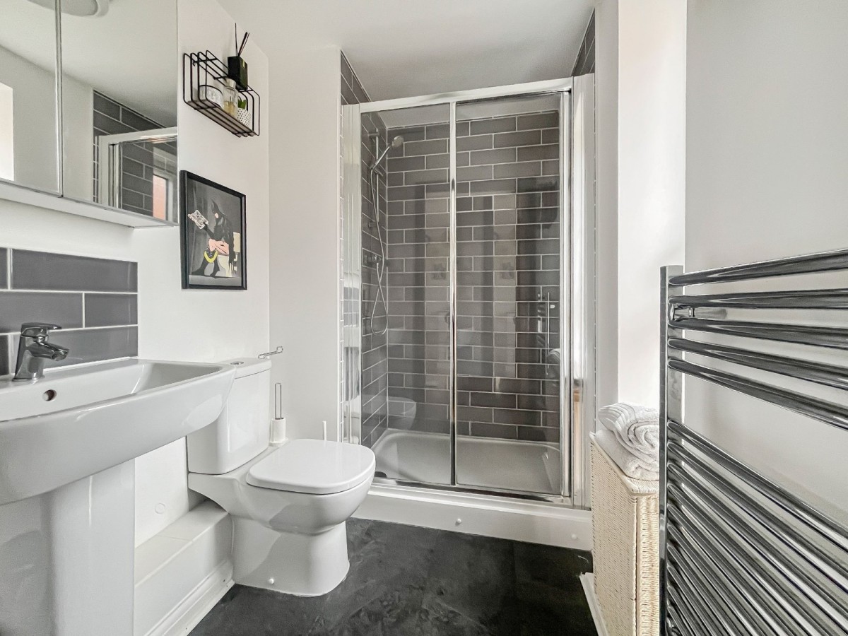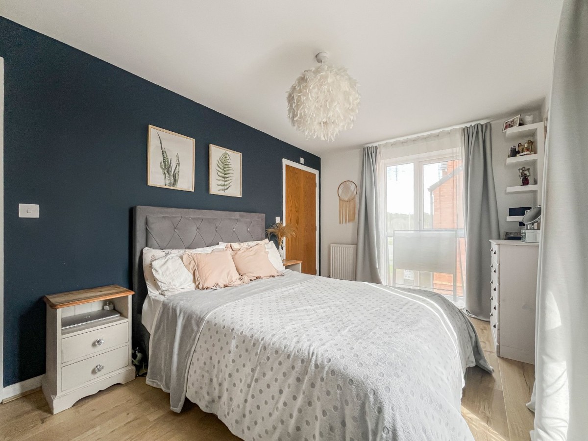 There are two well-proportioned double bedrooms. The main bedroom includes an ensuite with a walk-in shower, and the family bathroom is fitted with a clean, white suite. On the ground floor, a large external store provides useful extra space for storage or hobbies.