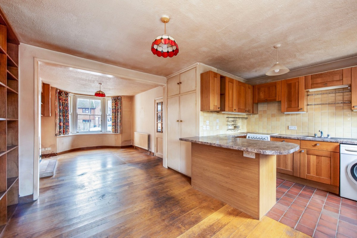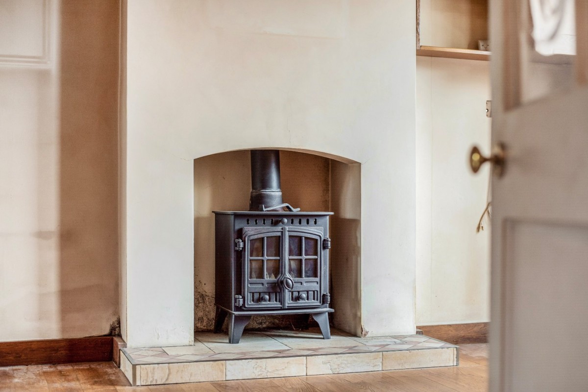 The property is entered via an entrance hallway, which provides access to the staircase leading to the first floor and benefits from both an understairs storage cupboard and a separate cloak hanging cupboard. A glazed door opens into the lounge, featuring wooden flooring, a sash bay window and a solid fuel-burning stove, creating a warm and inviting living space. A wide flat arch leads through to the kitchen/dining room, which is well appointed with a range of storage cupboards, work surfaces and a breakfast bar, while the dining area offers ample room for a family-sized table and chairs. A double-glazed door provides access to the rear garden.