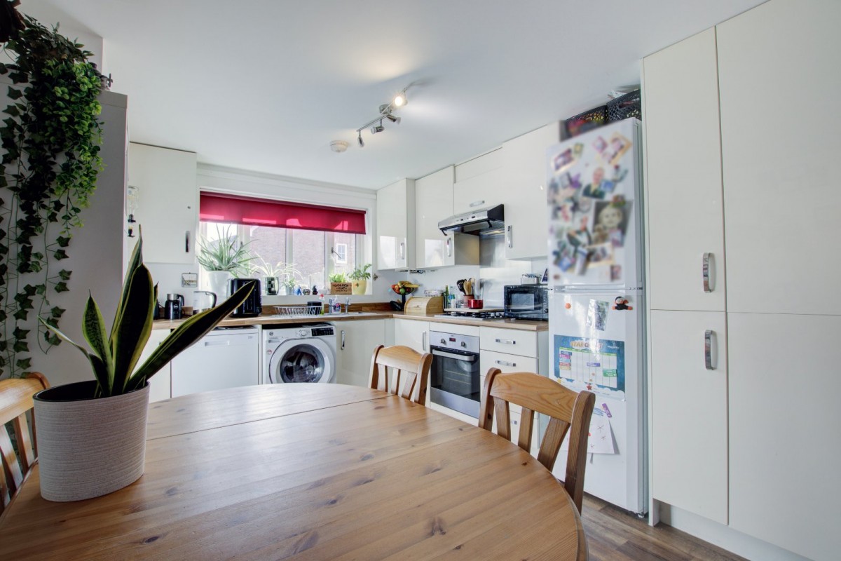 • Contemporary open-plan living room and kitchen, with a bright outlook to the front and a well-equipped fitted kitchen offering a range of floor and wall units, inset sink, four-ring gas hob with built-in oven, plumbing for dishwasher and washing machine, and concealed wall-mounted gas-fired boiler. The space also benefits from a large walk-in storage cupboard and views over the rear garden.