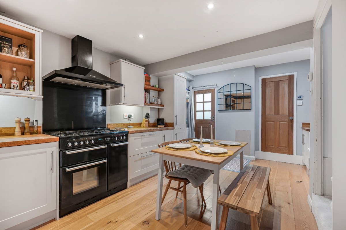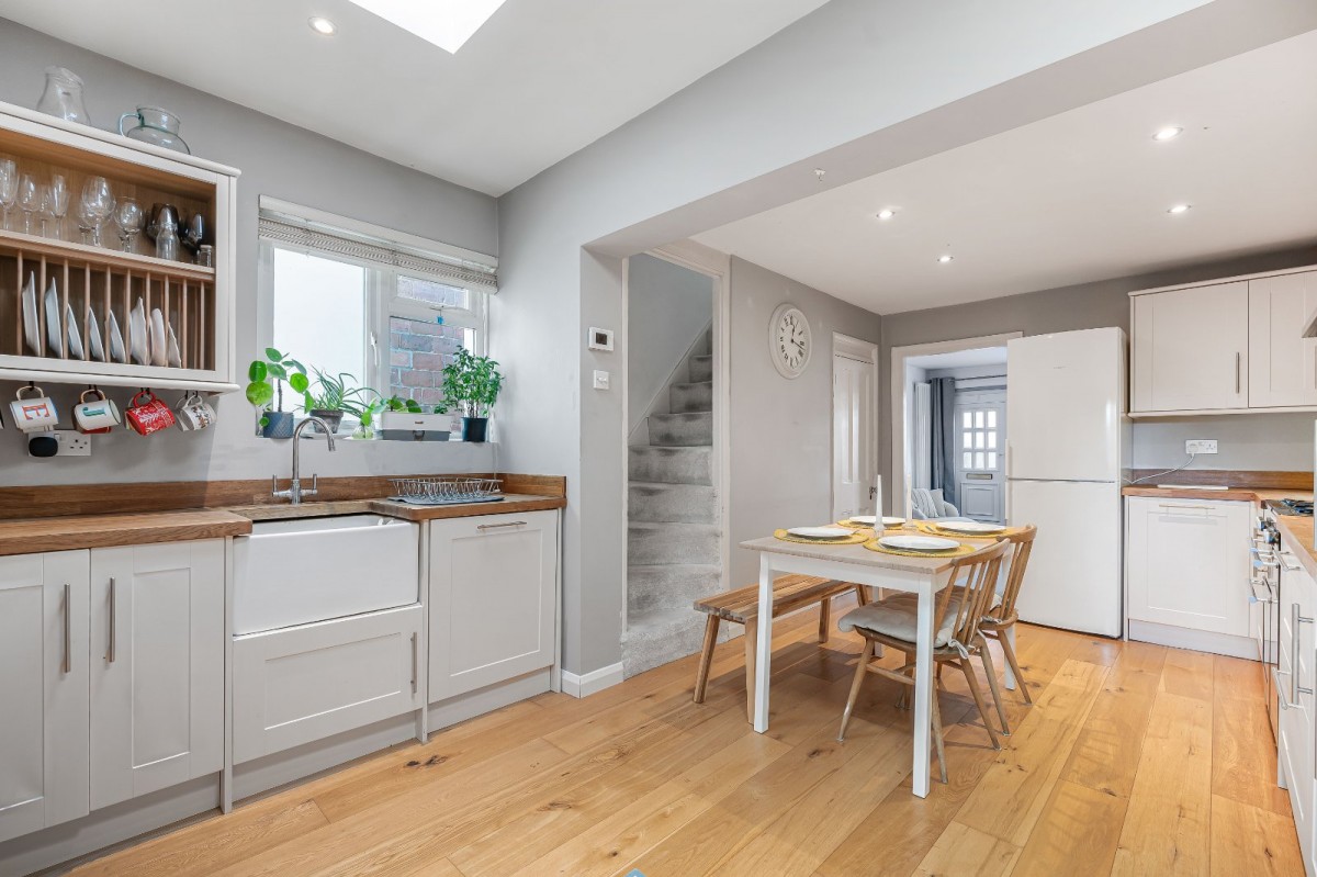 The home is entered via an elegant sitting room positioned at the front of the property, featuring attractive period details and a feature fireplace. To the rear, the spacious kitchen/breakfast room forms the true hub of the home, offering ample space for both everyday living and entertaining, with direct access onto the terrace. A contemporary family bathroom completes the ground floor accommodation.
