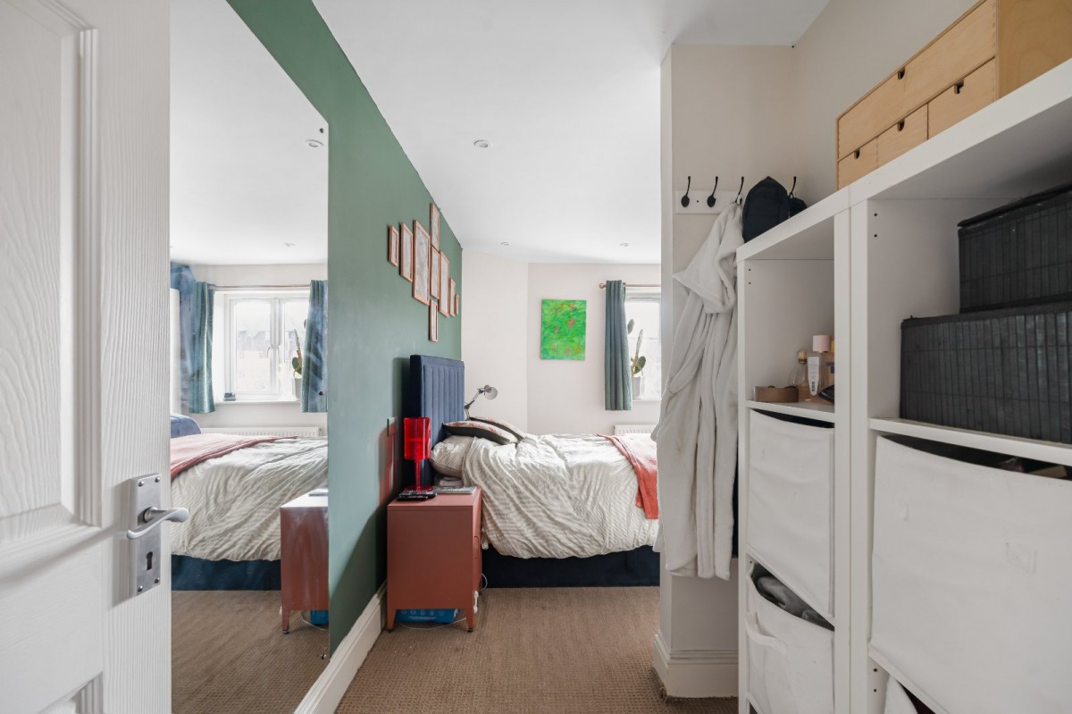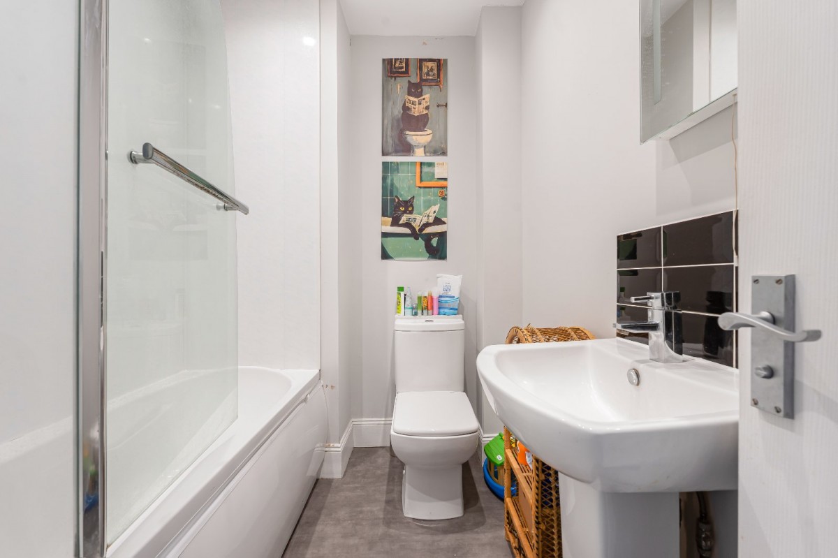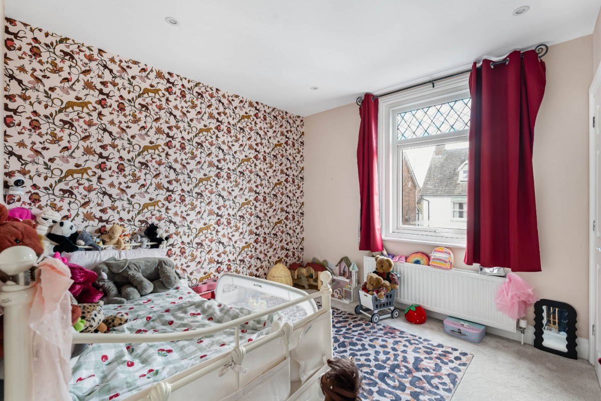 Upstairs, the property offers two comfortable double bedrooms. The principal bedroom benefits from a stylish en-suite finished with striking blue tiles, whilst an alcove provides a useful space for additional storage or a dressing area. The second bedroom is also well proportioned and includes a fitted wardrobe. Completing the accommodation is a pristine family bathroom with a shower over the bath.