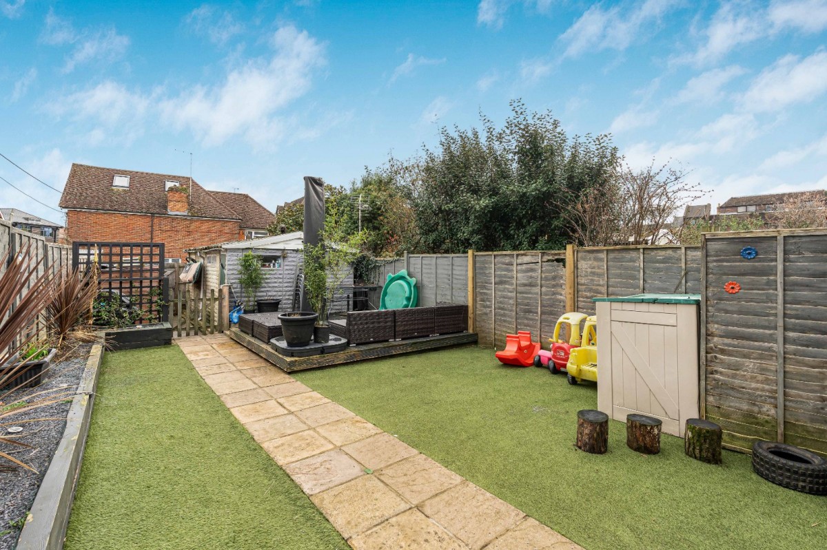 Outside, the garden is initially laid to patio before a pathway leads through an archway to a sunny raised deck, an ideal spot to enjoy during the warmer months. For ease of maintenance, the vendors have installed artificial lawn, whilst raised planters provide an opportunity for keen gardeners to add their own personal touch.