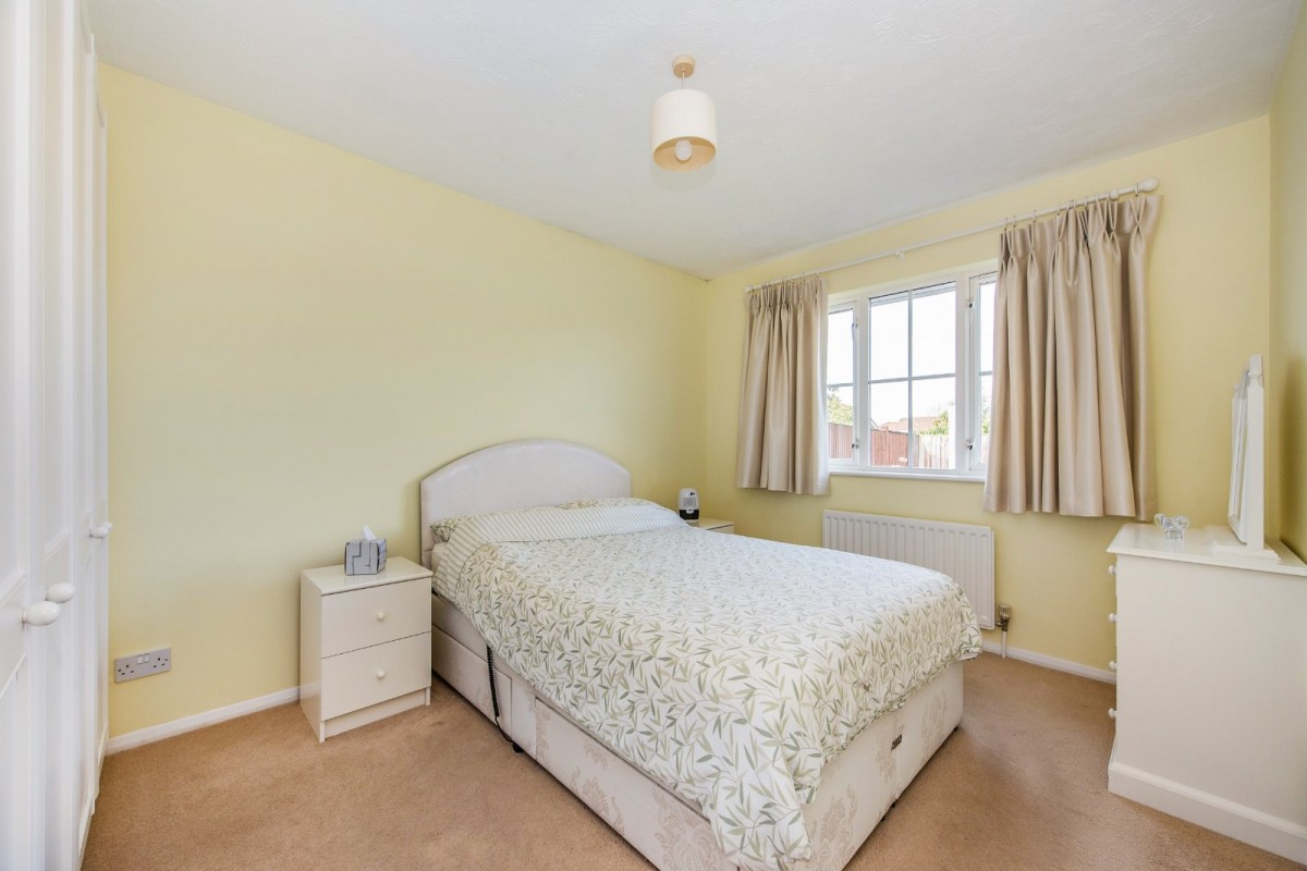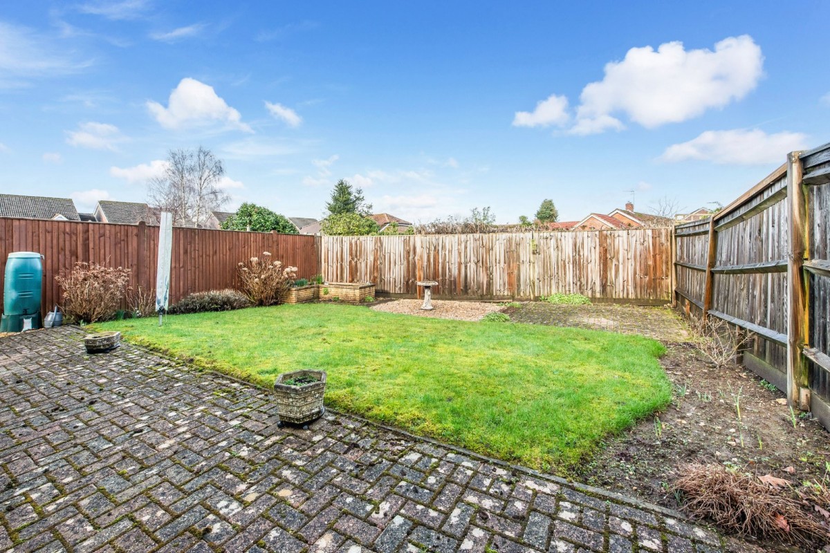 Outside, the enclosed rear garden features a lawn, borders and paved patio — ideal for outdoor dining or leisure. A side gate connects to the front, where a single garage (attached to a neighbouring garage) offers secure parking or storage.
