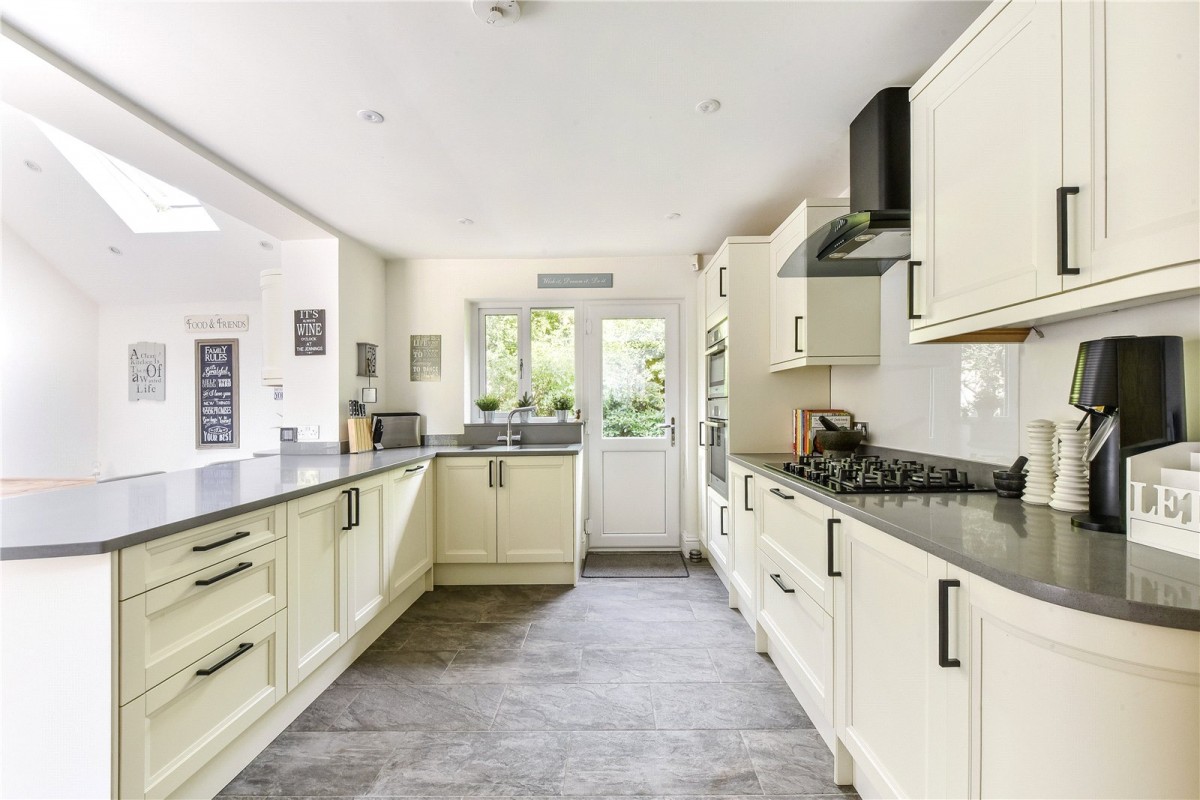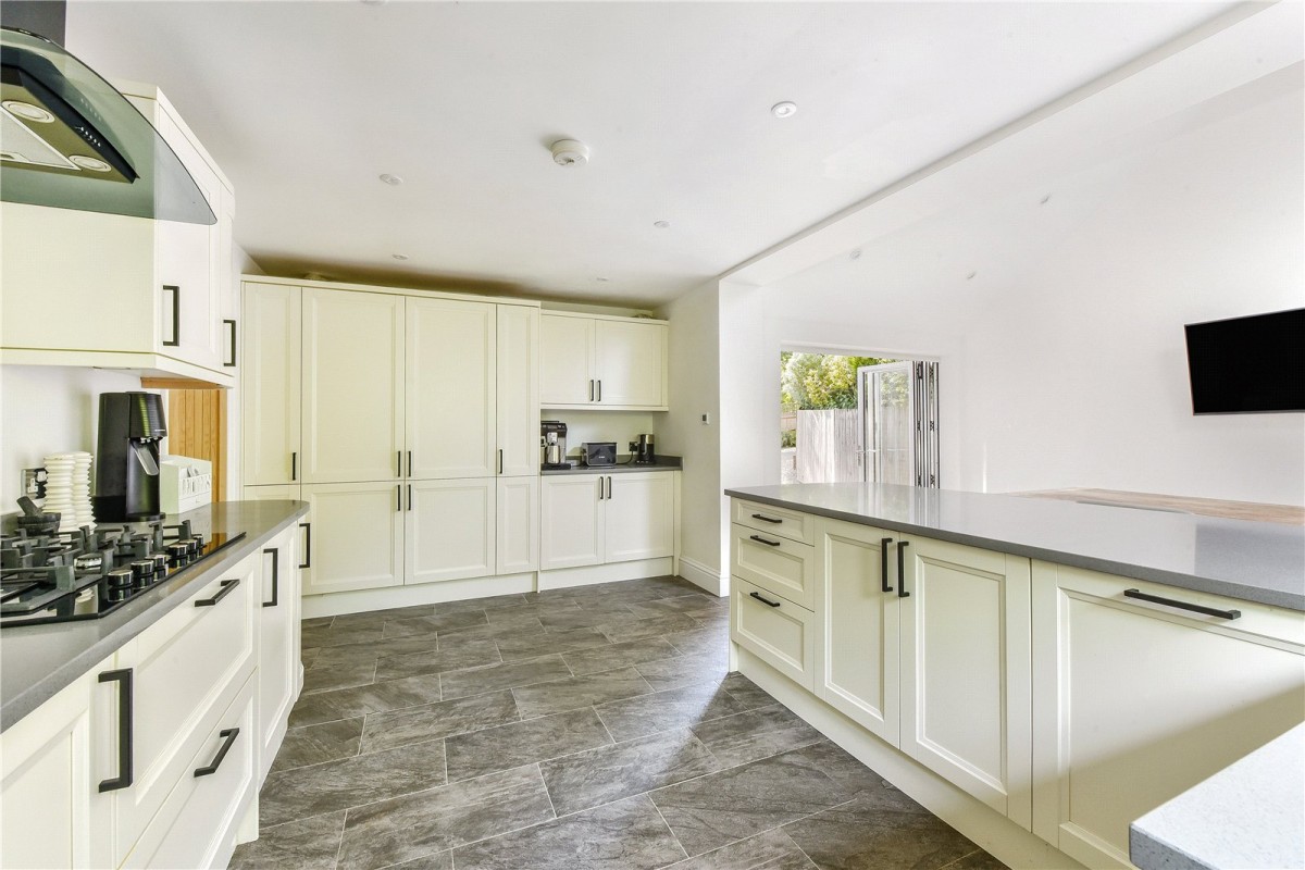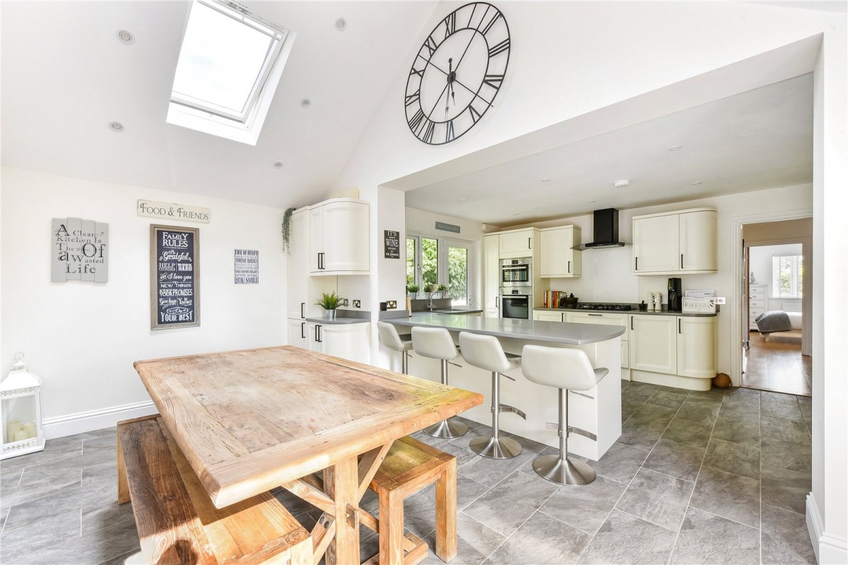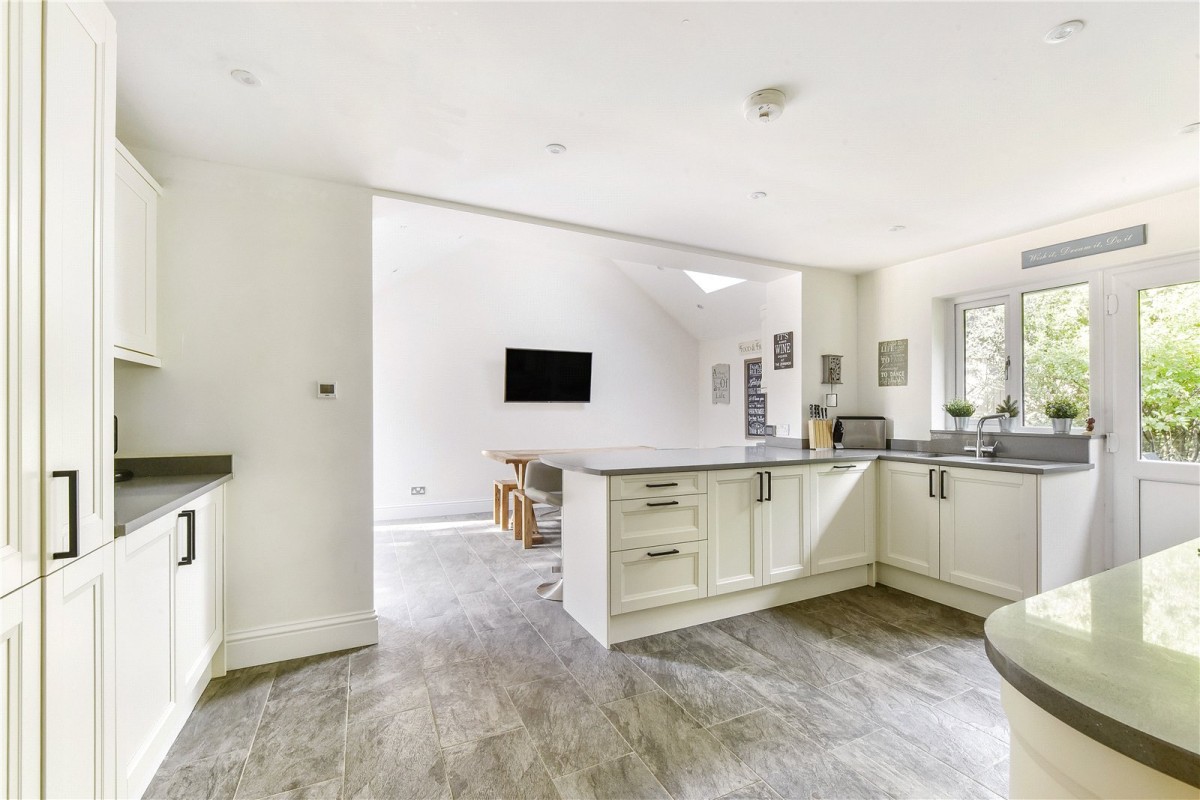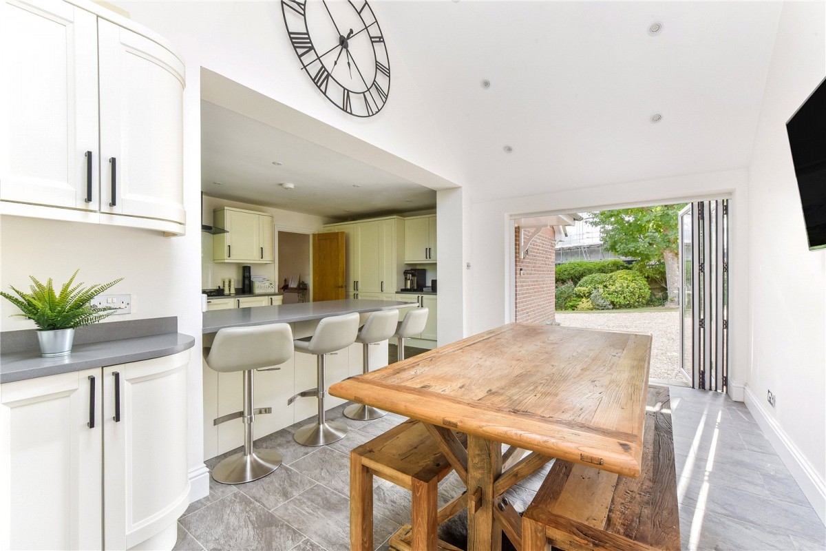 As you step through the front door, a generous hallway leads to the living spaces and bedrooms, with many rooms enjoying direct access to the outside. Large windows and doors, combined with tasteful neutral décor, fill the property with natural light. At the heart of the home is a stunning kitchen and dining area that has been comprehensively refitted with a quality range of units, ample work surfaces and high-end integrated appliances. A breakfast bar peninsula creates an ideal spot for casual dining or extra preparation space. Bi-fold doors open to the front, a rear door adds further convenience, and a part-vaulted ceiling with a Velux window enhances the sense of space and light. Underfloor heating throughout this area completes the inviting feel.