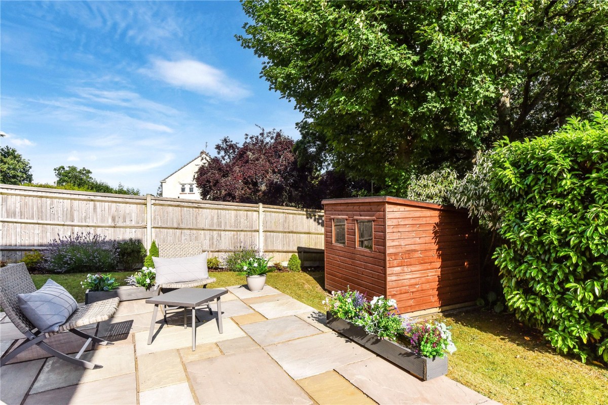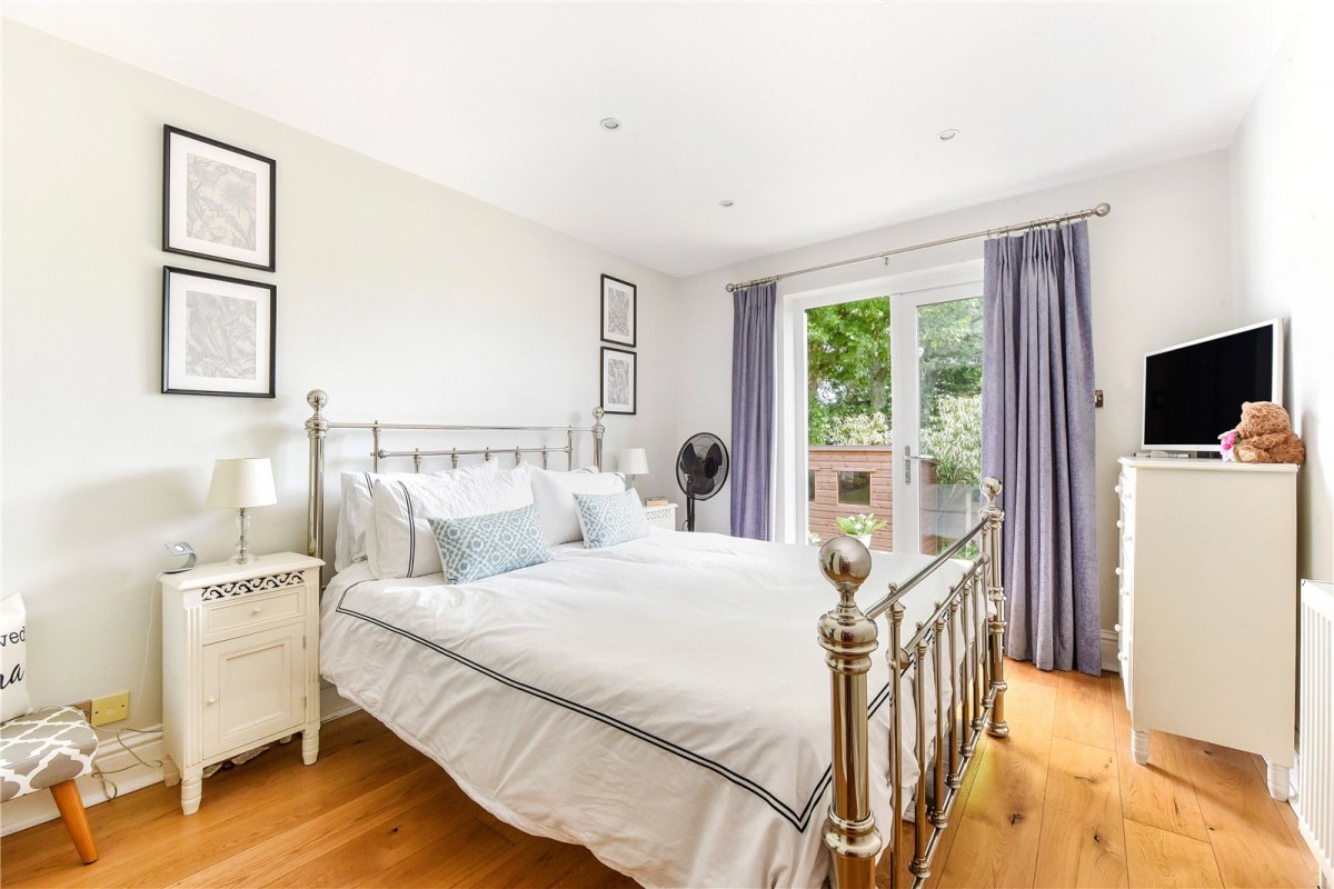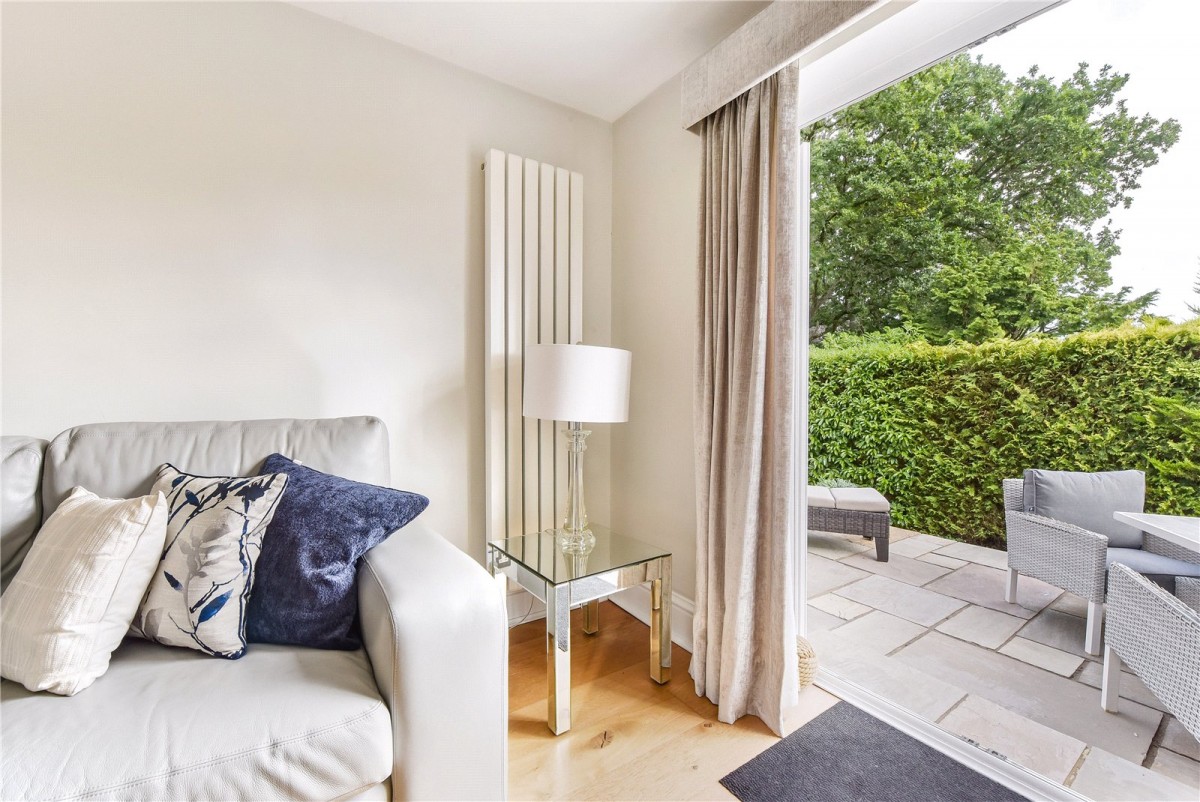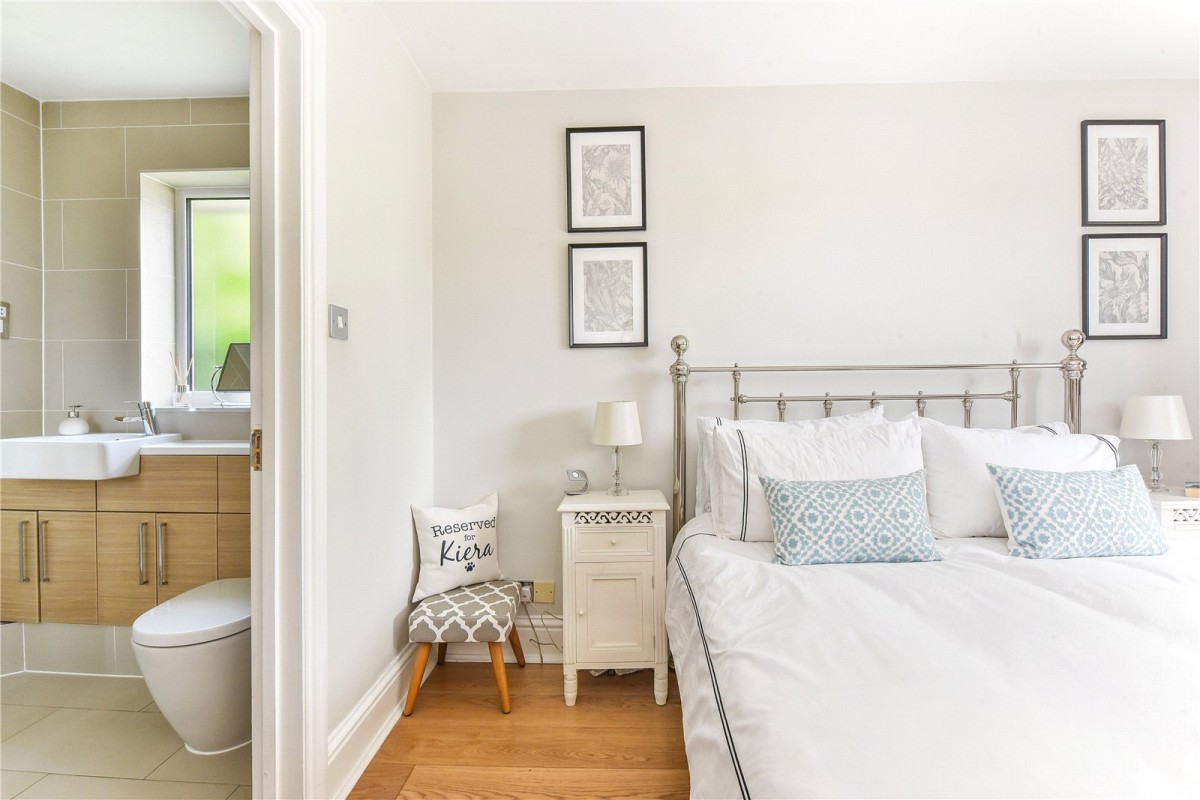 The living room is a wonderful place to relax, offering lovely views over the garden towards Butser Hill, with doors that open onto an excellent raised terrace, perfect for al fresco dining or simply soaking up the sun. All three bedrooms are generous doubles. The principal bedroom has direct access to the terrace and benefits from a beautifully refitted ensuite shower room. The second bedroom features built-in storage and French doors leading outside, while the third bedroom also includes a built-in wardrobe. A stylish family bathroom has also been thoughtfully updated and further quality touches such as oak doors and oak flooring throughout enhance the sense of a truly turnkey home.