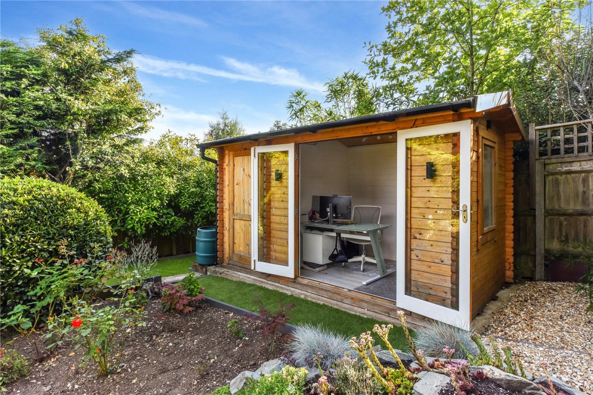 Outside, the property is approached through a five-bar timber gate onto a gravel driveway providing parking for several cars. Mature trees at the front offer privacy and the attractively landscaped gardens enjoy a sunny aspect with views extending towards Butser Hill. A superb detached home office or studio provides an inspiring place to work while overlooking the garden, and is accompanied by an attached store for convenient storage. There is also a further good-sized garden shed.