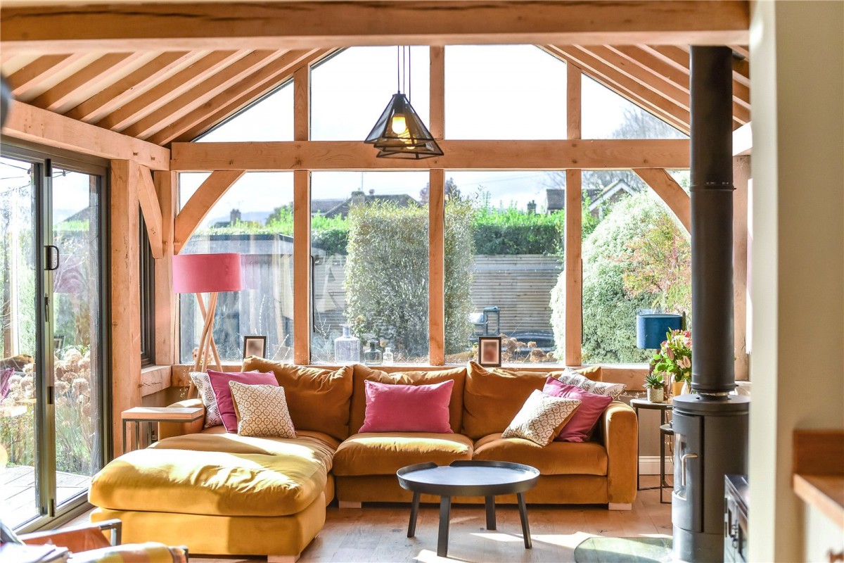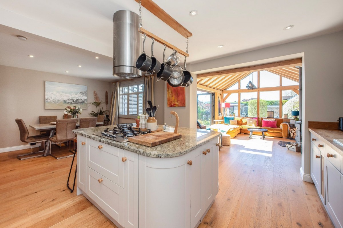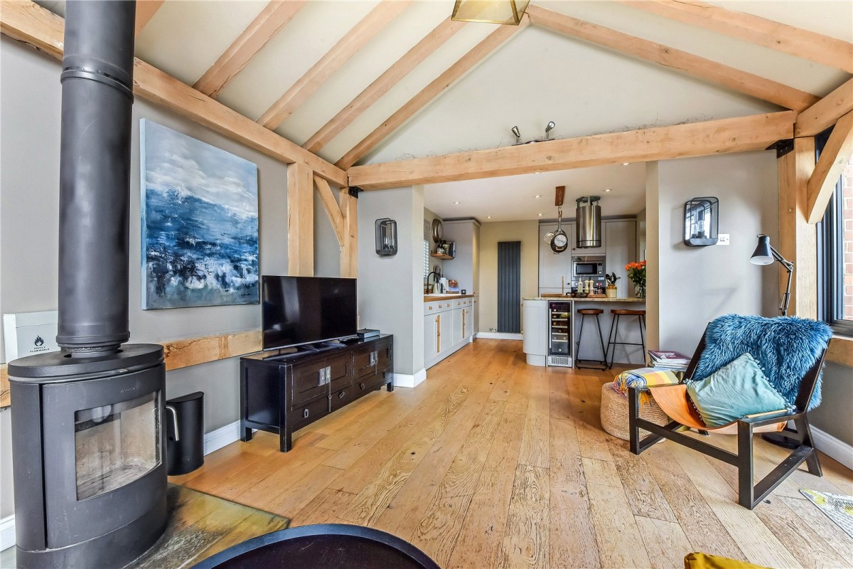 As you step through the front door, a welcoming central hallway with staircase to the first floor provides access to the main living areas. The accommodation has been thoughtfully designed to create an effortless flow, with a superb open-plan living and dining space incorporating a high-specification kitchen. The kitchen features a central island, a range of integrated appliances and ample space for entertaining, while the dining area easily accommodates a large table, perfect for family gatherings. This remarkable open-plan space extends seamlessly into the oak-framed rear extension, where vaulted ceilings and a charming log burner create a wonderful sense of light and atmosphere, complemented by delightful views and direct access to the garden.