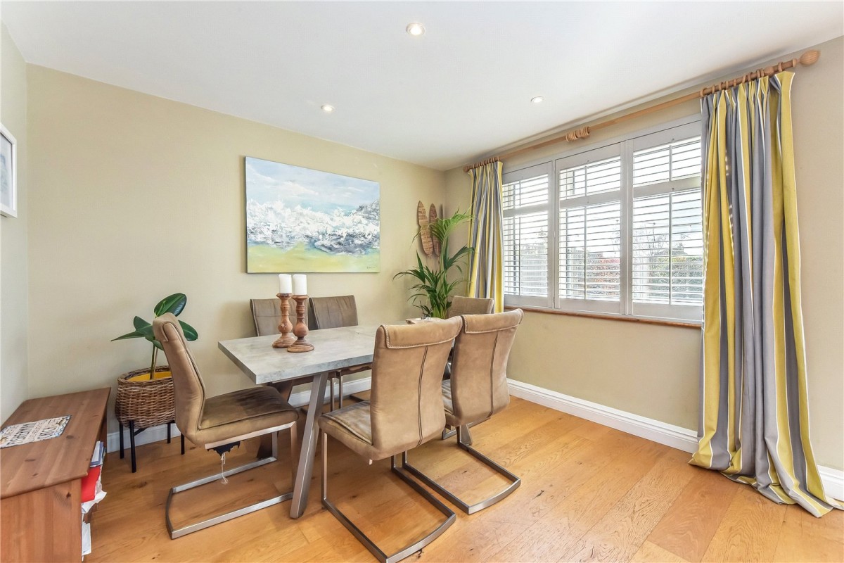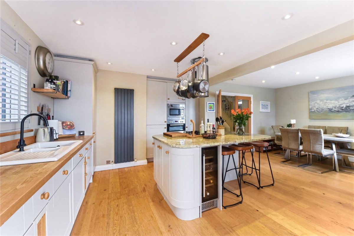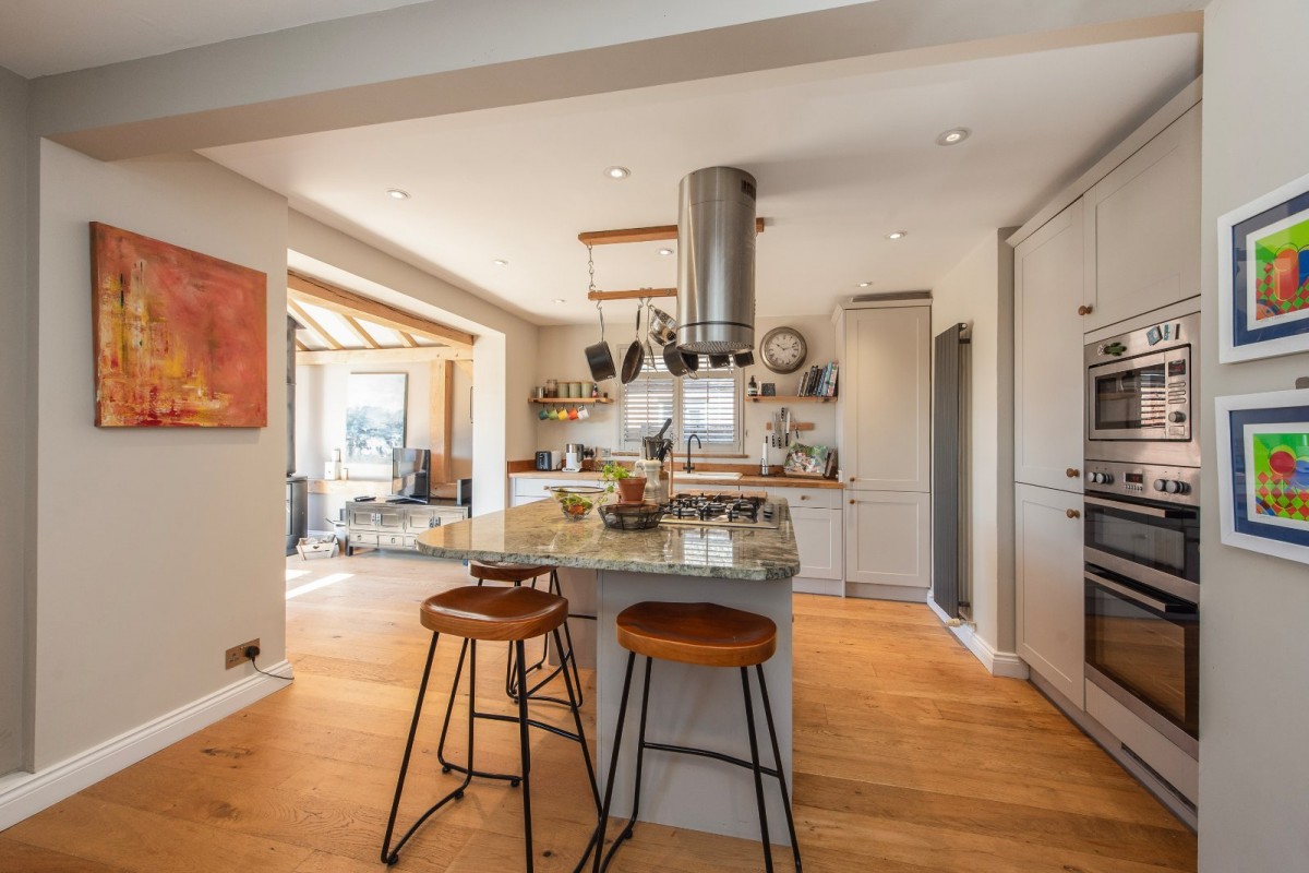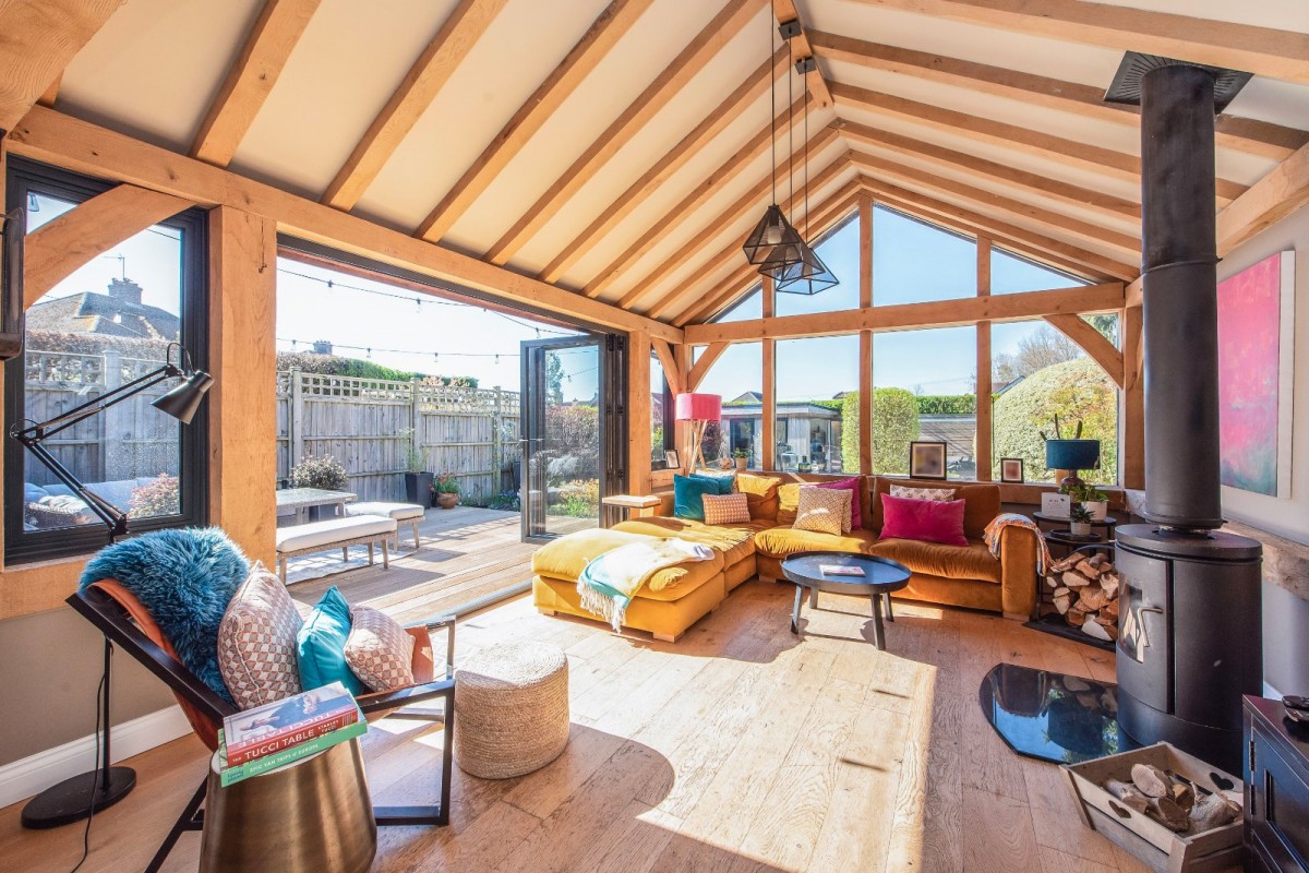 As you step through the front door, a welcoming central hallway with staircase to the first floor provides access to the main living areas. The accommodation has been thoughtfully designed to create an effortless flow, with a superb open-plan living and dining space incorporating a high-specification kitchen. The kitchen features a central island, a range of integrated appliances and ample space for entertaining, while the dining area easily accommodates a large table, perfect for family gatherings. This remarkable open-plan space extends seamlessly into the oak-framed rear extension, where vaulted ceilings and a charming log burner create a wonderful sense of light and atmosphere, complemented by delightful views and direct access to the garden.