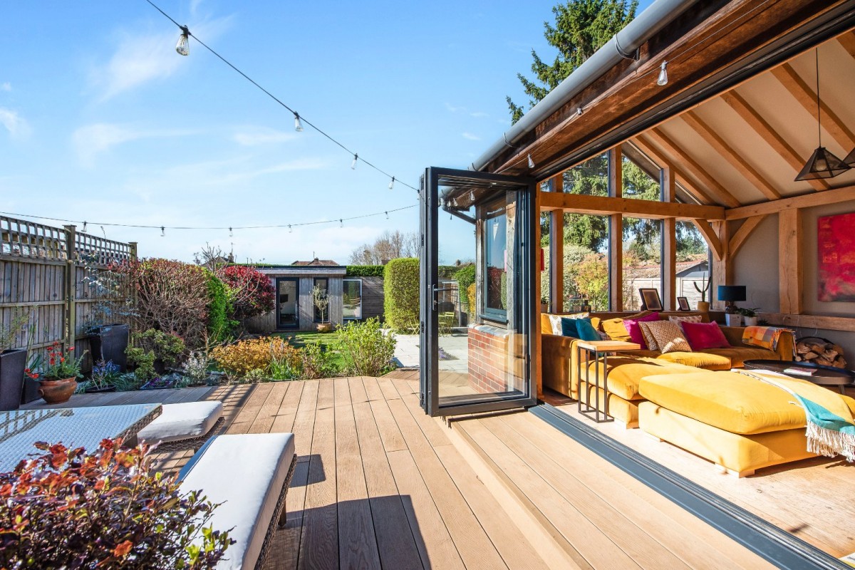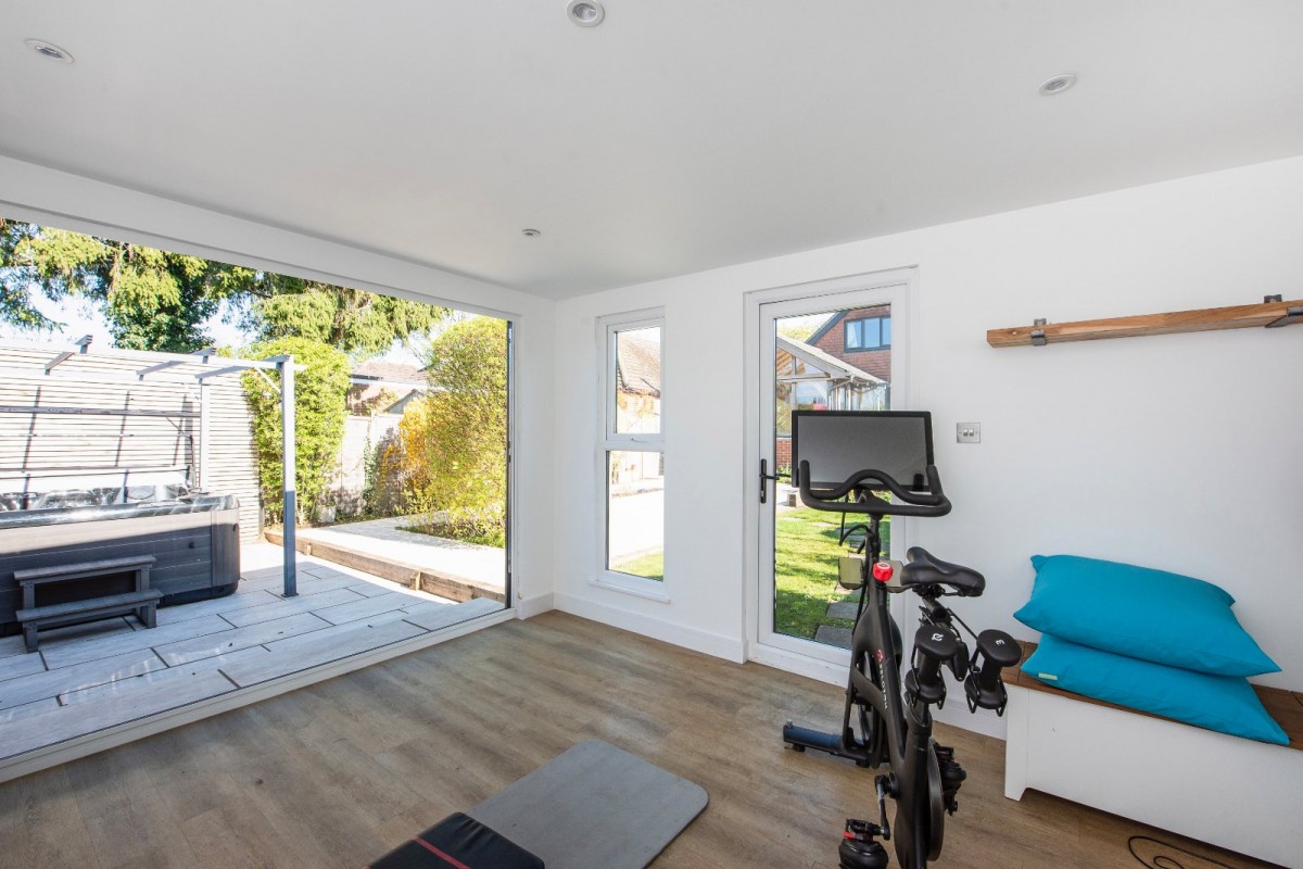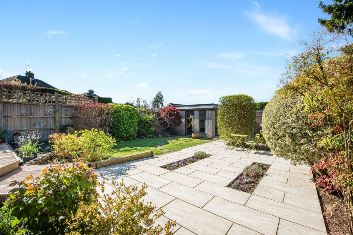 Outside, the property continues to impress. The beautifully landscaped south-westerly garden provides an ideal setting for relaxation and entertaining, with a large composite decked terrace leading down to a well-maintained lawn bordered by mature beds and planting. A pathway leads to a lower patio area, perfectly positioned for a hot tub, along with a detached home studio that would make an ideal office, gym or creative space. To the front, there is an attractive garden and driveway providing parking for up to three vehicles.