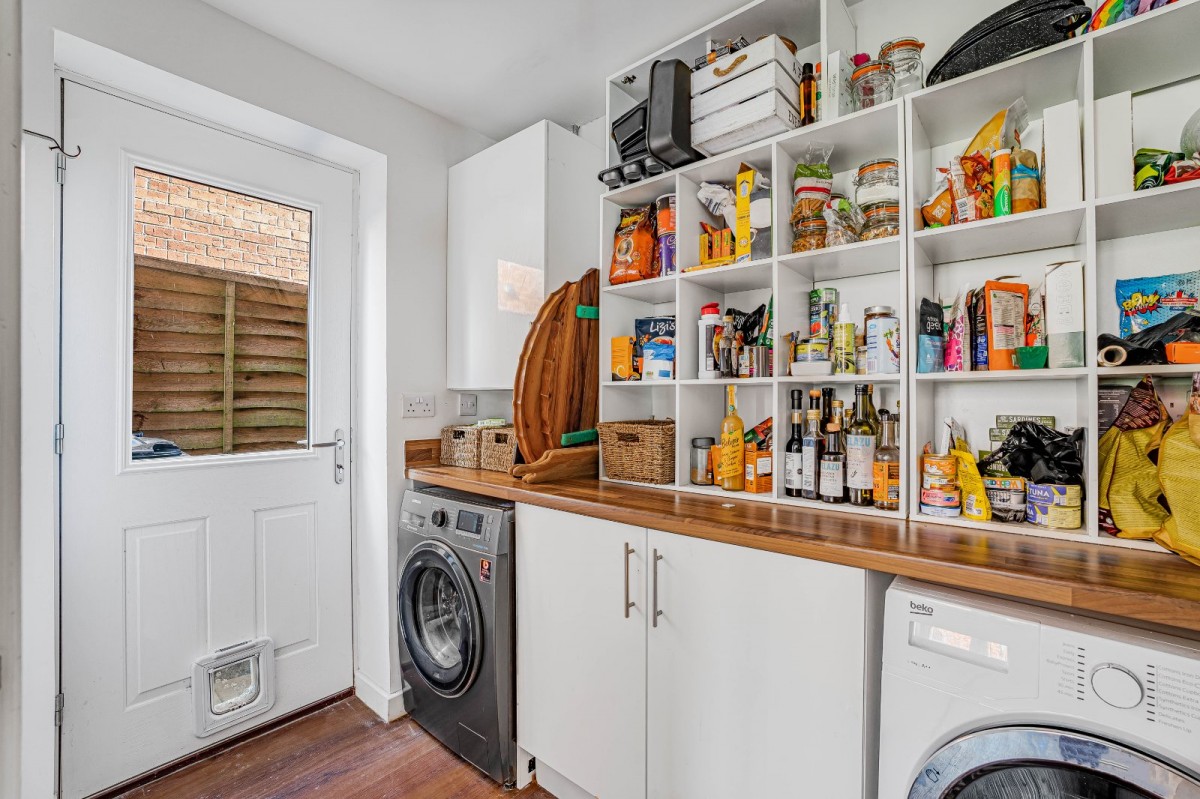 Adjoining the kitchen is a practical utility room, offering additional worktop space, storage, and room for appliances, with a door providing convenient side access to the garden. A well-appointed cloakroom completes the ground floor accommodation.