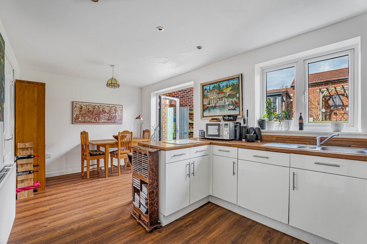 Upon entering, you are welcomed by a bright and inviting hallway leading through to the main living areas. The lounge, positioned to the front of the property, provides a cosy yet stylish space to relax and unwind. To the rear, the impressive kitchen/dining room forms the heart of the home, featuring modern cabinetry, integrated appliances, and ample space for dining and entertaining. French doors open directly onto the rear garden, creating a seamless flow between indoor and outdoor living and allowing natural light to pour in.