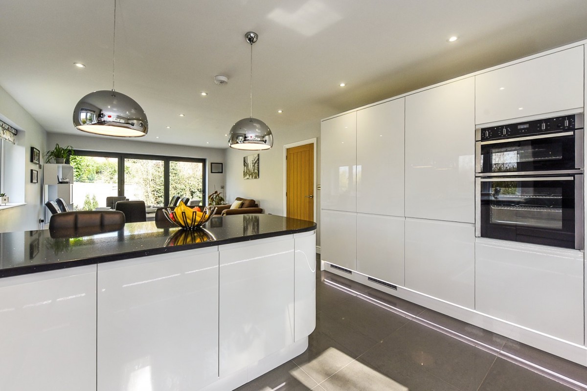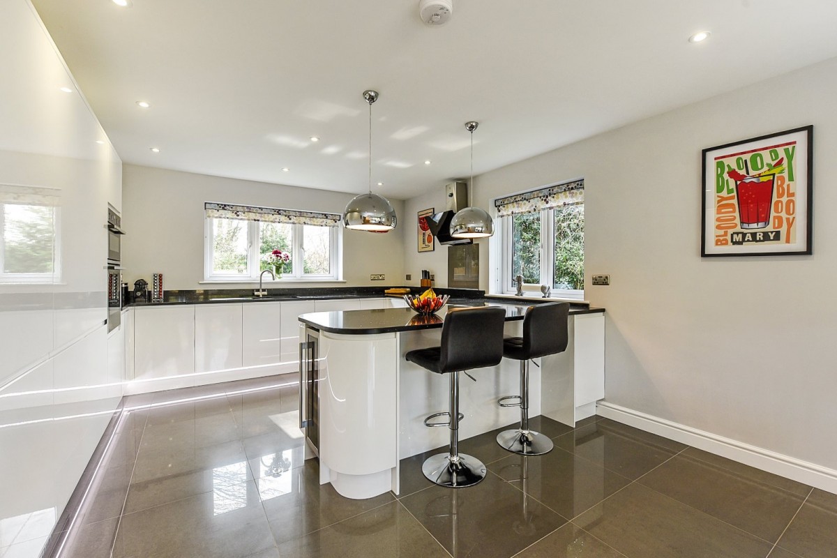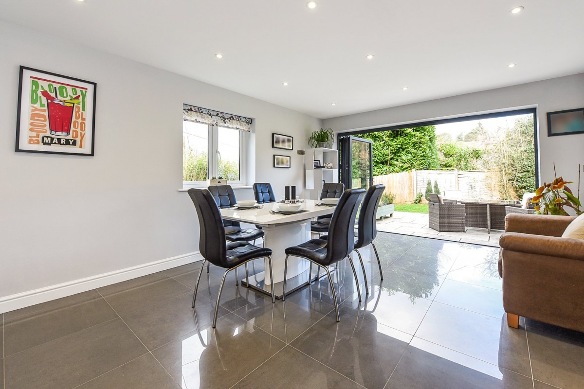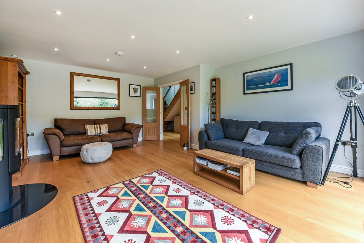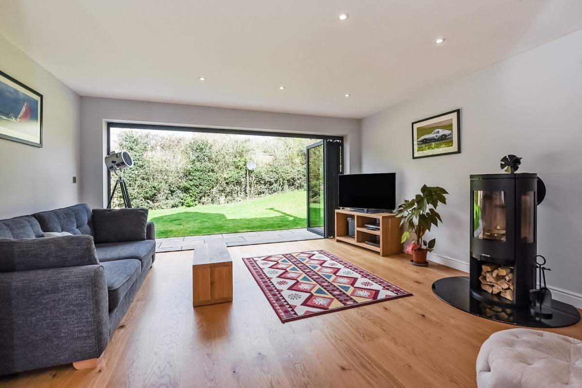 The dual aspect kitchen/dining room approaches 30ft and features high-end integrated appliances including an induction hob and extractor, dishwasher, double oven and wine cooler. Glossy quartz worktops incorporate a central breakfast bar, while storage is in abundance at both surface and eye level. The spacious diner has bi-folding doors, opening out to the patioed seating area, blending the in and outdoor space, perfect for al-fresco dining and entertaining family and friends. The adjacent sitting room also has bifold doors to the garden and an Opus log burning stove.
