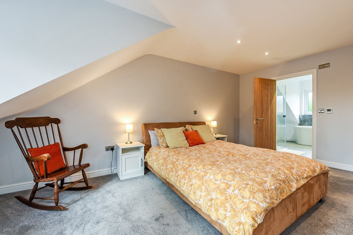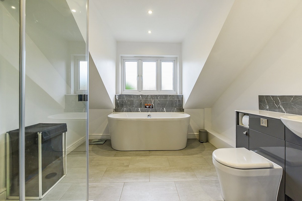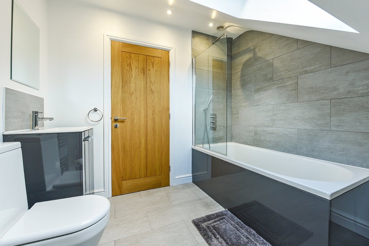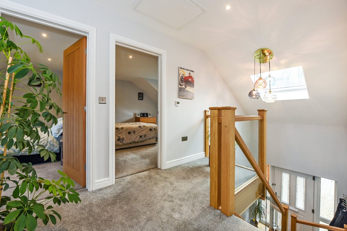 The staircase, fitted with glass balustrades leads to a galleried landing illuminated by a Velux window, creating an open, light and airy feel. On the first floor, three comfortable double bedrooms are offered. The principal bedroom is serviced by a sleek four piece en-suite. The family bathroom has a bath over shower, both of which benefit from waterfall shower heads.