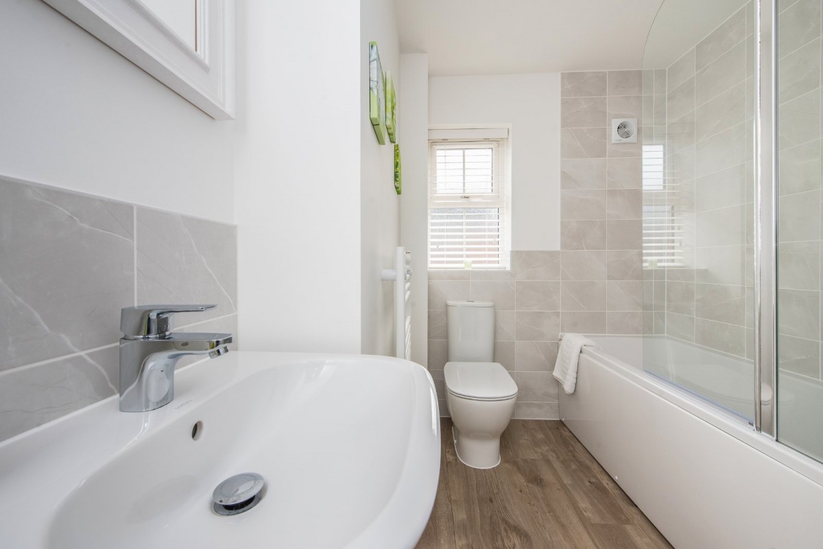 The family bathroom enjoys a panel enclosed bath with a mixer tap and shower plus a shower screen. A low-level WC and wash hand basin are also fitted. There is a shaver point and heated towel plus wood effect flooring.