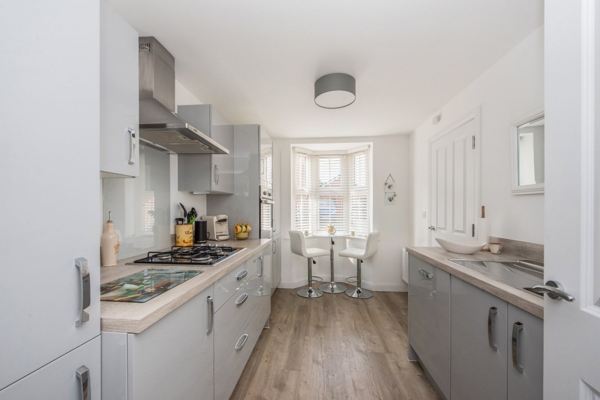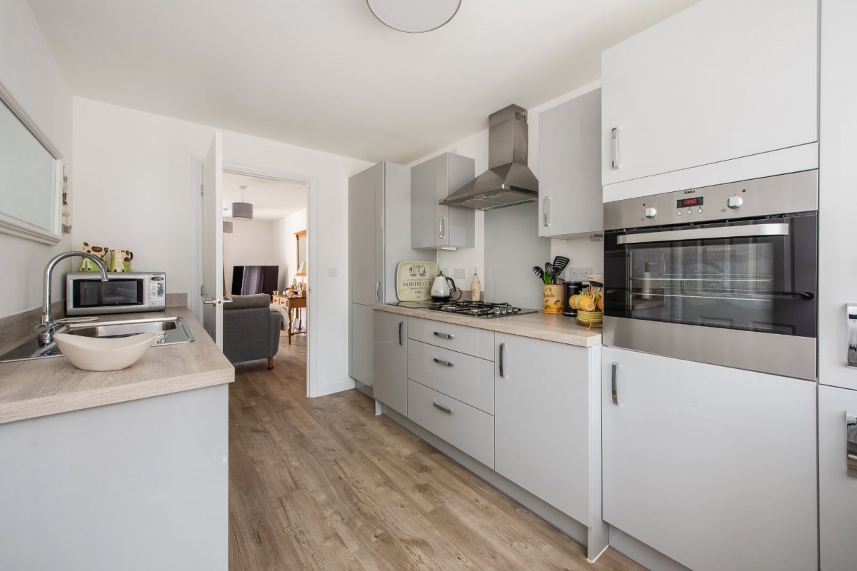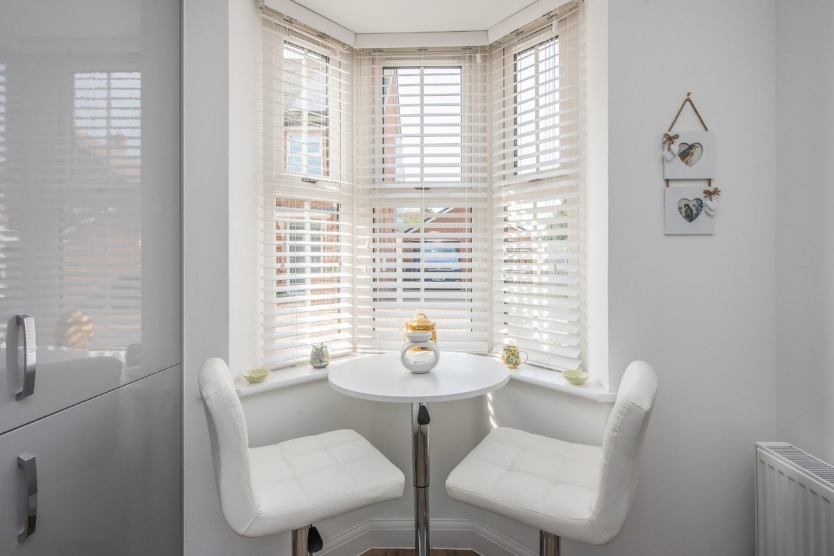 The kitchen is a bright room with a double-glazed bay window and Amtico wood effect flooring. Fitted with a wide range of eye and base level storage units and worktops. A stainless-steel sink unit and drainer with mixer tap is inset. An oven, hob and extractor hood are fitted, and a washer dryer, dishwasher and fridge / freezer are integrated.