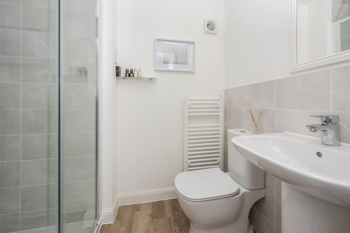 The en suite shower room has Amtico wood effect flooring and comprises of a shower cubicle, low level WC and a wash hand basin. A heated towel rail is fitted.