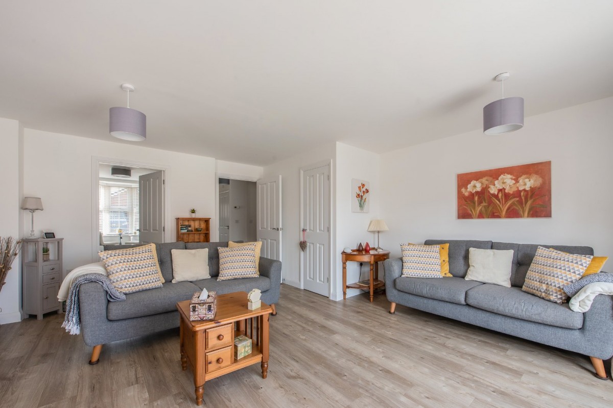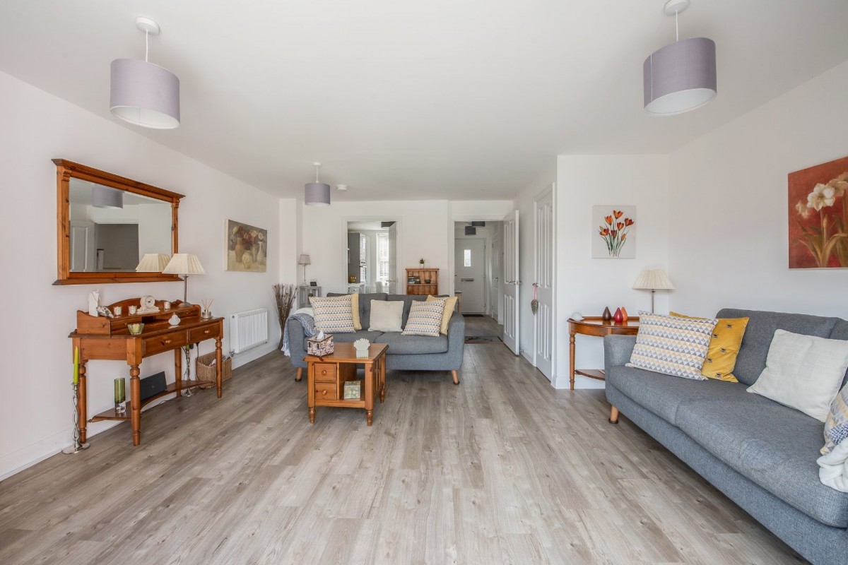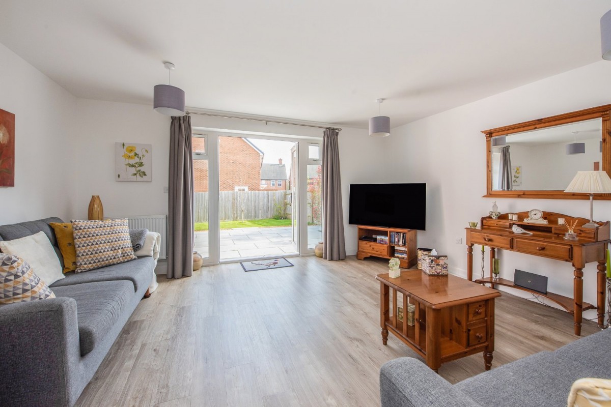 A door opens into the living room. A bright and spacious room with space enough for a dining table and chairs plus lounge furniture. Amtico Wood effect flooring and double-glazed double doors that open into the garden. Radiator.