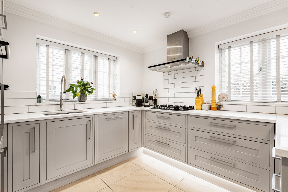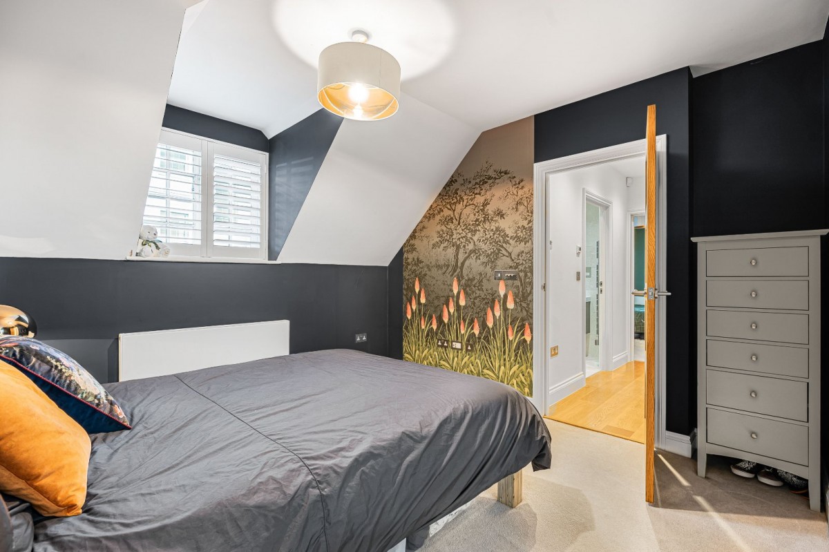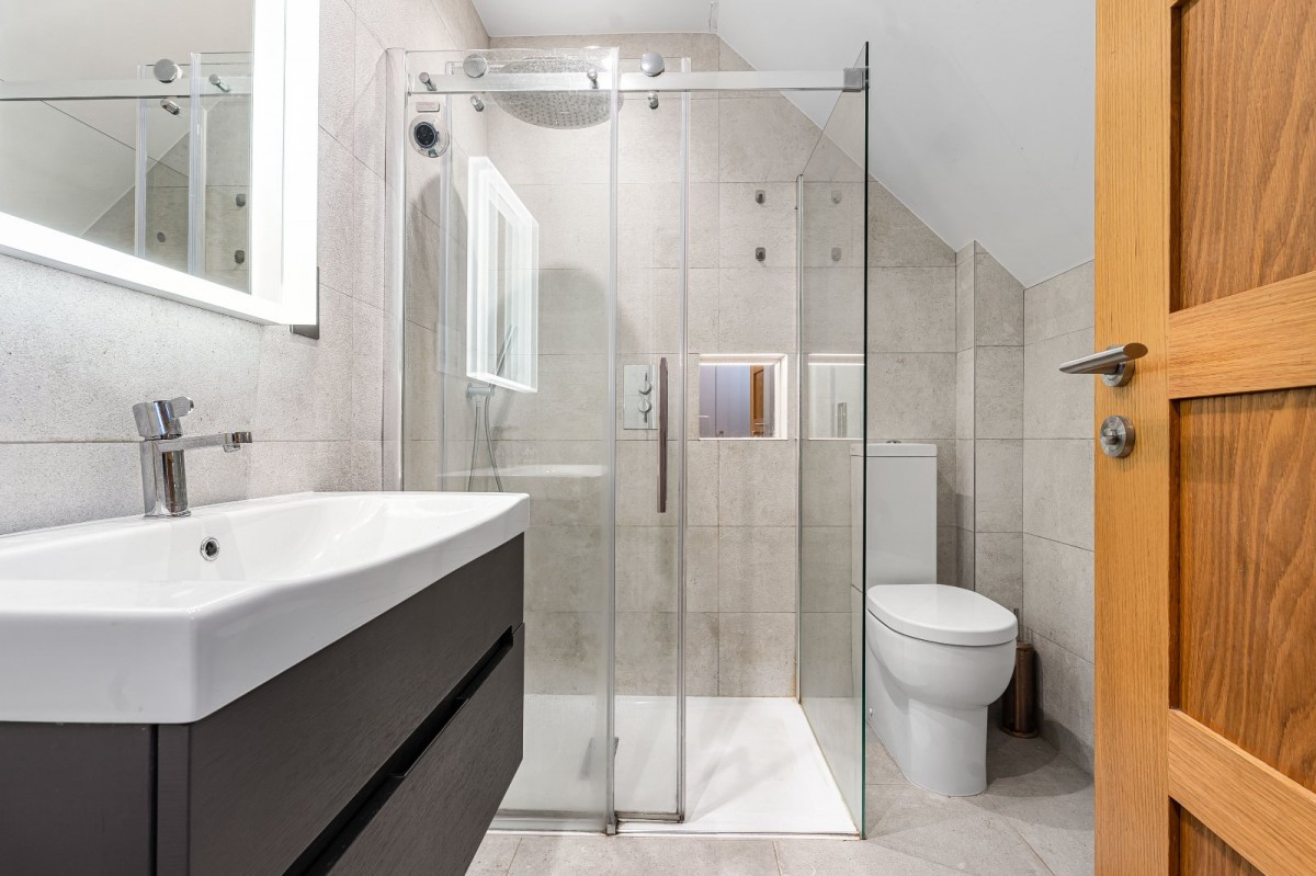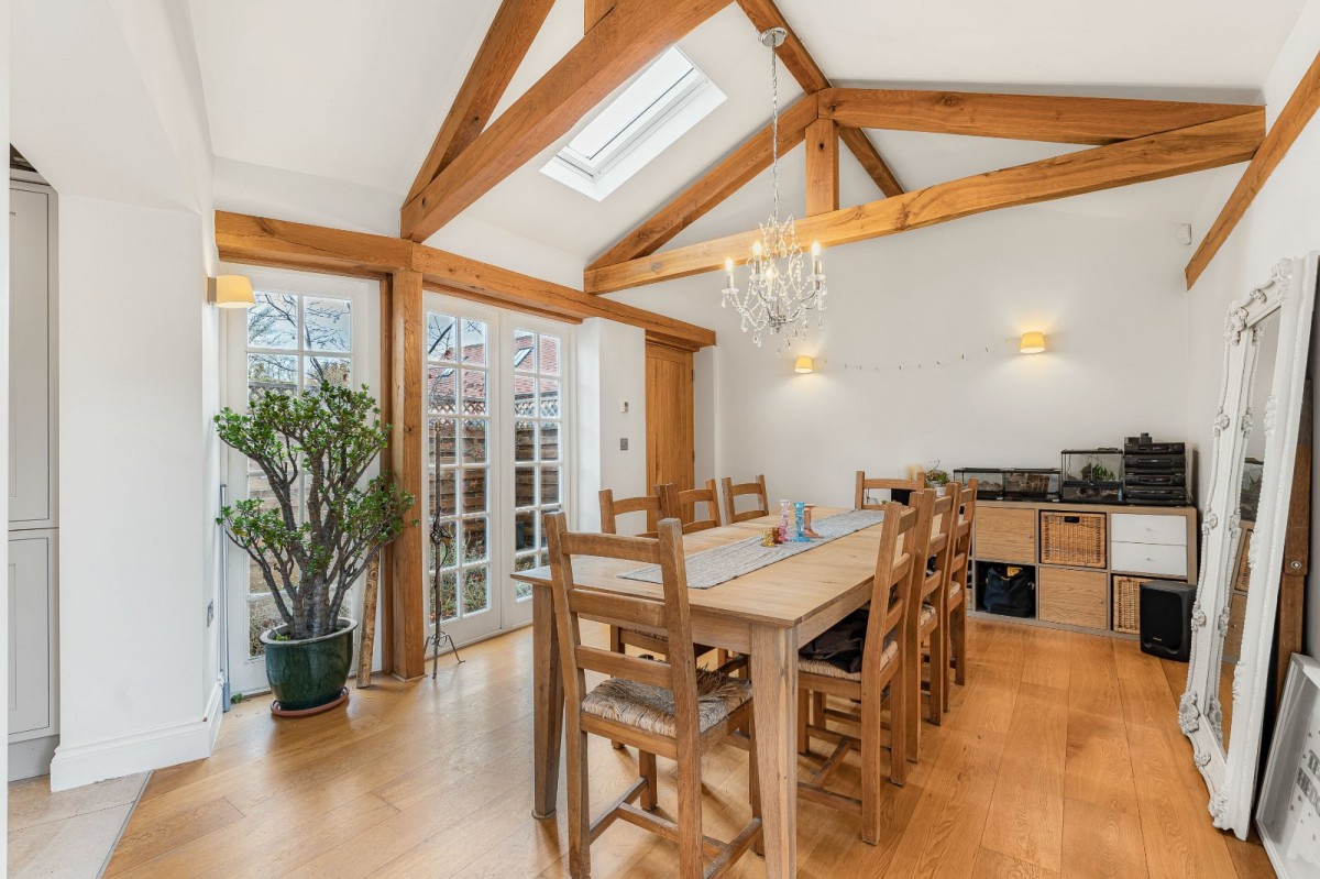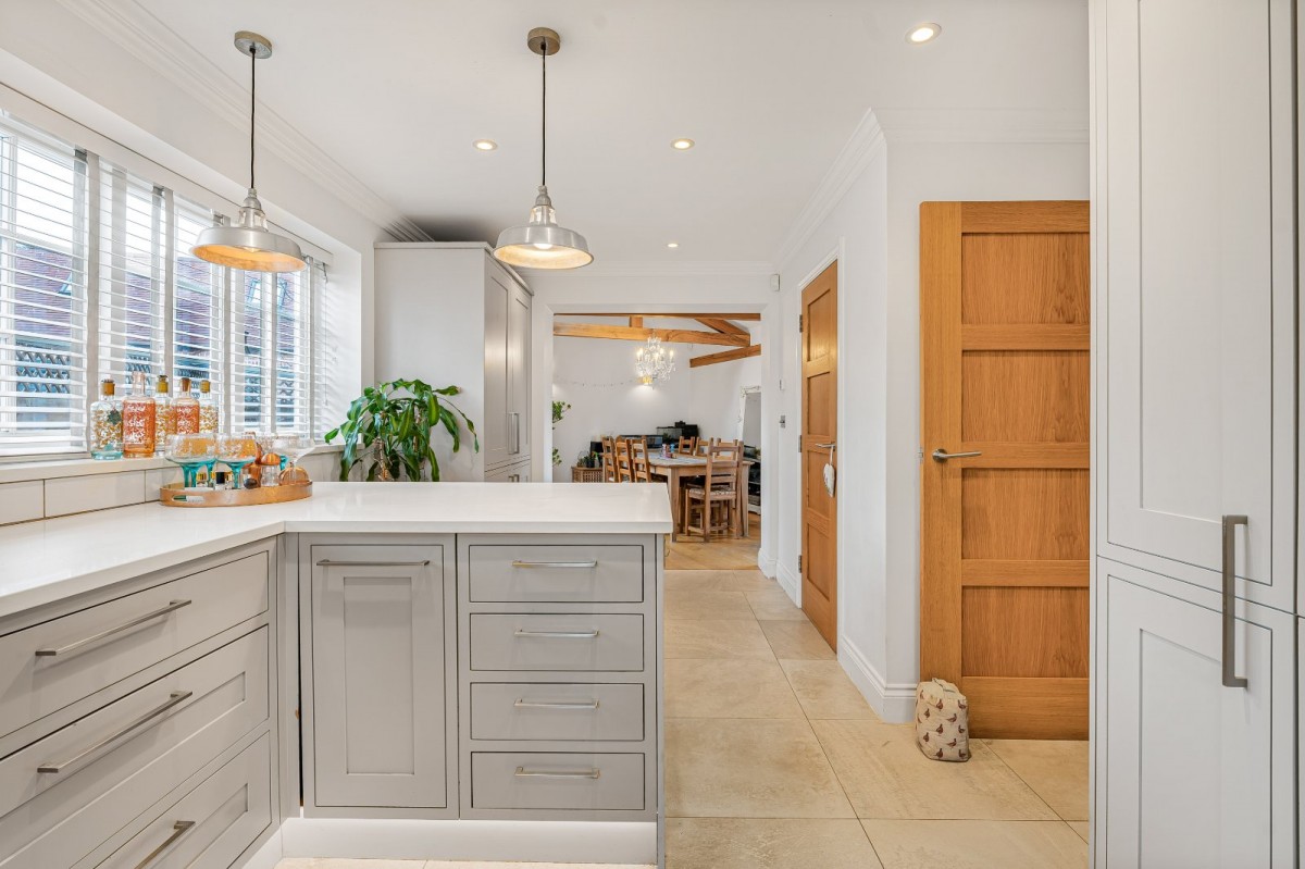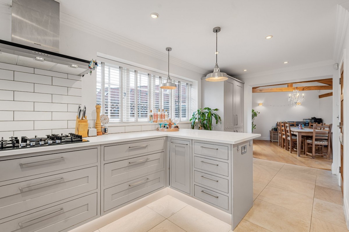 Inside, you’re greeted by sleek interiors with solid oak flooring, underfloor heating and dimmable LED lighting. The luxury Shaker kitchen features Siemens appliances and stone worktops, flowing into a striking vaulted dining space — ideal for entertaining. A cosy sitting room with multi-fuel burner opens onto the garden, and a separate utility room keeps everyday living effortless.