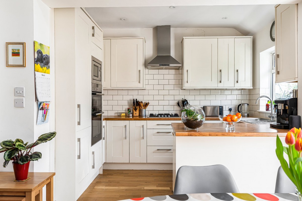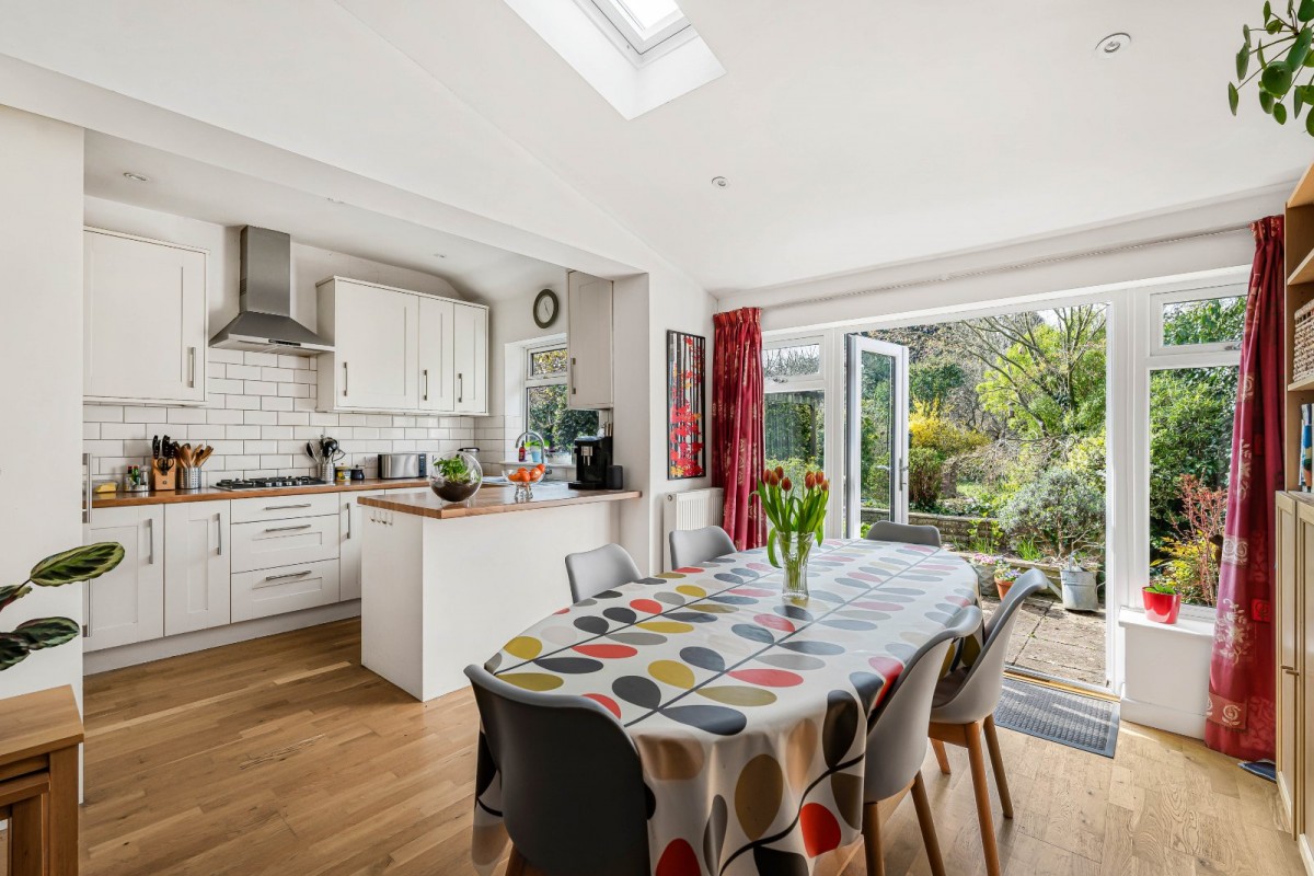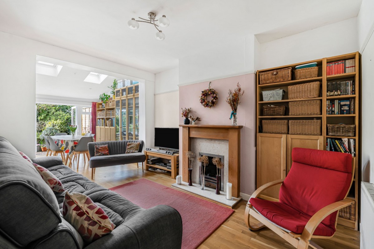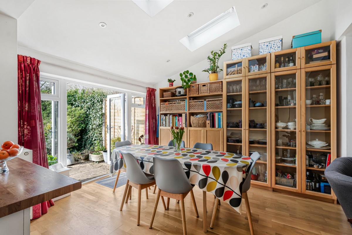 Further along, the ground floor opens up into a superb open-plan layout. A versatile family room seamlessly flows into a stylish kitchen/diner, creating the ideal hub for both everyday living and entertaining. The kitchen is tastefully finished and features a range of built-in appliances, complemented by Velux windows within the rear extension that flood the space with natural light and create a bright, airy atmosphere.