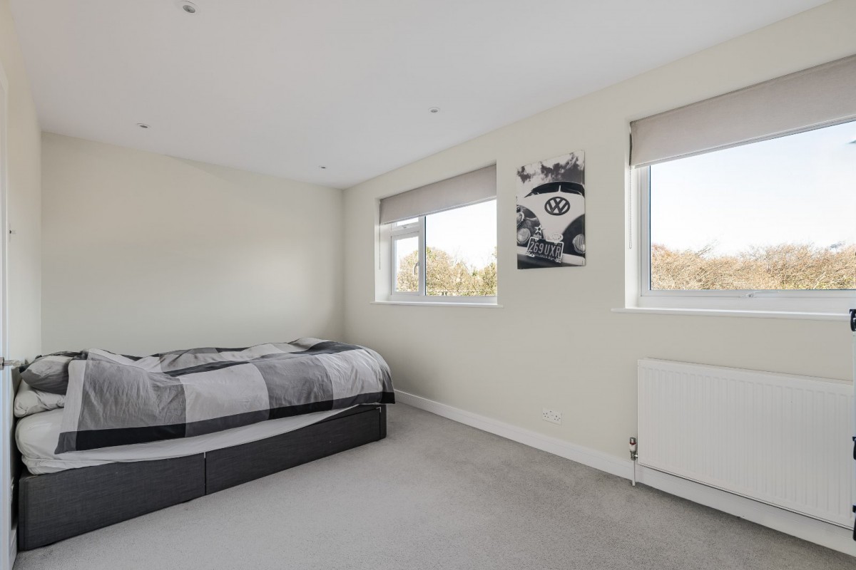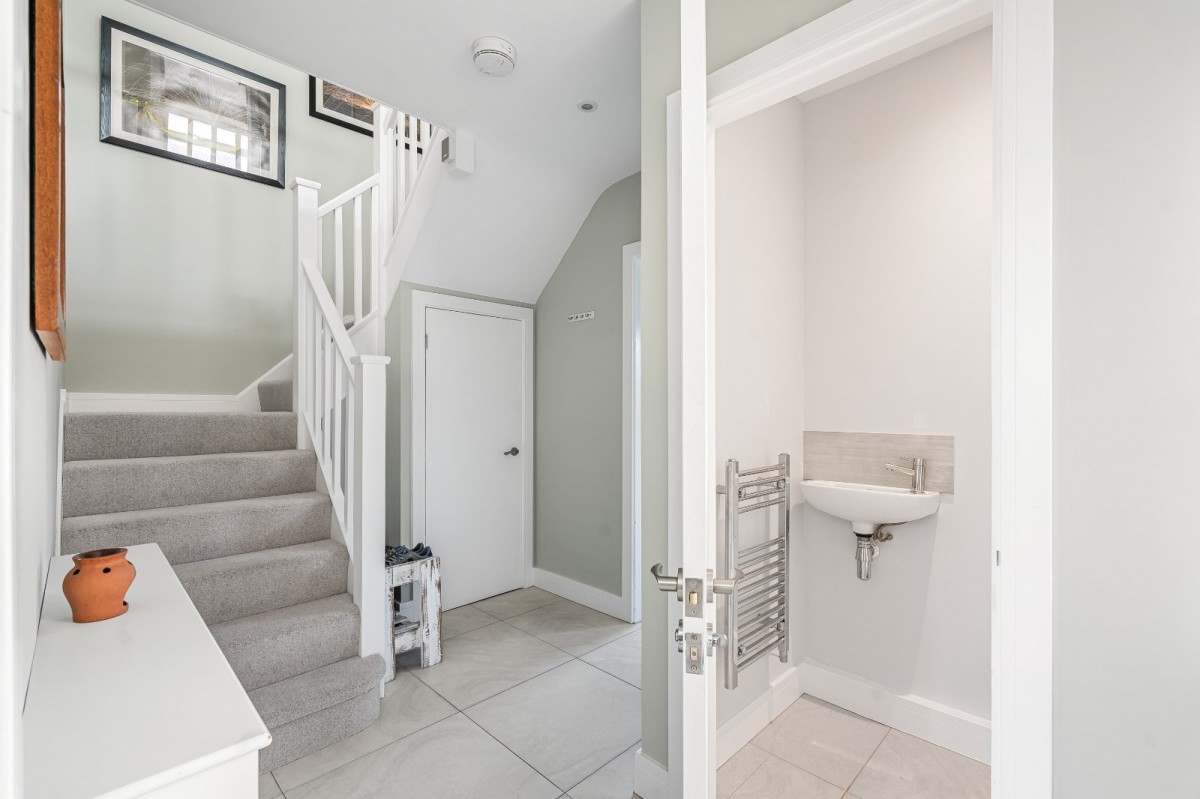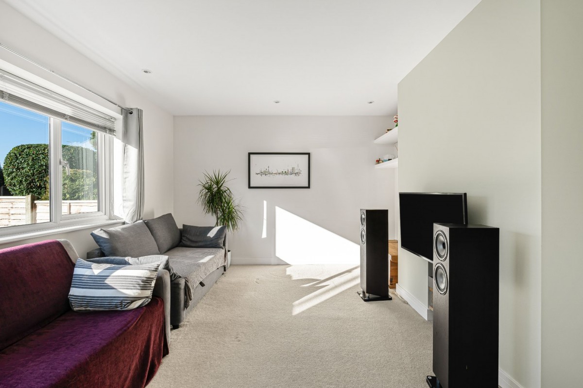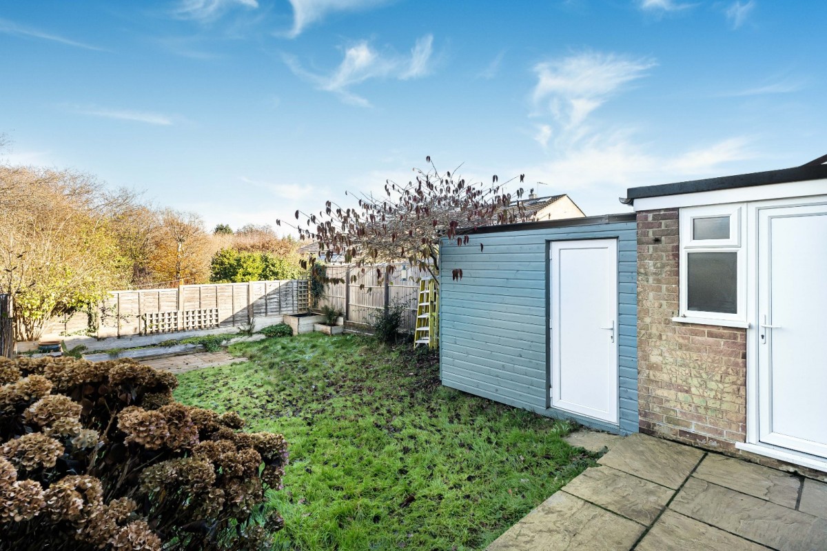Upstairs, three well-sized bedrooms are offered. The primary bedroom is particularly spacious and enjoys an outlook over the garden, bedroom two is a comfortable double with built-in storage, and bedroom three offers flexibility as a guest room or office, also with storage. The accommodation is completed by a family bathroom with shower over bath.