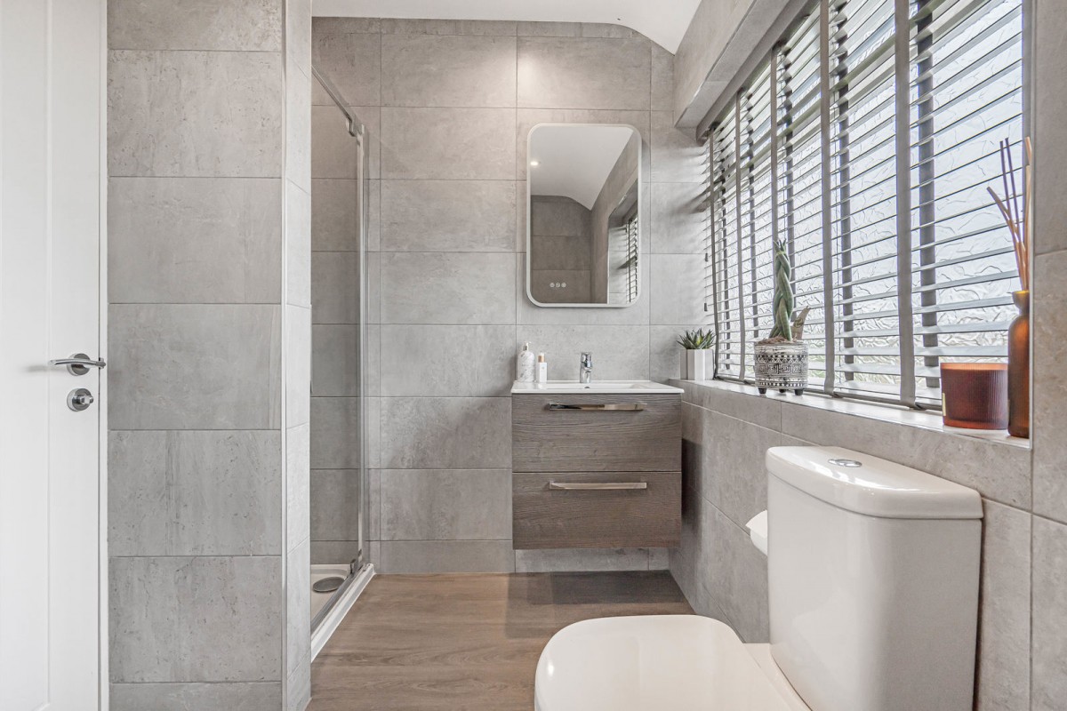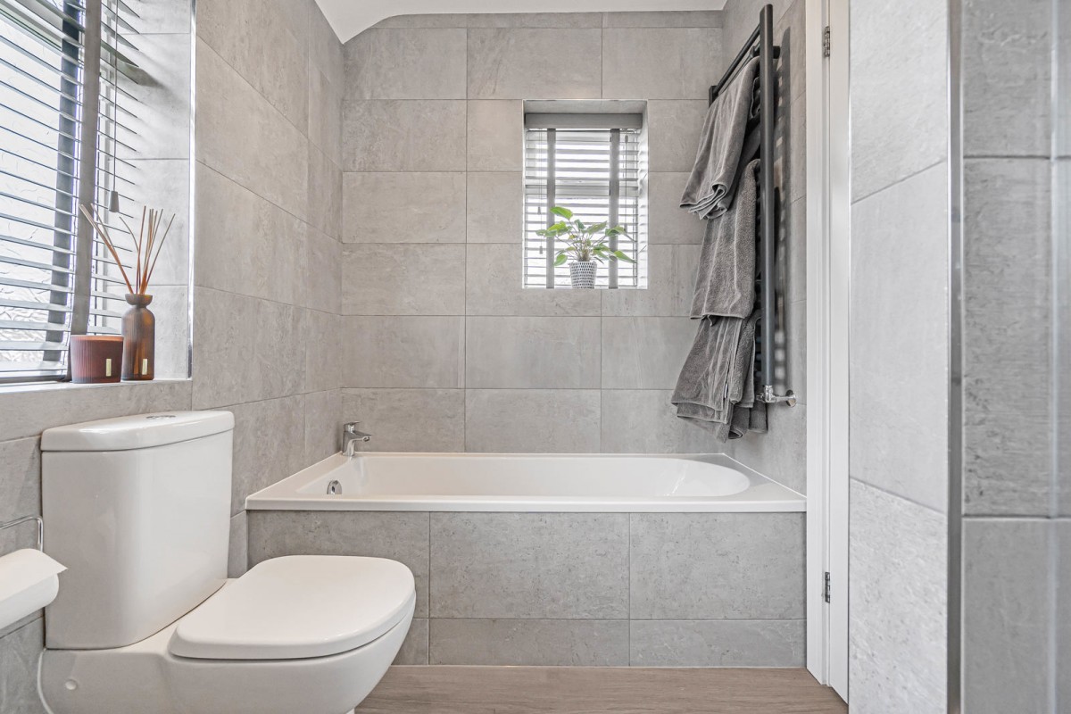 Upstairs, the property offers three well-sized bedrooms, two of which are comfortable doubles. The accommodation is completed by a modern bathroom, featuring a separate bath and shower cubicle, and a heated towel rail. Subject to the necessary planning permissions, the property also offers excellent potential to extend and create a fourth bedroom.