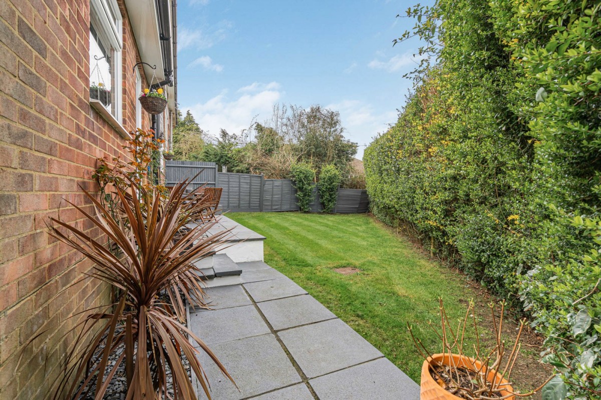Stepping out from the office, the garden begins with a patio, perfect for enjoying the westerly afternoon sun. Steps lead down to a well-maintained lawn, enclosed by mature shrubbery and panel fencing, ensuring a high degree of privacy. To the front, the property is equally well-tended, with a driveway providing parking adjacent to the garage, which also has a side personal door for rear access.