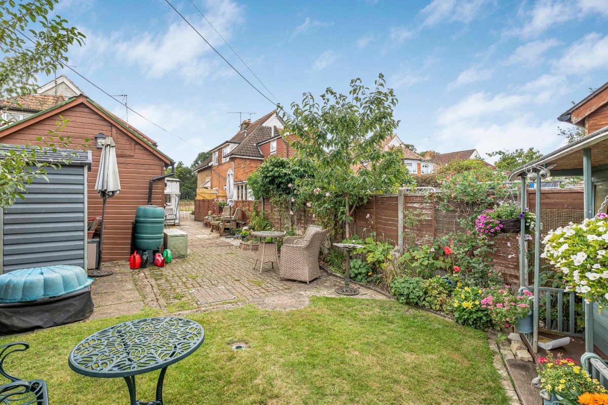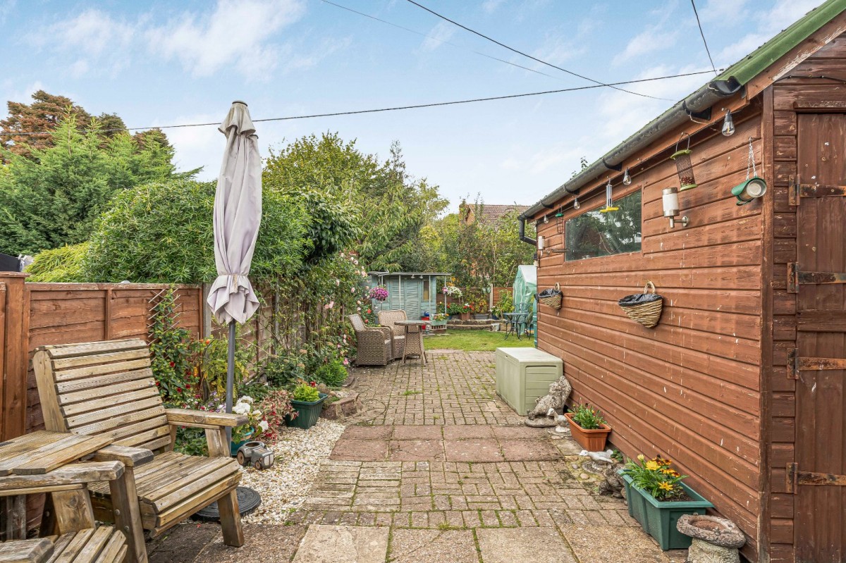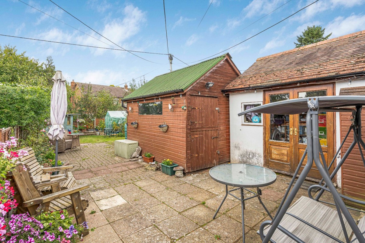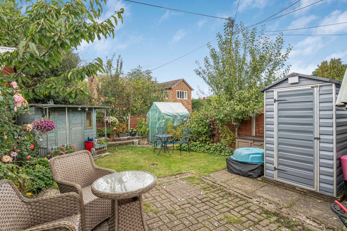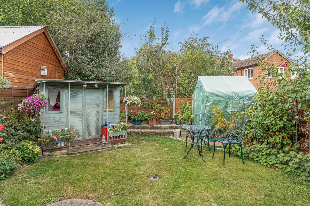 Stepping outside, the well-tended garden is initially laid to patio, creating an inviting space for outdoor dining and seating. A large workshop, together with an additional storage shed and timber garden store, provides excellent practicality. To the rear, the garden opens to a lawn bordered by colourful planting, with space for a greenhouse and further seating areas, all enclosed by mature trees and fencing that ensure both privacy and charm.