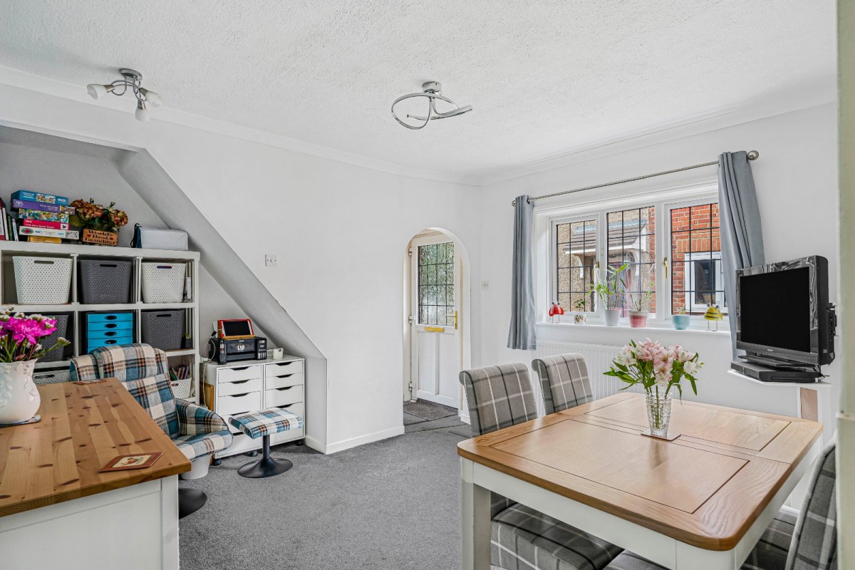 On entering the home, the bay-fronted living room lies immediately to the right, complete with feature fireplace and inset shelving. To the left, a well-sized dining room includes an under-stairs alcove offering potential as a home office area, additional storage, or a decorative feature. An arched opening leads through to the kitchen, fitted with a gas hob, extractor, dishwasher, and clean white cabinetry providing excellent storage at both surface and eye level. Completing the ground floor is a bathroom with bathtub and shower attachment, along with a practical garden room.