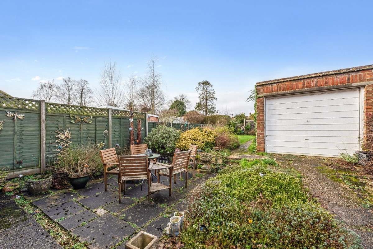 Externally, the front of the property features an enclosed lawned garden alongside a driveway that leads to the detached garage. The driveway provides space for approximately two vehicles. The rear garden is a particular feature of the home, offering a patio area with steps rising to a lawn, complemented by a variety of inset plants, bushes and shrubs.
