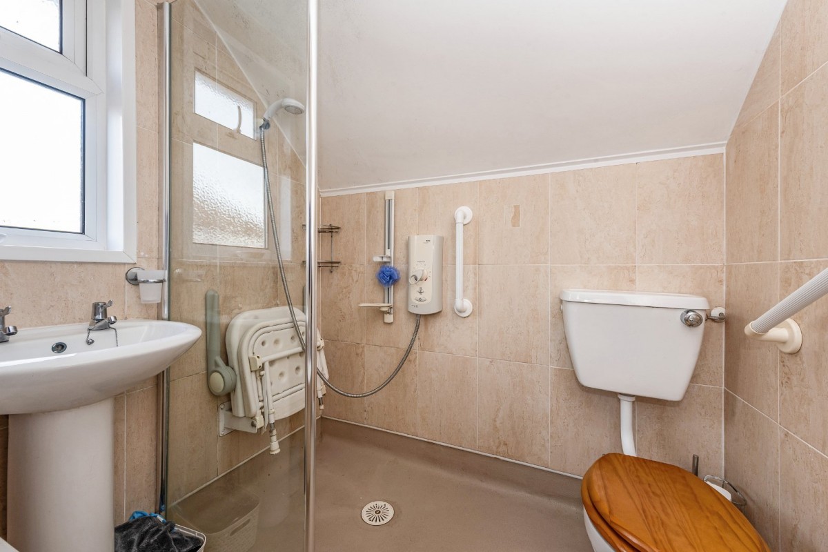 To the first floor are the three bedrooms. Two are double rooms, with the second bedroom enjoying a view over the rear garden. The third bedroom is a well proportioned single. The shower room is fully tiled and comprises a shower, WC, washbasin and a wall mounted heater.