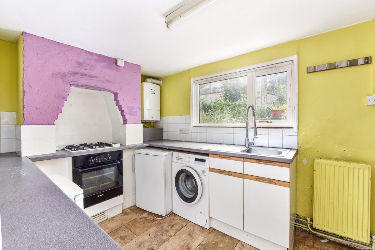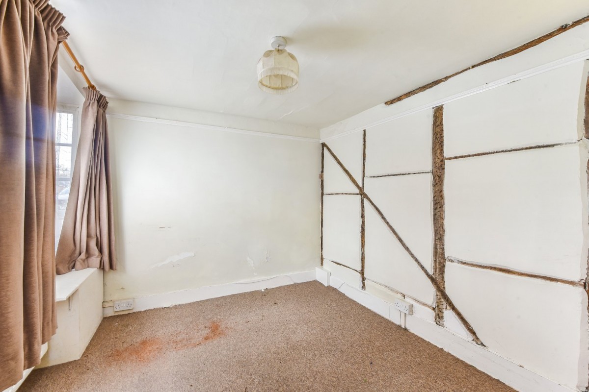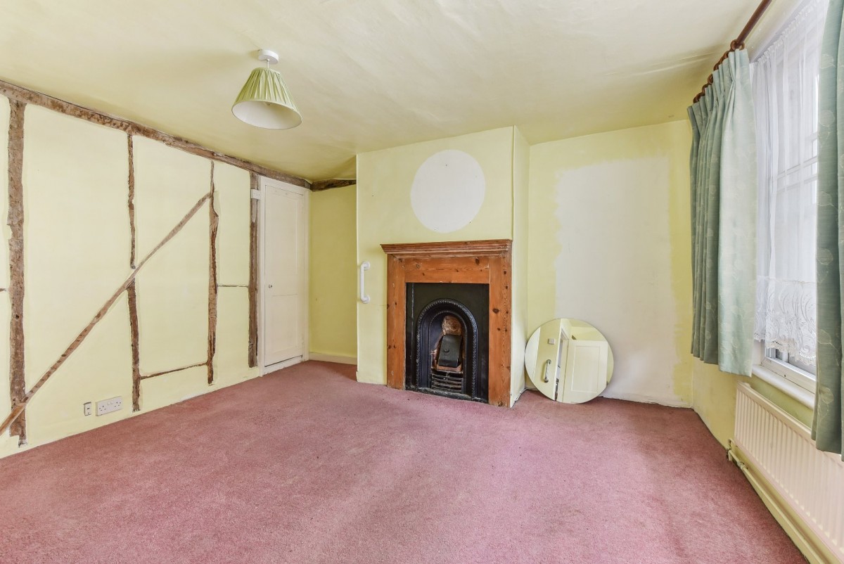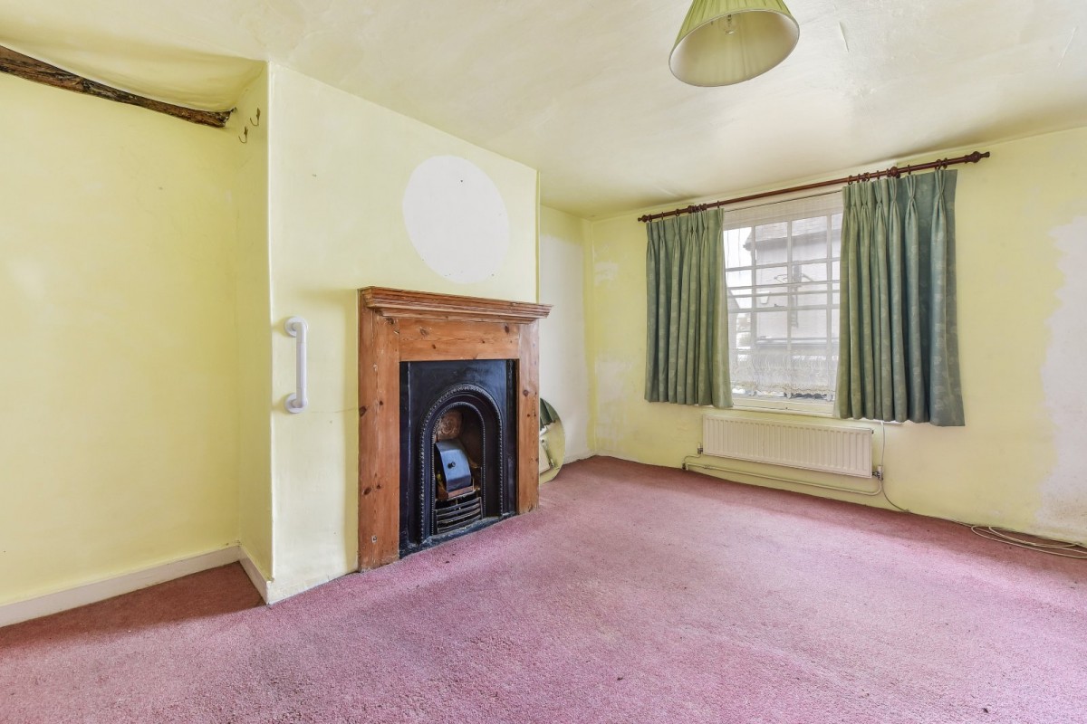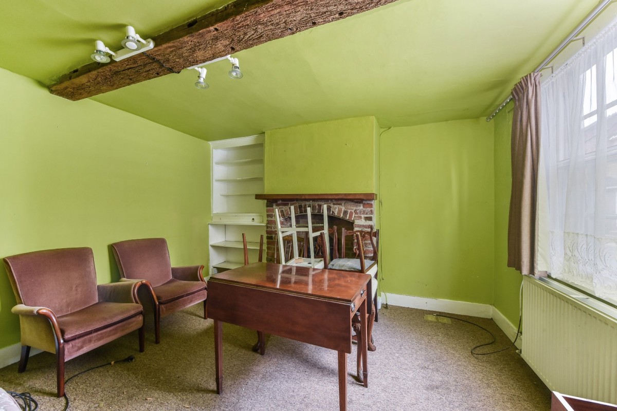 On entering through the front door, you step directly into the dining room, which features an exposed timber-framed wall and leads through to both the living room and kitchen. The living room, set to the front, boasts a feature fireplace, while the kitchen at the rear is fitted with a basic range of units, an integrated oven and hob, space for additional appliances, and a wall-mounted gas boiler. From the rear lobby, you’ll find access to the staircase, a ground-floor bathroom, and the door to the outside.