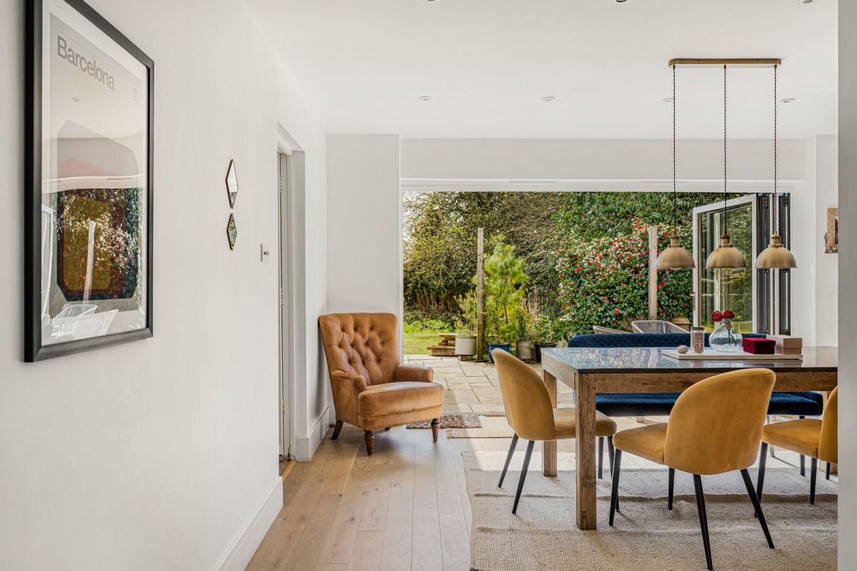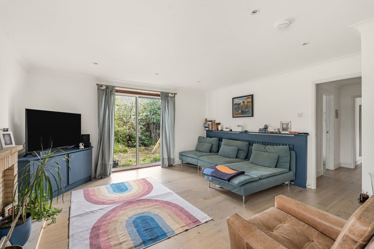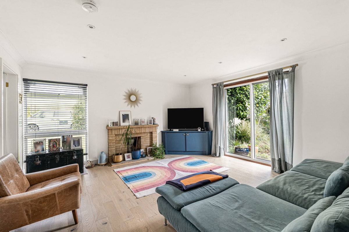 The main living room offers a more relaxed retreat, featuring a central fireplace, dual aspect and patio doors opening onto the side garden, providing additional space for entertaining or quiet relaxation.