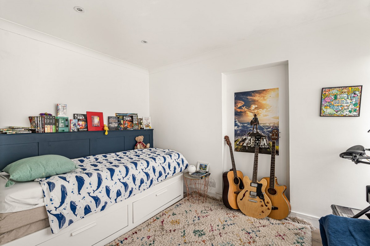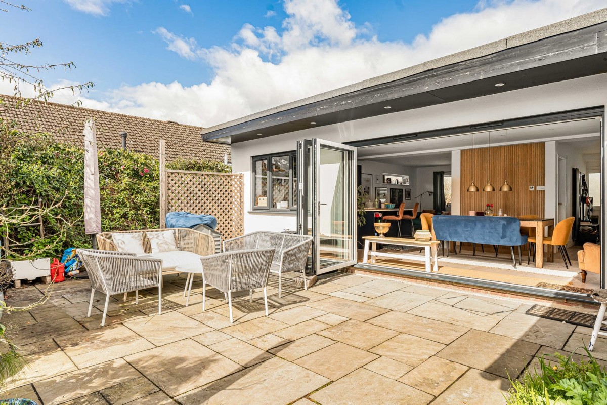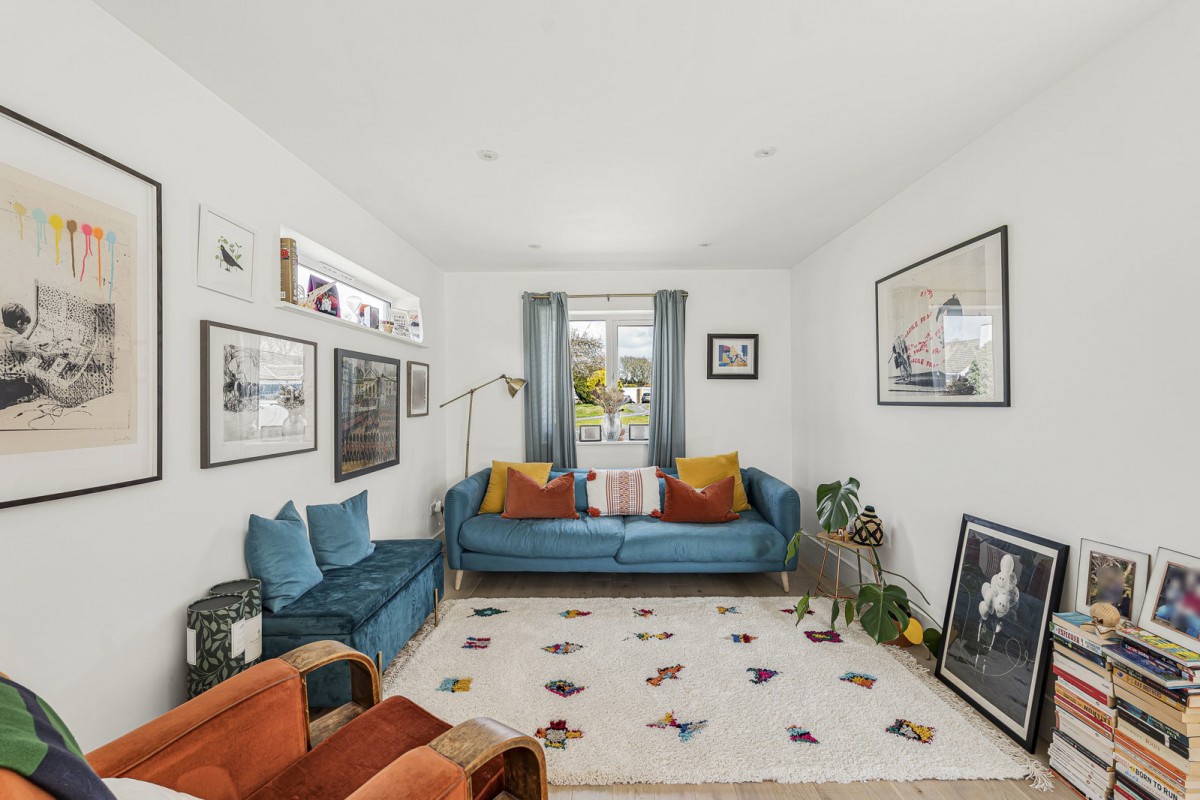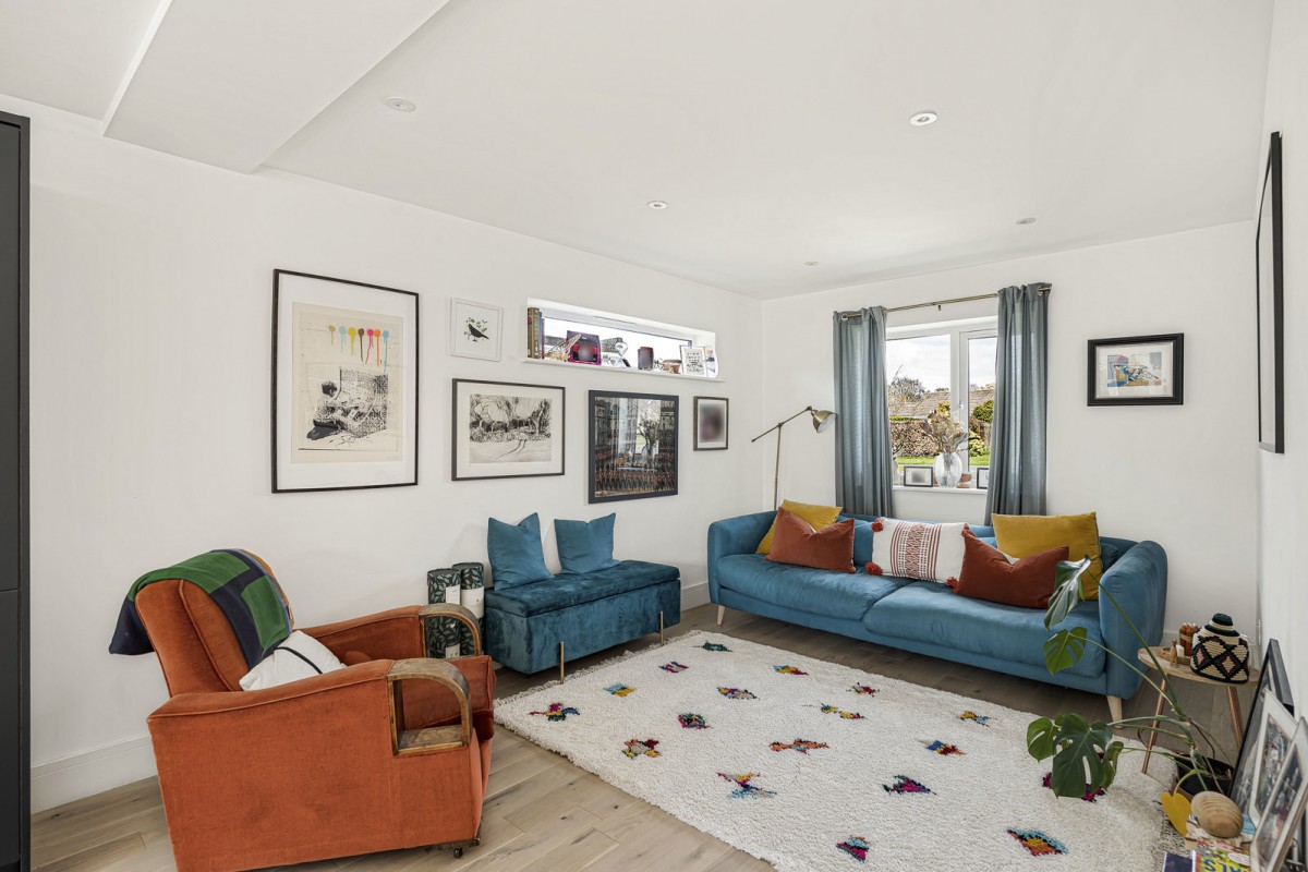 The main living room offers a more relaxed retreat, featuring a central fireplace, dual aspect and patio doors opening onto the side garden, providing additional space for entertaining or quiet relaxation.
