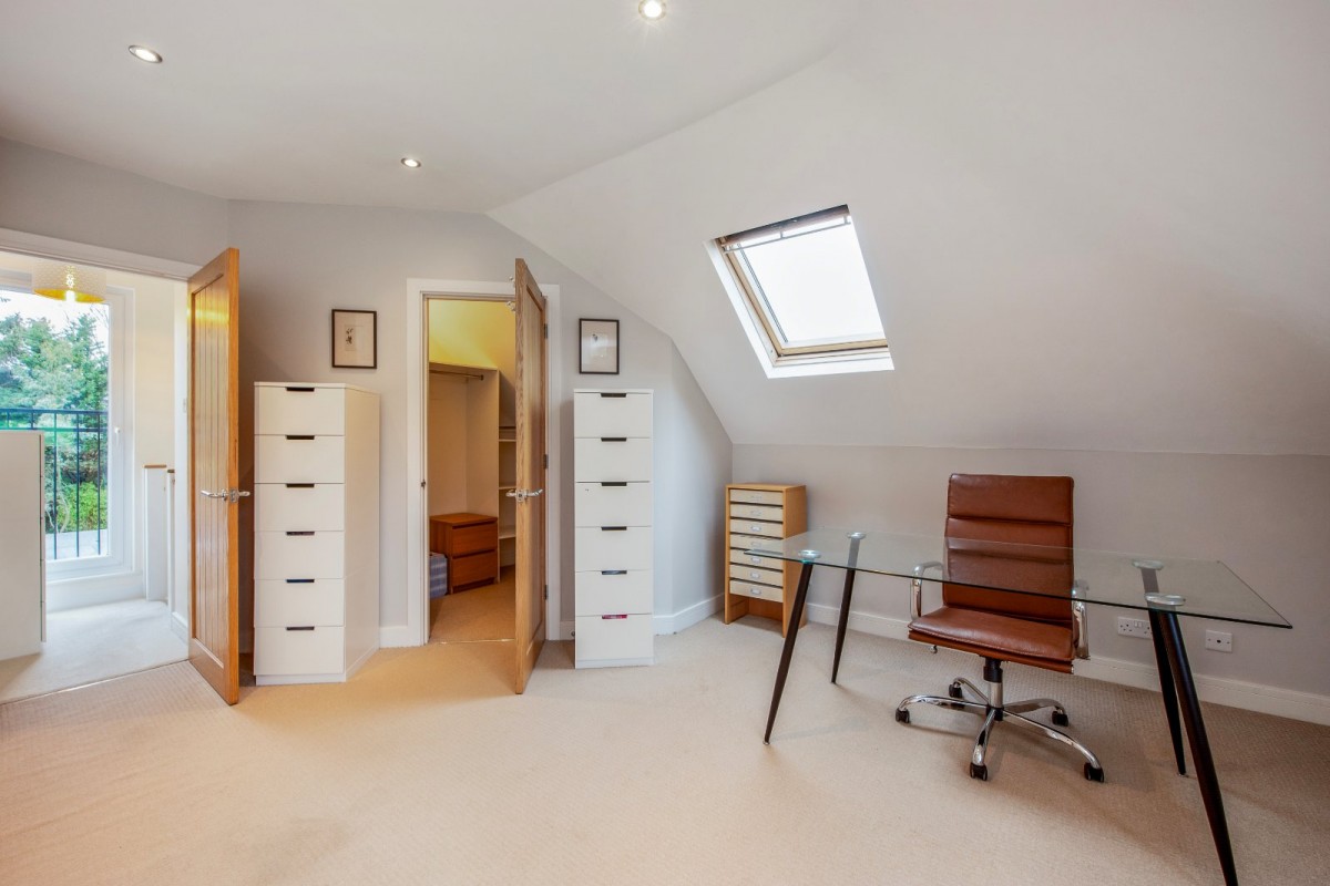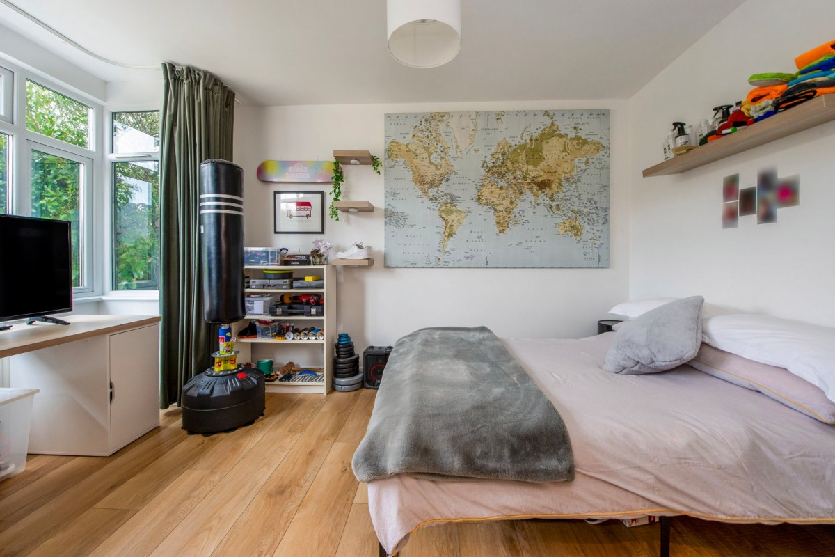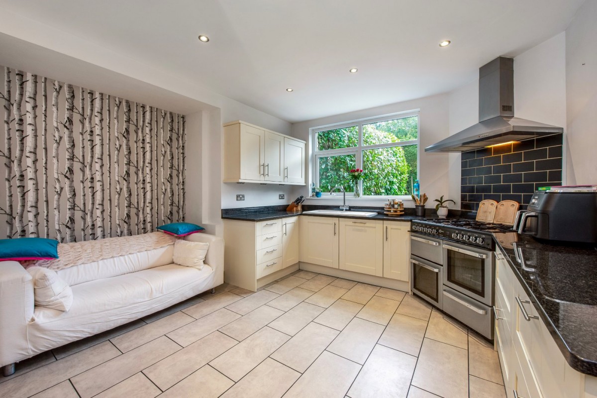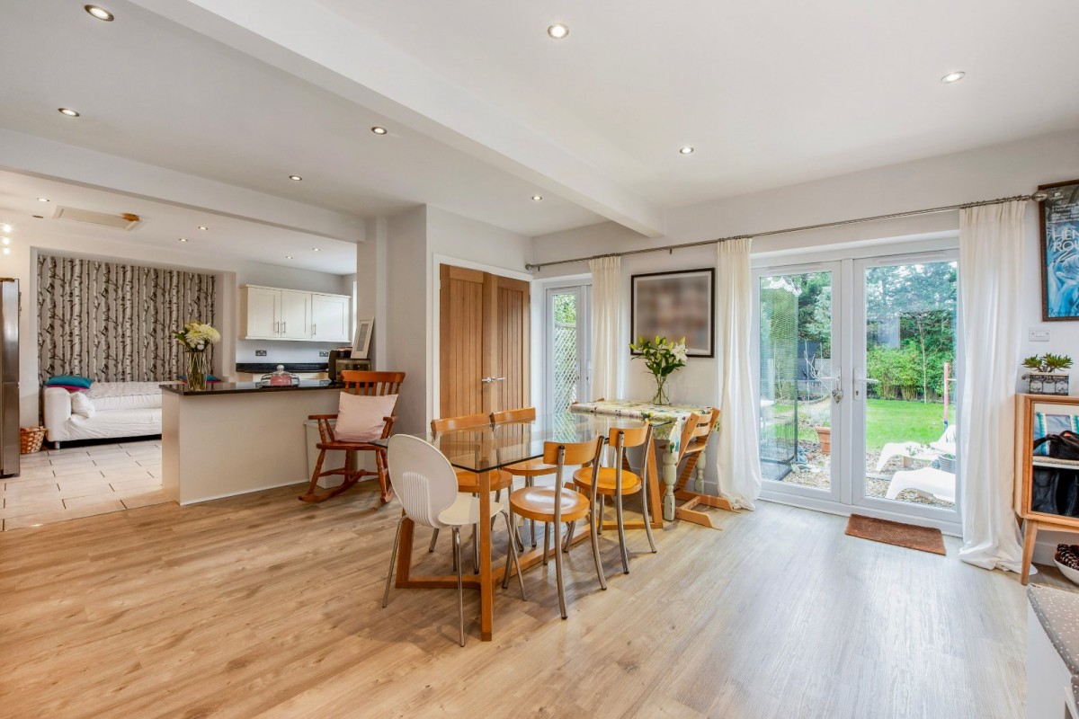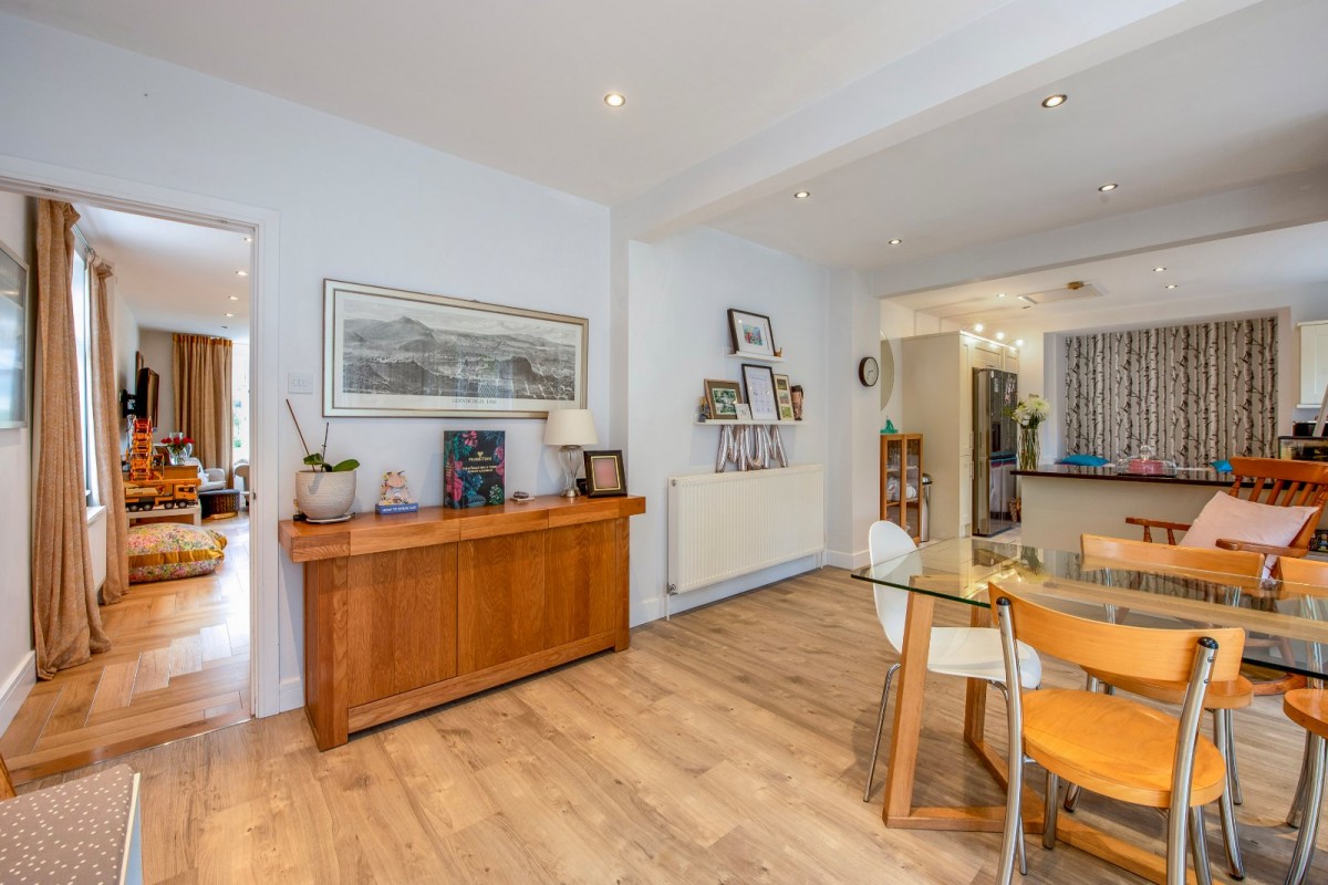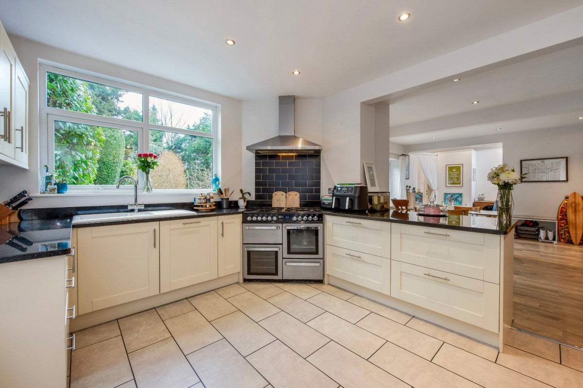 The ground floor features a fabulous bay-fronted living room with stairs rising to the first floor, along with an excellent open-plan kitchen, dining and family space to the rear, with doors opening directly onto the garden. The kitchen is fitted with modern, high-quality units incorporating granite worktops, space for a range-style cooker and a peninsula breakfast bar, all of which enhance the sense of quality and practicality. Also on the ground floor are three well-proportioned bedrooms, including a guest suite that benefits from a shower room, together with a further contemporary family bathroom serving the remaining bedrooms. To the first floor is an impressive principal bedroom, complete with a walk-in wardrobe and an en-suite bathroom featuring both a bath and a separate shower.