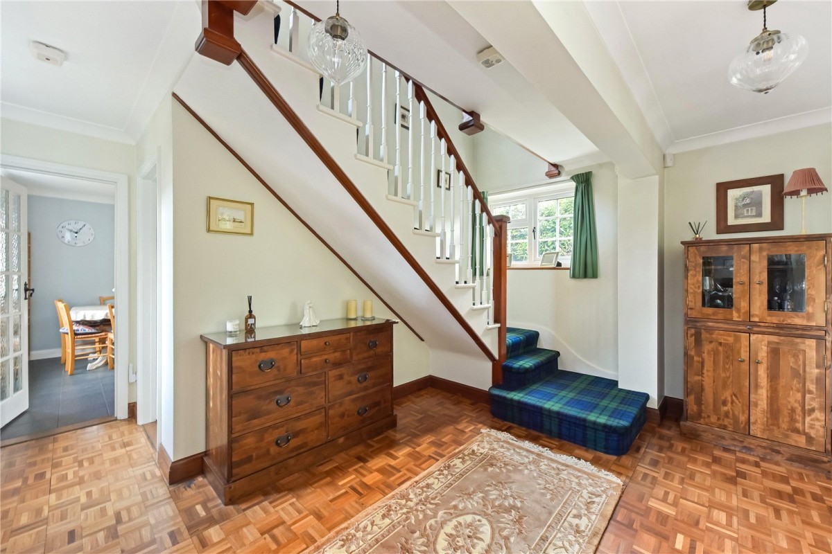A private gravel driveway leads up to the property, offering generous parking to the front and side, with two additional private spaces in North Lane to the south. A neat gravel courtyard sets a pleasant approach to the house and leads to a covered porch and the entrance hall, where parquet flooring and the staircase create a warm and well-balanced first impression. A cloakroom with hand basin and WC sits conveniently off the hall.