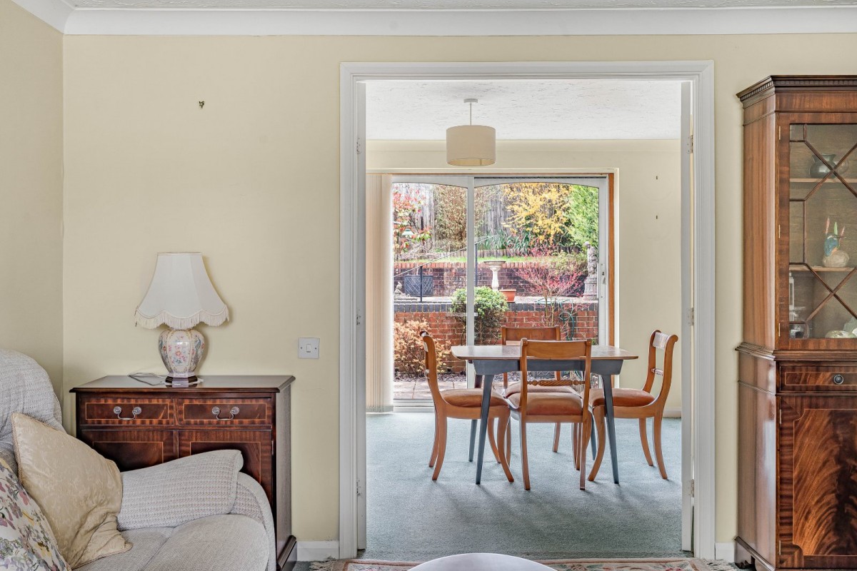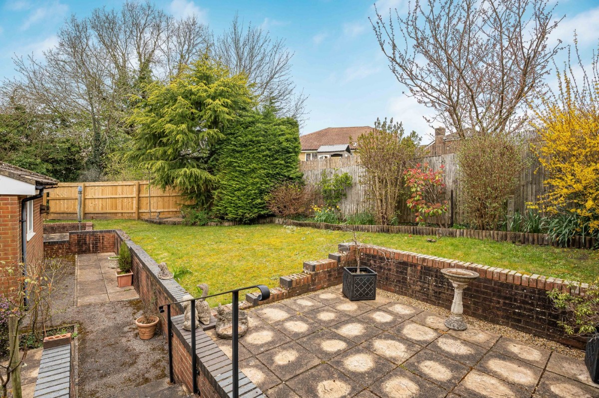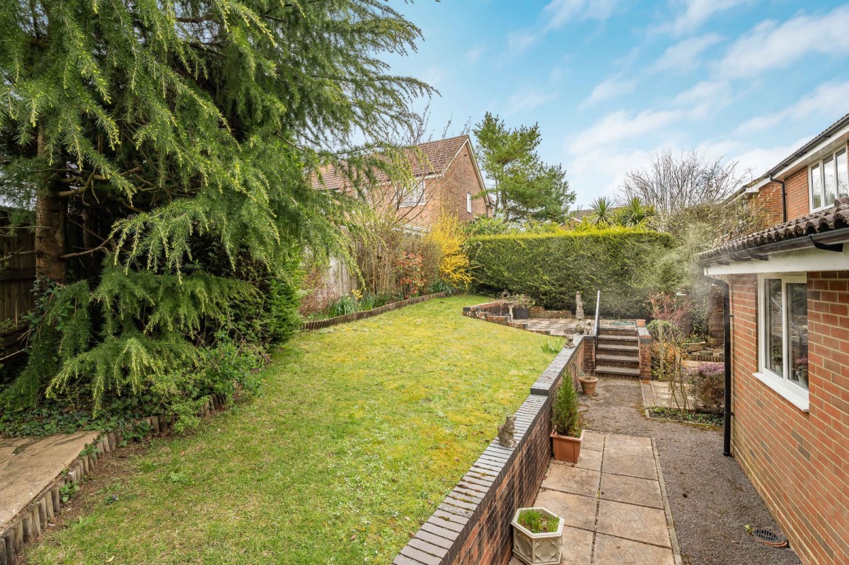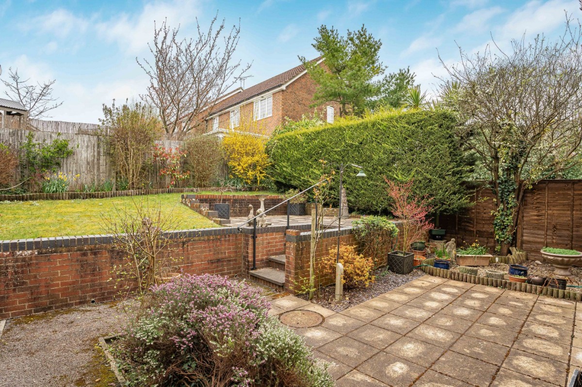 Externally, the property occupies a desirable corner plot, providing ample off-road parking and access to a tandem garage. The rear garden is beautifully maintained and thoughtfully arranged, featuring a large patio area ideal for outdoor dining, with steps leading up to a further seating area. Beyond this, the garden is mainly laid to lawn, bordered by mature shrubs and enclosed by wooden fencing, creating a private and attractive outdoor space.