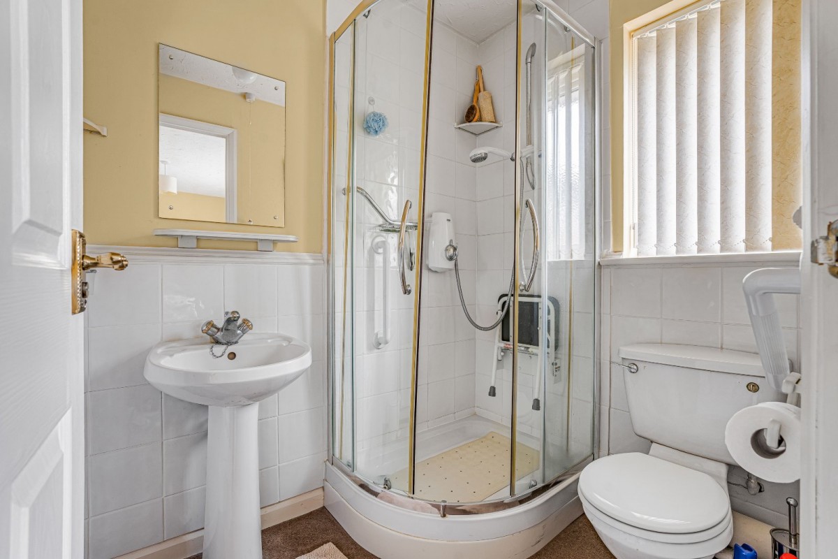 Upstairs, the first floor offers four well-proportioned bedrooms, all benefiting from fitted wardrobes. The principal bedroom enjoys its own en-suite shower room, while the second bedroom also features an en-suite. The remaining two bedrooms are served by a family bathroom, offering convenience for growing families.