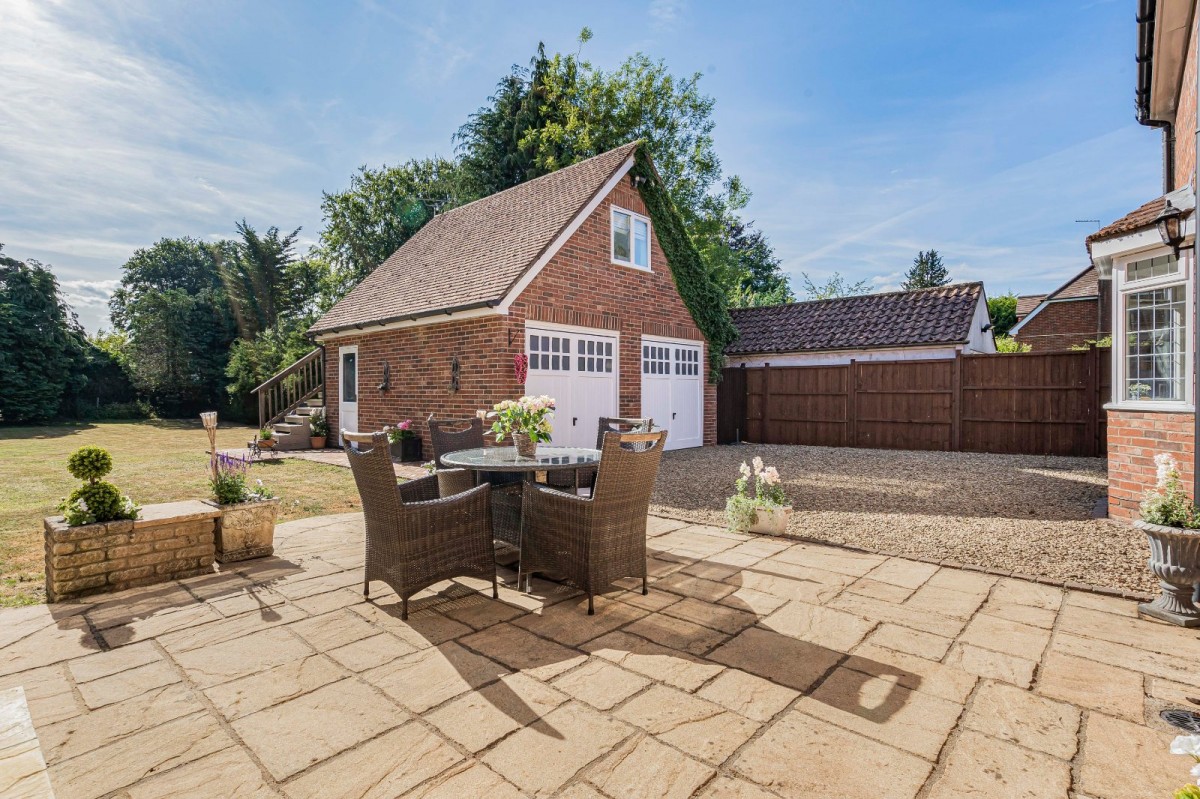Externally, the home sits on a well-maintained one third acre plot. To the rear, a large, paved patio area extends from the house - perfect for summer dining and entertaining. The block-paved driveway provides ample parking and leads to a detached double garage, which also features a first-floor office — perfect for remote working or hobbies.