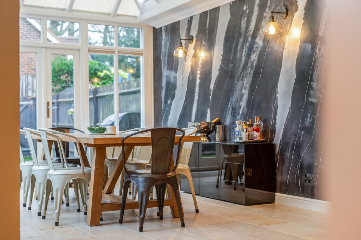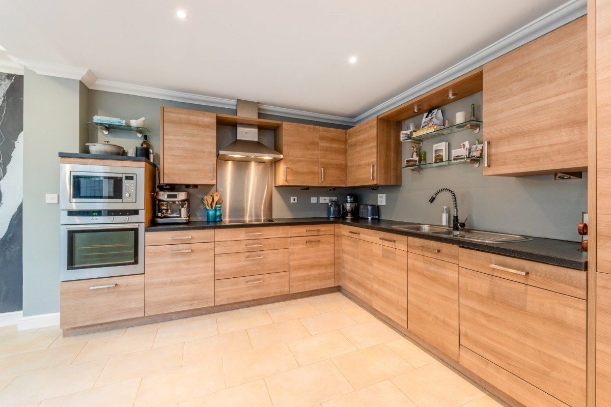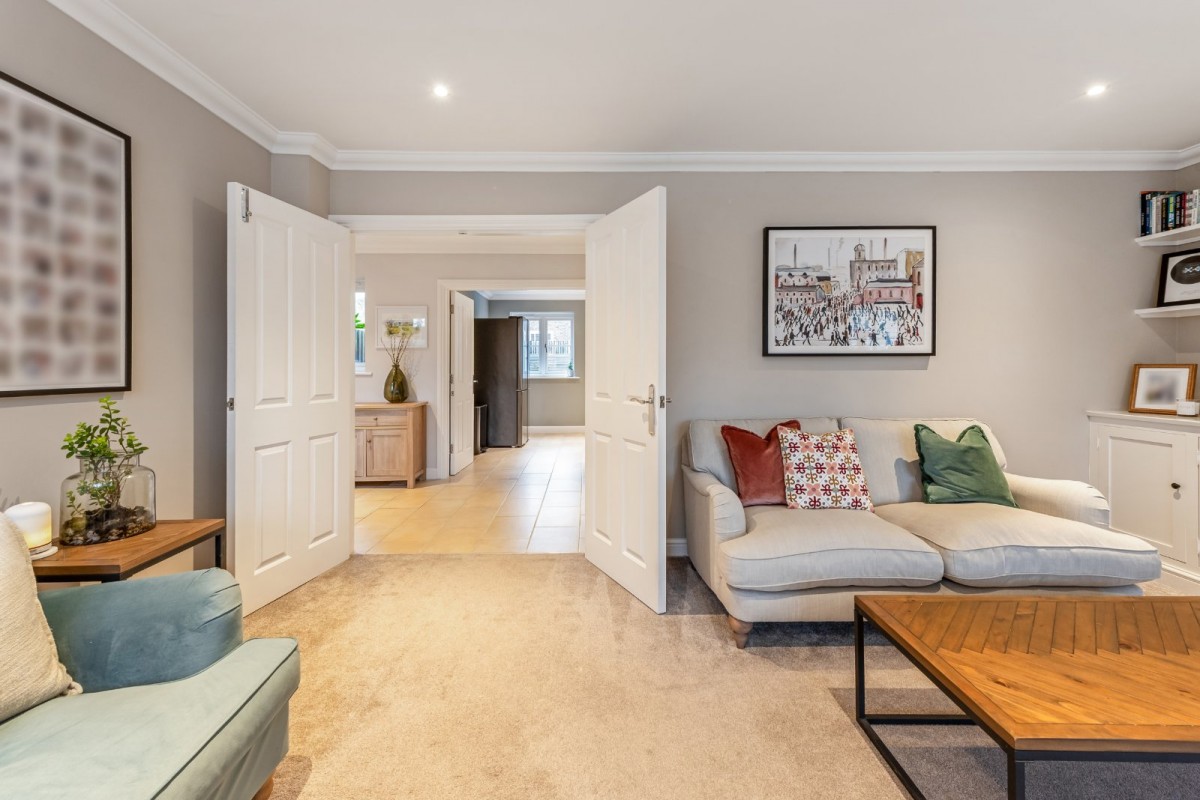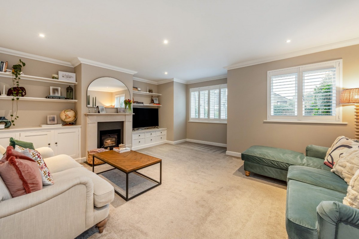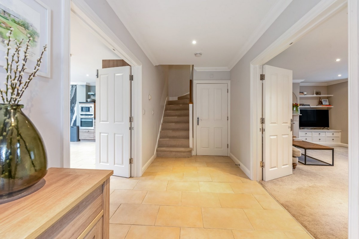 Constructed in 2006 to an exceptional specification, the property is flooded with natural light and immediately impresses with its sense of space and quality upon entering. The thoughtfully designed ground floor provides a practical yet stylish layout, featuring a generous front-facing living room complete with a log burner, creating a warm and welcoming atmosphere. To the rear, a stunning open-plan ‘L’-shaped family kitchen and conservatory forms the heart of the home, seamlessly opening onto the garden and providing an ideal space for modern family living and entertaining. A downstairs WC and the added comfort of underfloor heating throughout the ground floor further enhance the appeal.