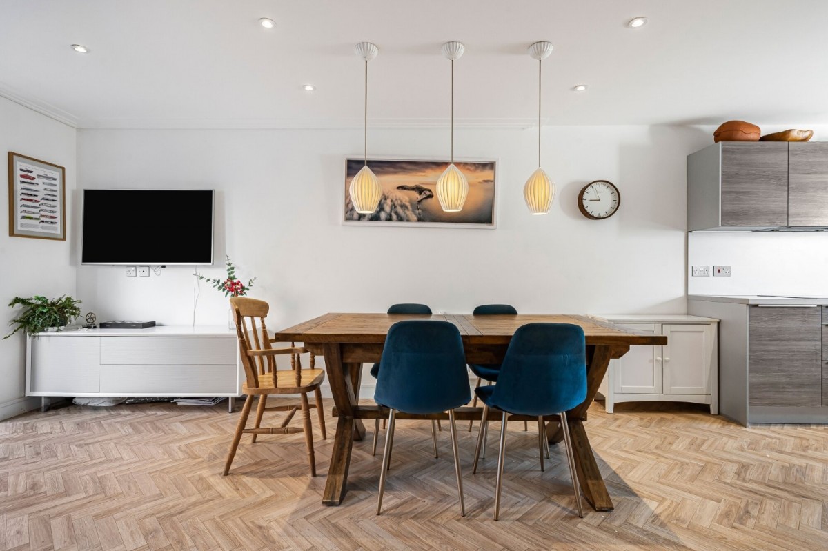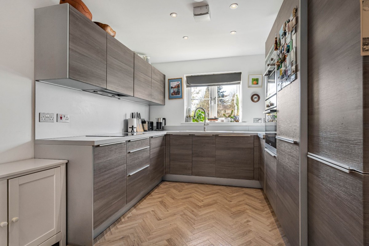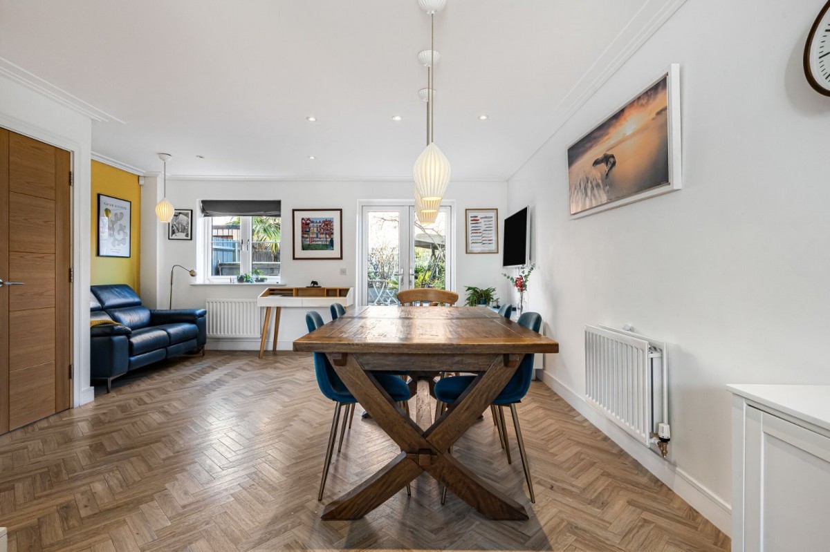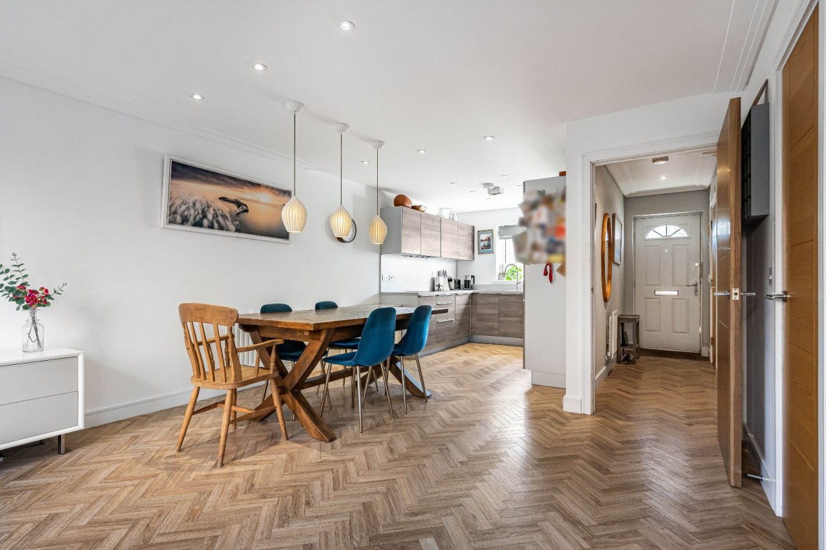 Upon entering, the ground floor opens into a welcoming hallway with attractive herringbone flooring, leading through to a bright and sociable open-plan living space. The kitchen is well equipped with a modern range of wall, floor and drawer units, complemented by work surfaces and integrated appliances, including an induction hob with extractor, combination microwave oven, tall fridge/freezer and dishwasher. There is ample space for dining, creating an ideal environment for both everyday living and entertaining, with patio doors opening out to the garden. The ground floor is completed by useful understairs storage and a cloakroom.