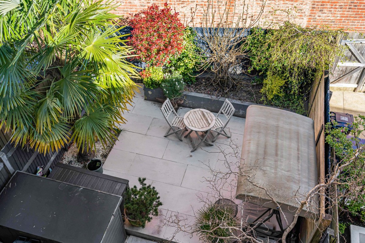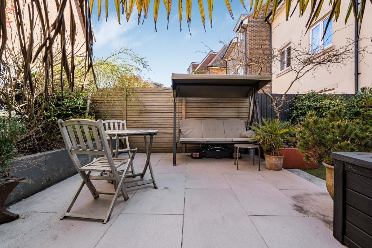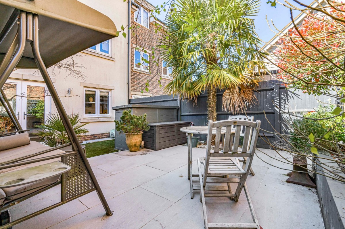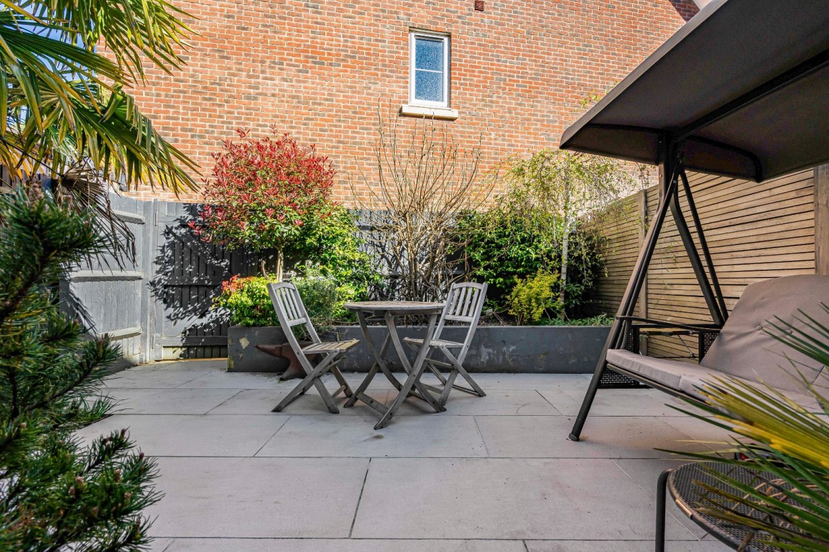 Externally, the garden is designed for low maintenance, laid predominantly to patio and offering ample space for outdoor furniture, ideal for al fresco dining and enjoying the warmer months. Raised beds with a variety of planting, along with a feature palm tree, add interest and colour. To the front, the property benefits from two allocated parking spaces, with additional visitor parking available within the development.