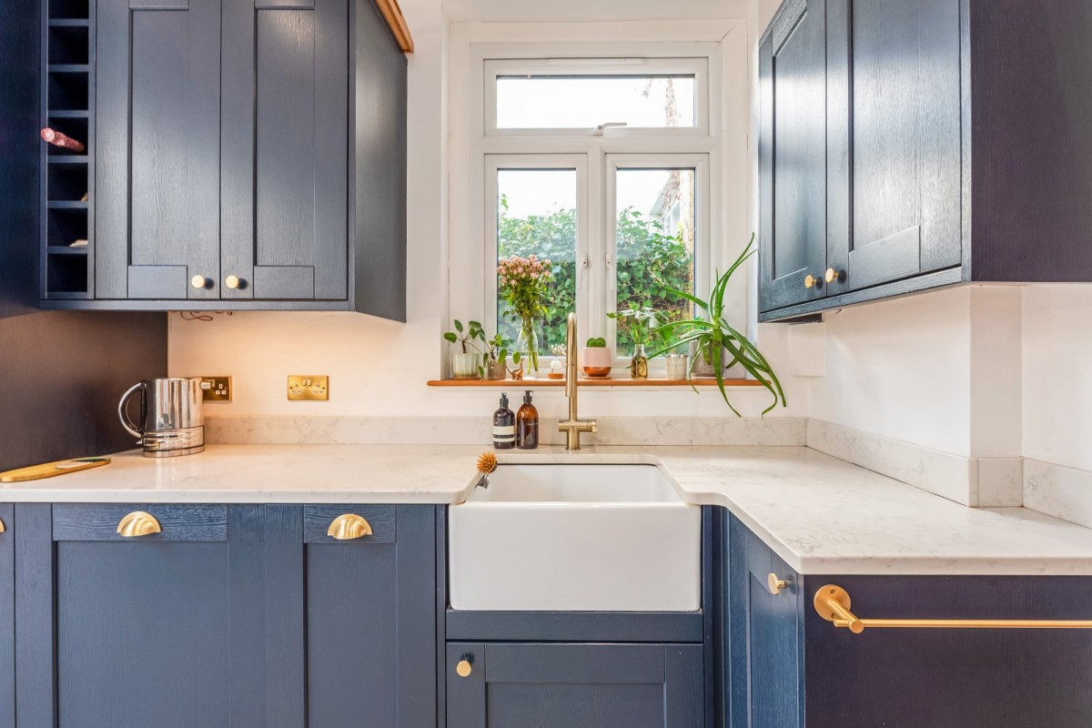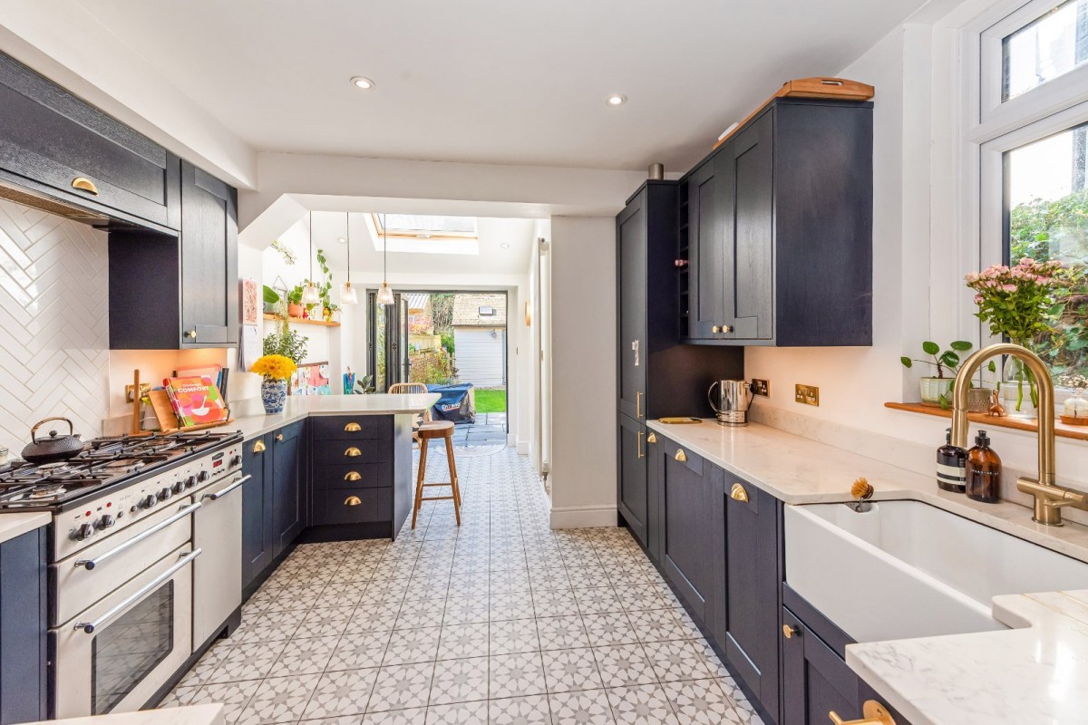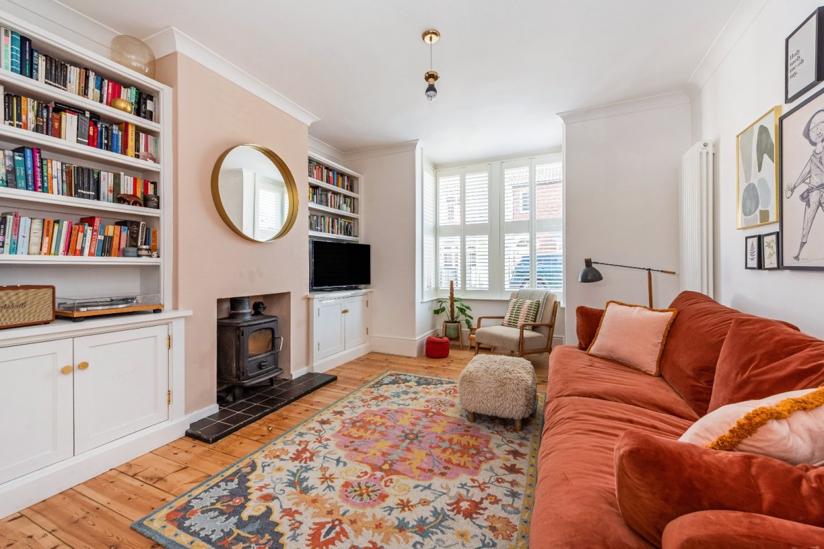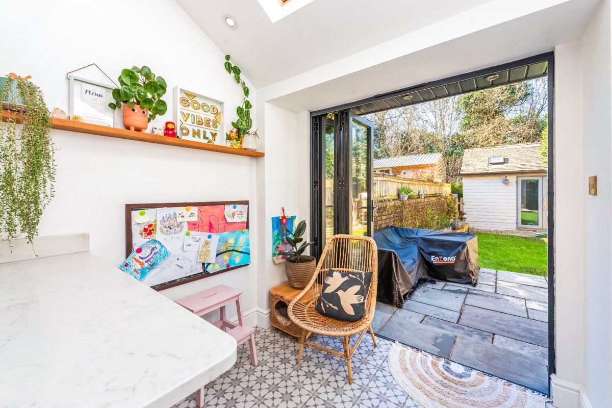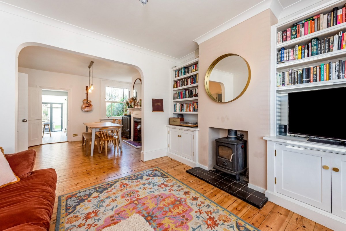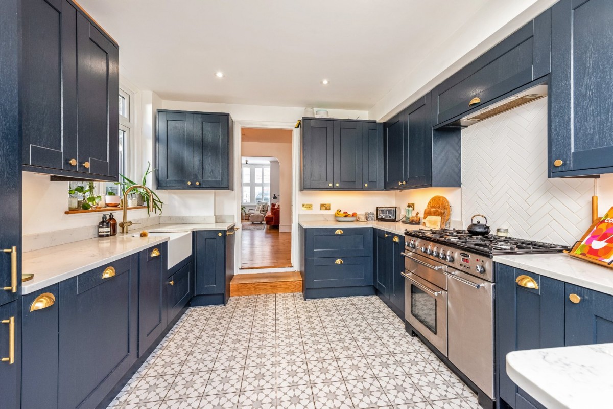 The entrance hall features stripped wood flooring and leads into a dining room with wood floors and a feature fireplace. An archway opens into the lounge, a light and inviting space with bay window, shutters, solid fuel stove and built-in shelving. The contemporary kitchen offers striking blue cabinetry, marble worktops, a breakfast bar, integrated appliances and space for a range style cooker. Bi-fold doors open directly onto the garden. A cloak/utility room with WC sits just off the breakfast area.