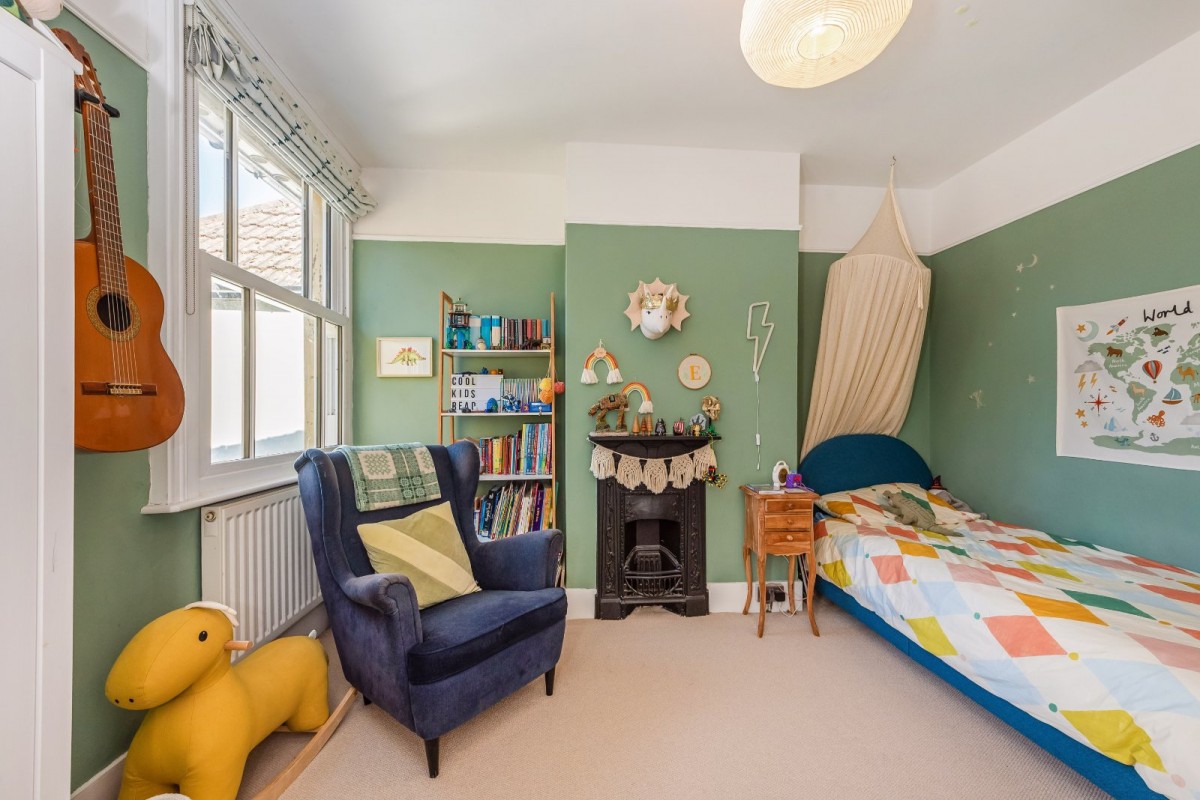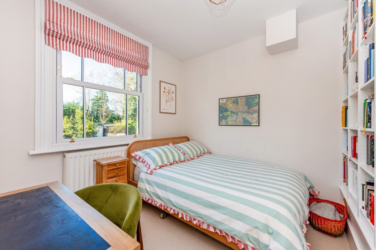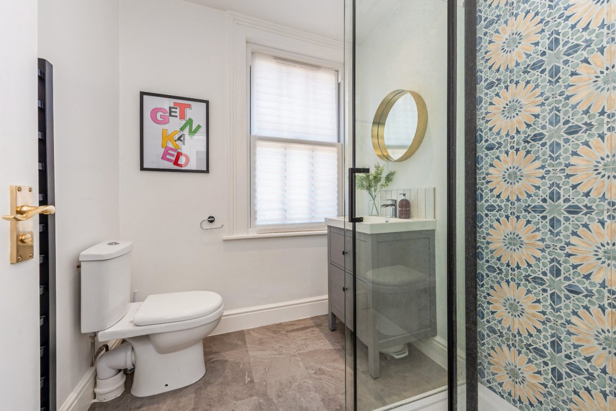 On the first floor are three bedrooms and a modern shower room, with stairs leading to the top floor principal bedroom, which includes an en suite bathroom, eaves storage and three skylight windows.