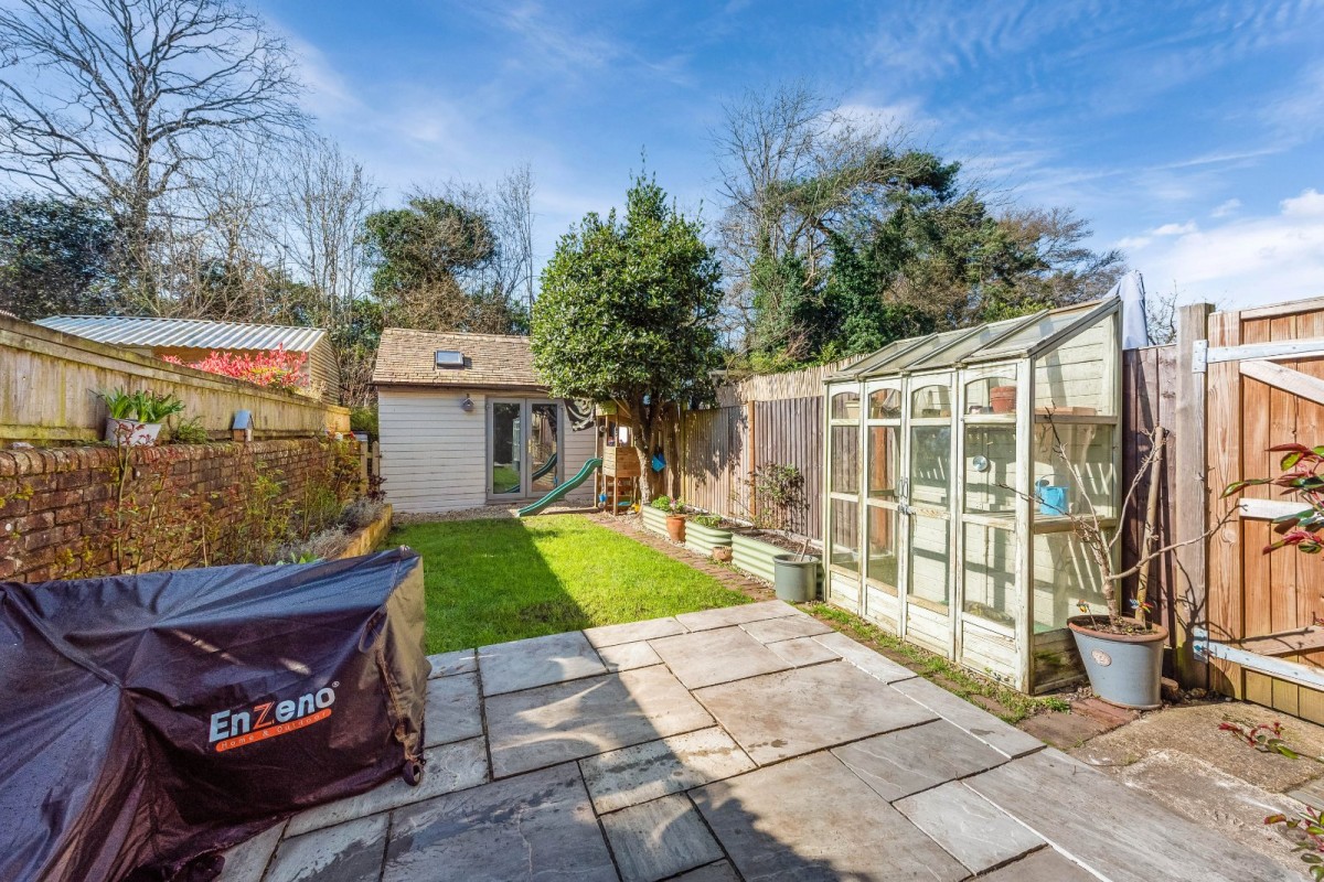 Outside, the rear garden features a patio, lawn, flower/shrub beds and a brick pathway leading to a substantial outbuilding—ideal as a home office or playroom, complete with mezzanine and rear access to additional land belonging to the property. There is a right of access across the neighbouring property to a passageway for transit of bins etc.