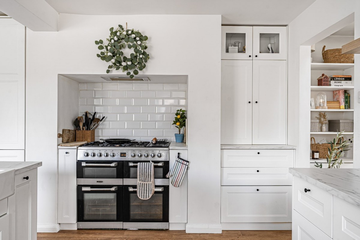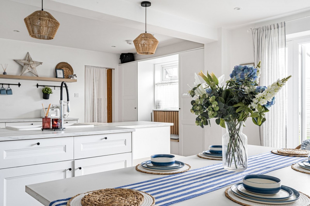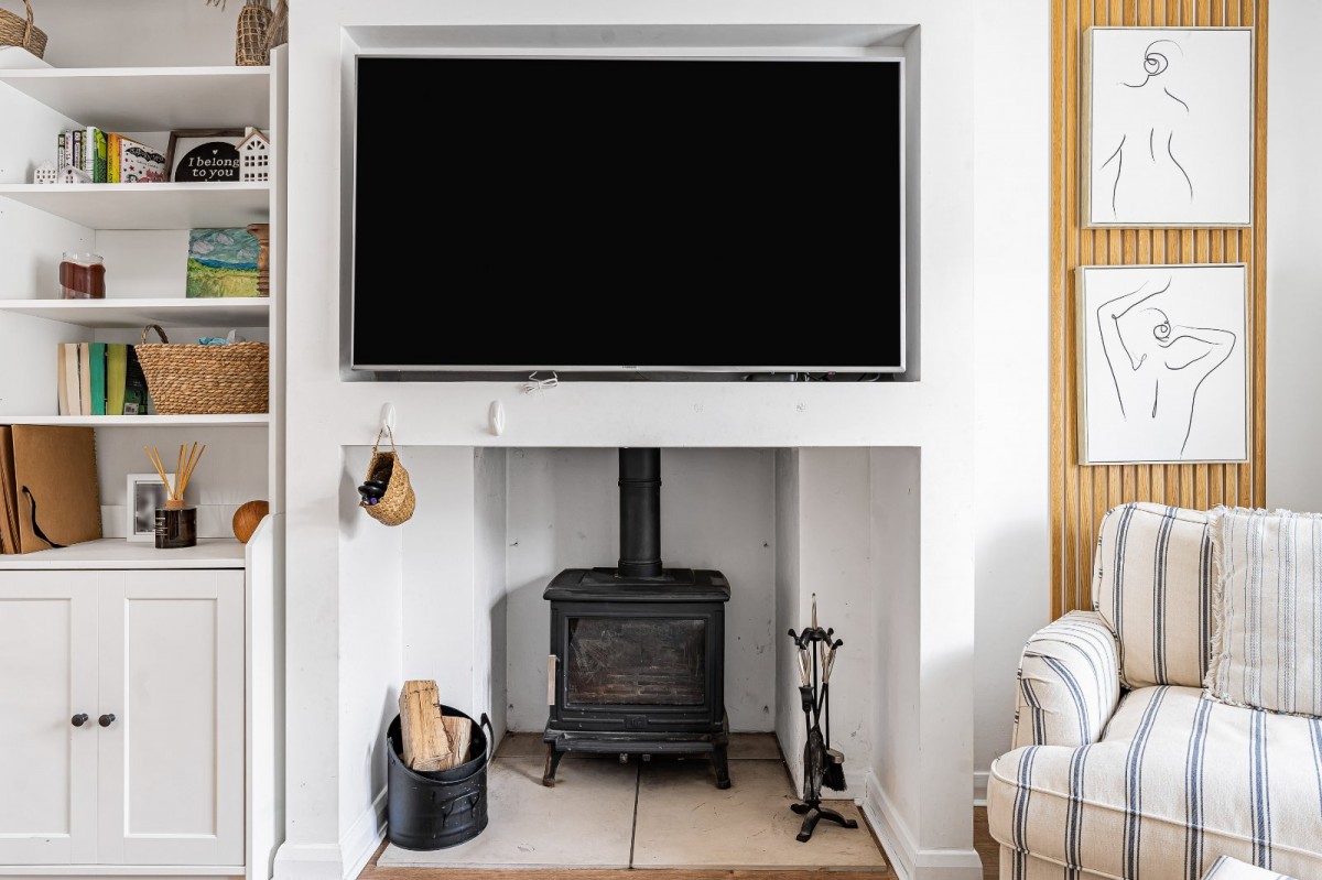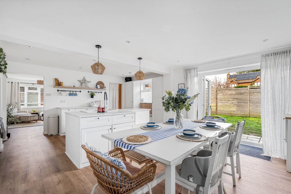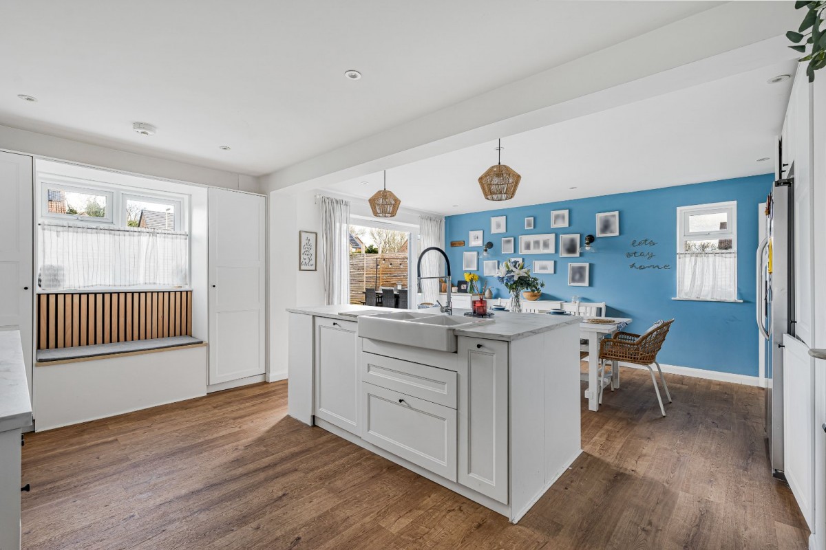 At the heart of the home is a stunning open-plan kitchen, dining and family space — a true hub of the house — offering a contemporary yet welcoming environment, perfect for both everyday living and entertaining. This impressive space flows seamlessly into a charming living area, where a log-burning stove provides a cosy focal point, combining character with modern comfort.
