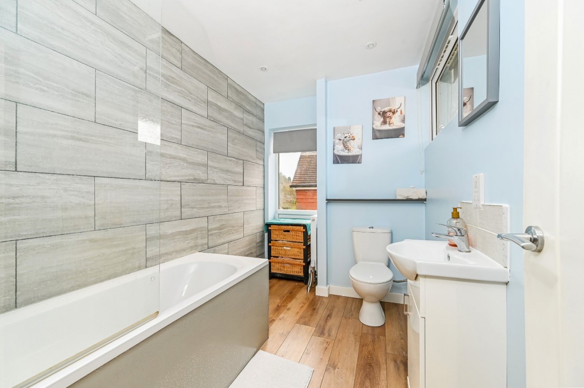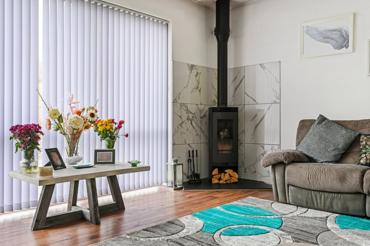 The heart of the home is a contemporary split-level living area featuring a stylish lounge with a standalone solid fuel-burning stove, dining space and a modern kitchen equipped with ample storage, wood-effect work surfaces, a breakfast bar and integrated appliances, with space for a fridge-freezer and dishwasher. A separate utility room provides plumbing for a washing machine, while an inner hallway from the dining area leads to bedrooms two and three, both doubles with bedroom two enjoying an en-suite bathroom.